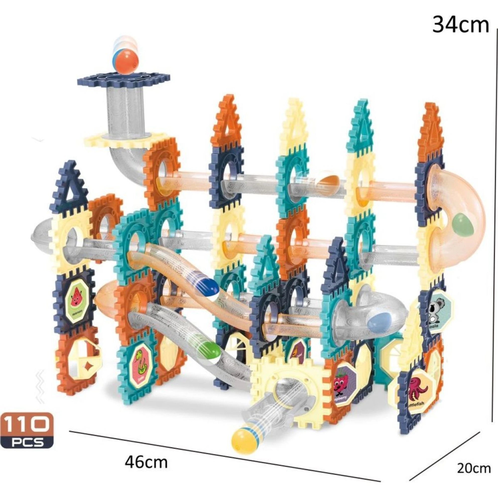Sada různě tvarovaných dílků, ze kterých si děti postaví kuličkovou dráhu – a zábava se rozkutálí raz dva.