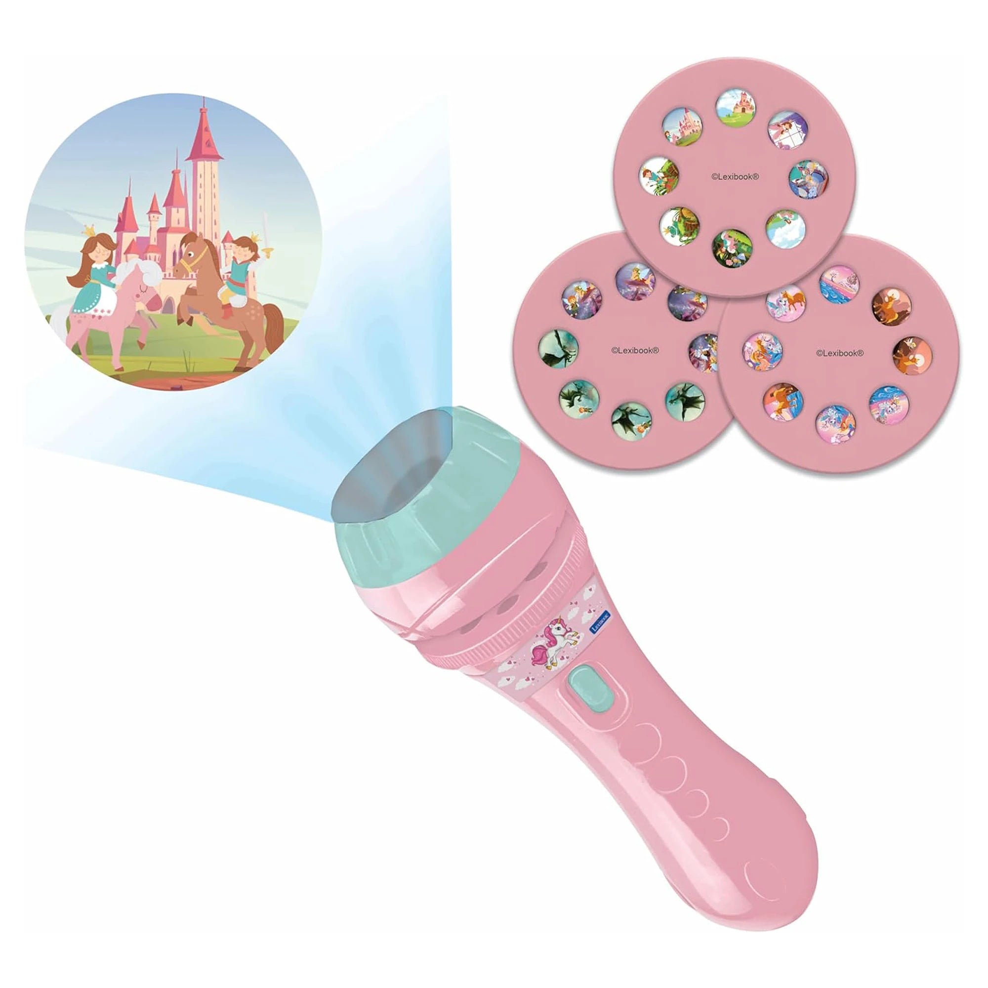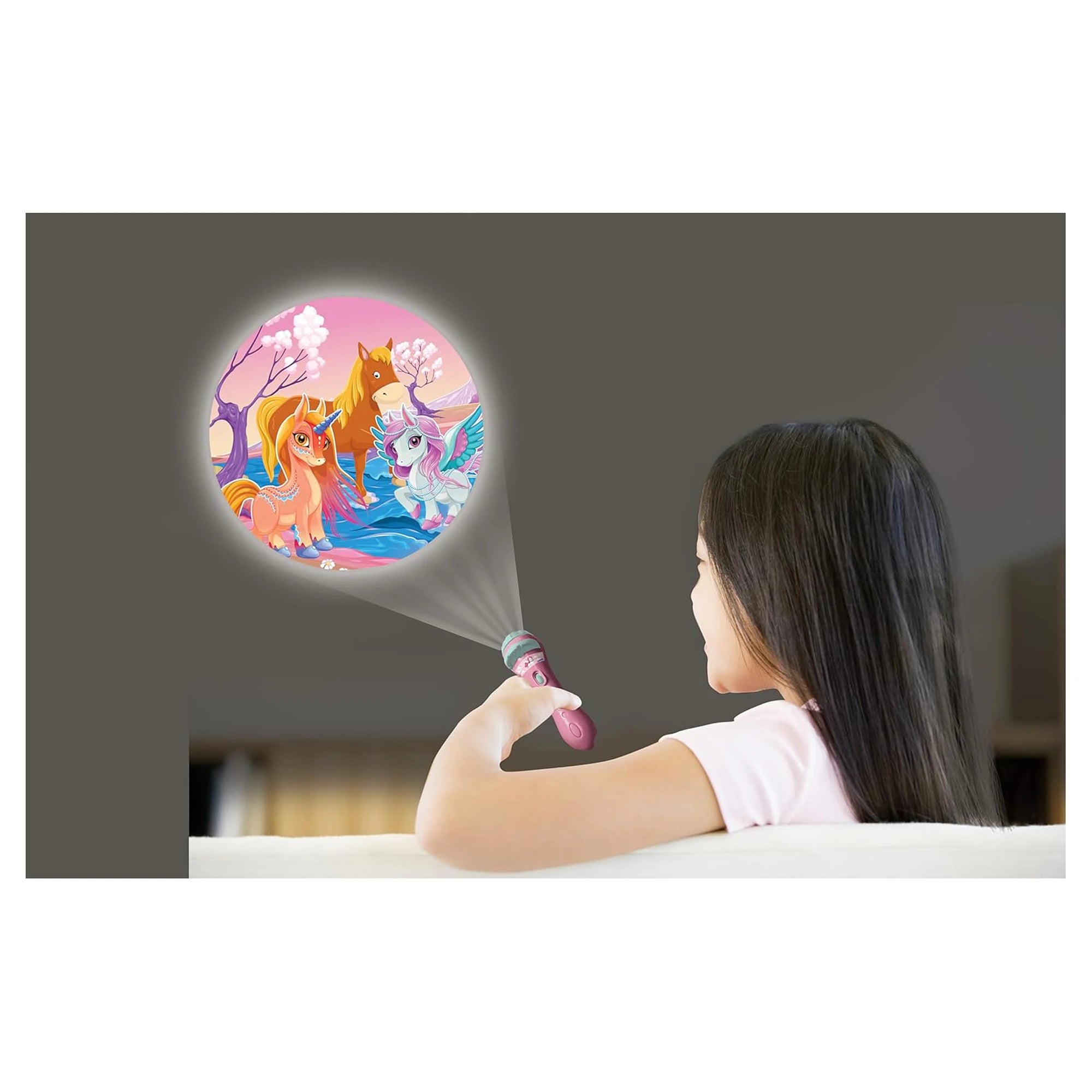 Se 24 obrázky na třech discích ožívají příběhy oblíbených hrdinů přímo v dětském pokoji. Vložte vždy jeden disk do přihrádky a jemným otáčením měňte snímky. Obrázky na sebe chytře navazují, takže si z nich snadno poskládáte vlastní scénáře. Promítejte ve tmě na zeď nebo strop a proměňte pokoj v malé divadlo. Tento projektor 2 v 1 po vyjmutí disku funguje jako praktická baterka s jemným bílým LED světlem – ideální na noční výpravu do koupelny i pátrání po zatoulaném plyšákovi.