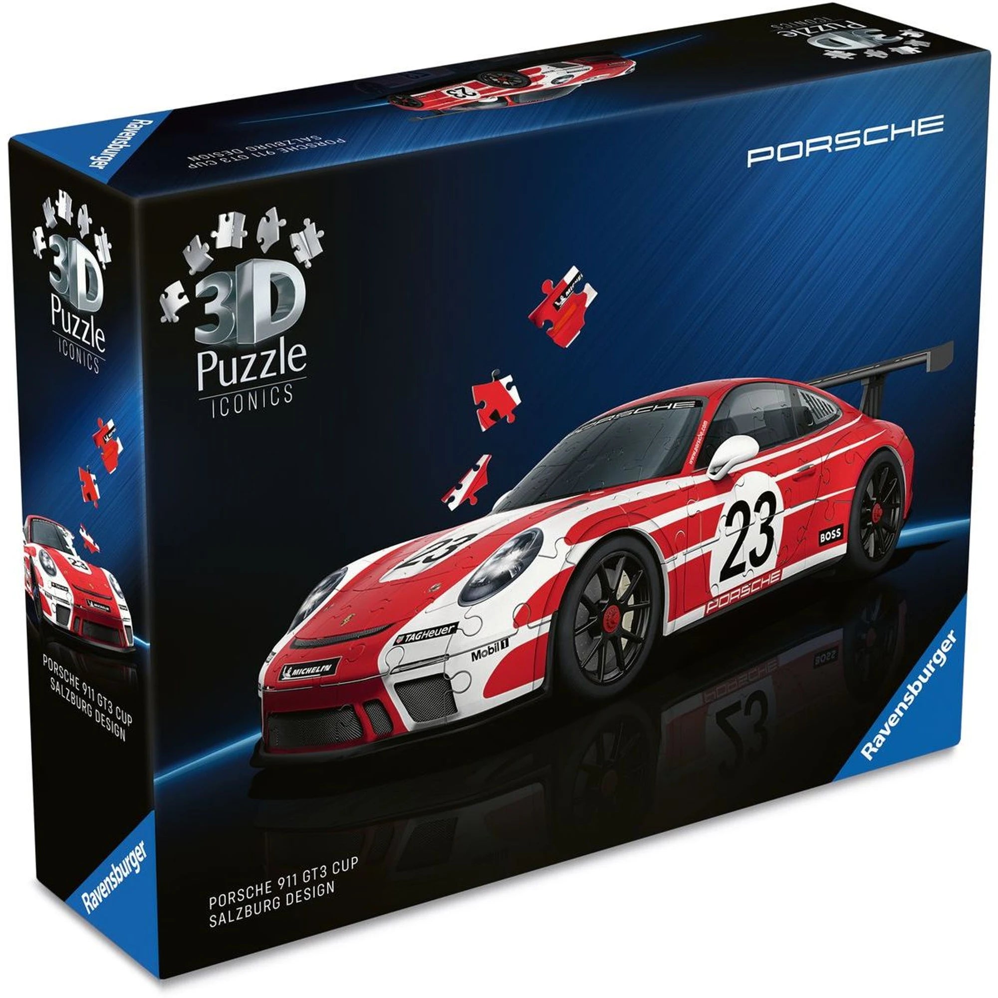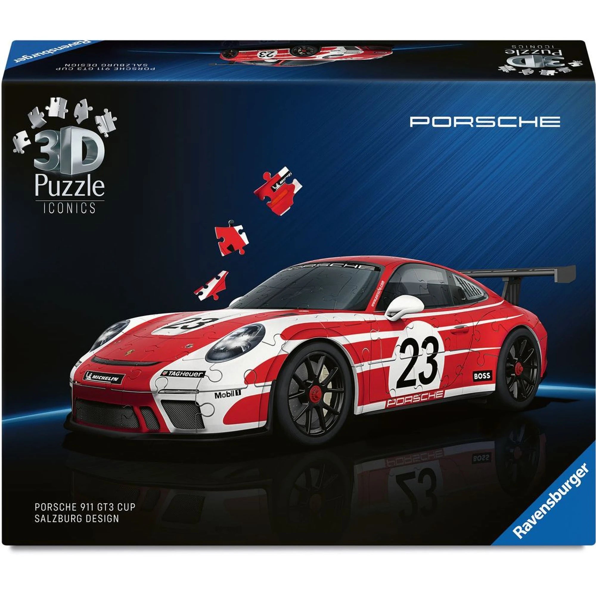 Zažít vzrušení závodních tratí s 3D puzzlem Ravensburger Iconics: Porsche 911 GT3 Cup Salzburg design? Tady se to řítí i bez řidičáku.