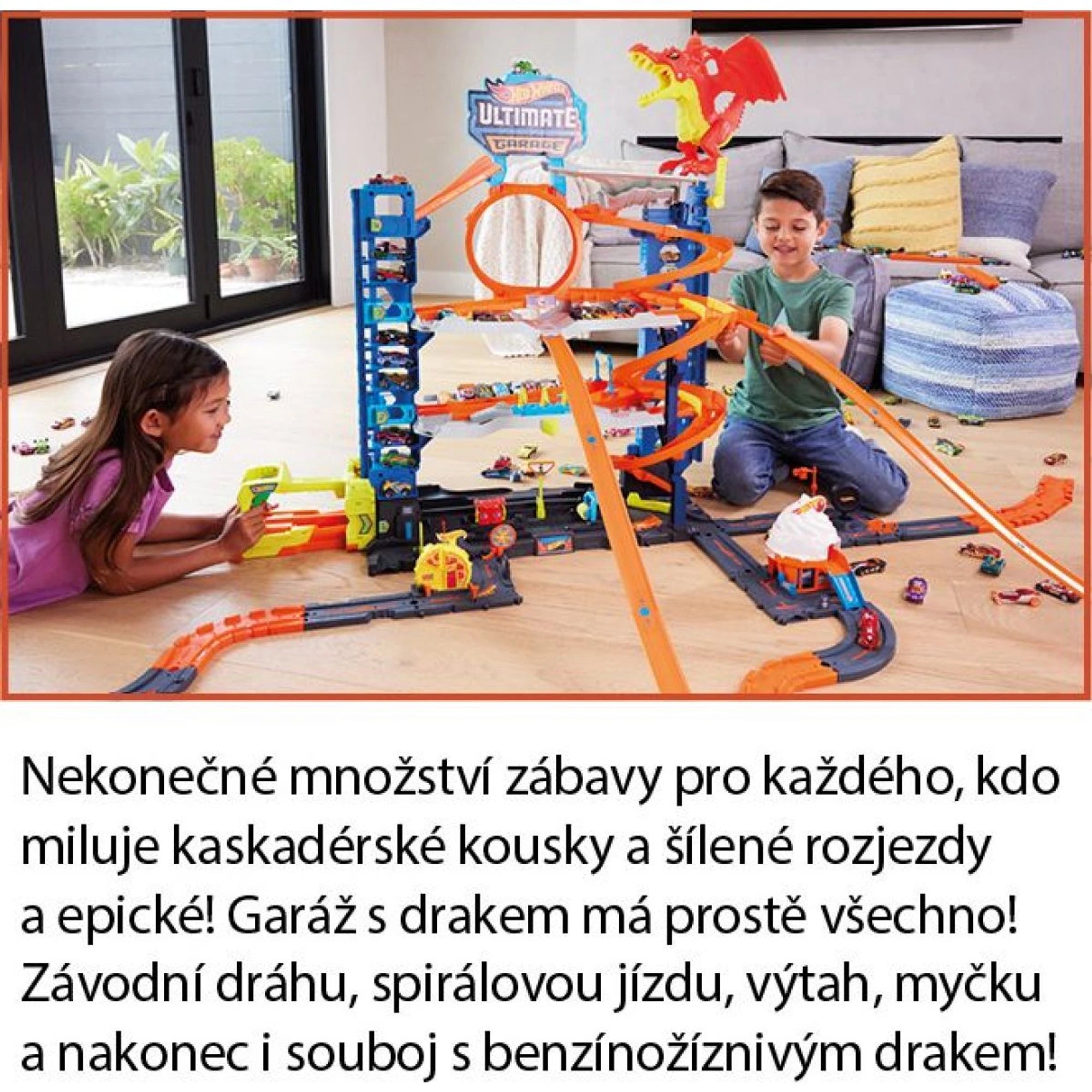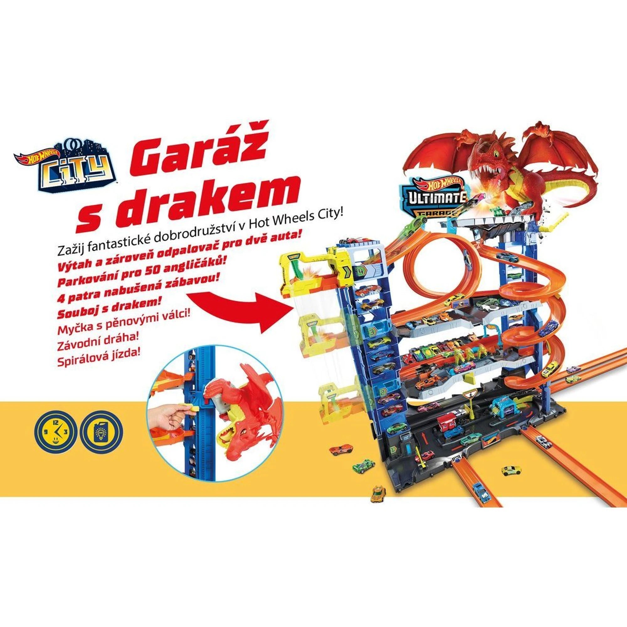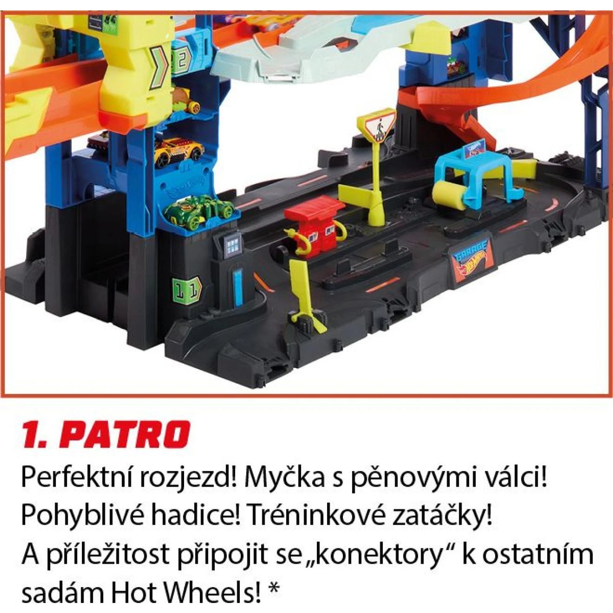 Autíčka kompatibilní s dráhami Hot Wheels® mají k dispozici místa pro zaparkování ve čtyřech patrech. Výtah sveze rovnou dva angličáky a klidně poslouží i jako odpalovač – start jak z rakety. První patro je herní zóna: myčka s pěnovými válci, benzínová stanice a konektory pro připojení k dalším setům Hot Wheels, které se prodávají samostatně. Ve druhém patře lze vypustit auta z výtahu přímo na dvojitou dráhu a závodit bok po boku. Ve třetím patře se auta vypouštějí bok po boku do smyčky a pohyblivé závory určují, kde bude cíl jejich jízdy.