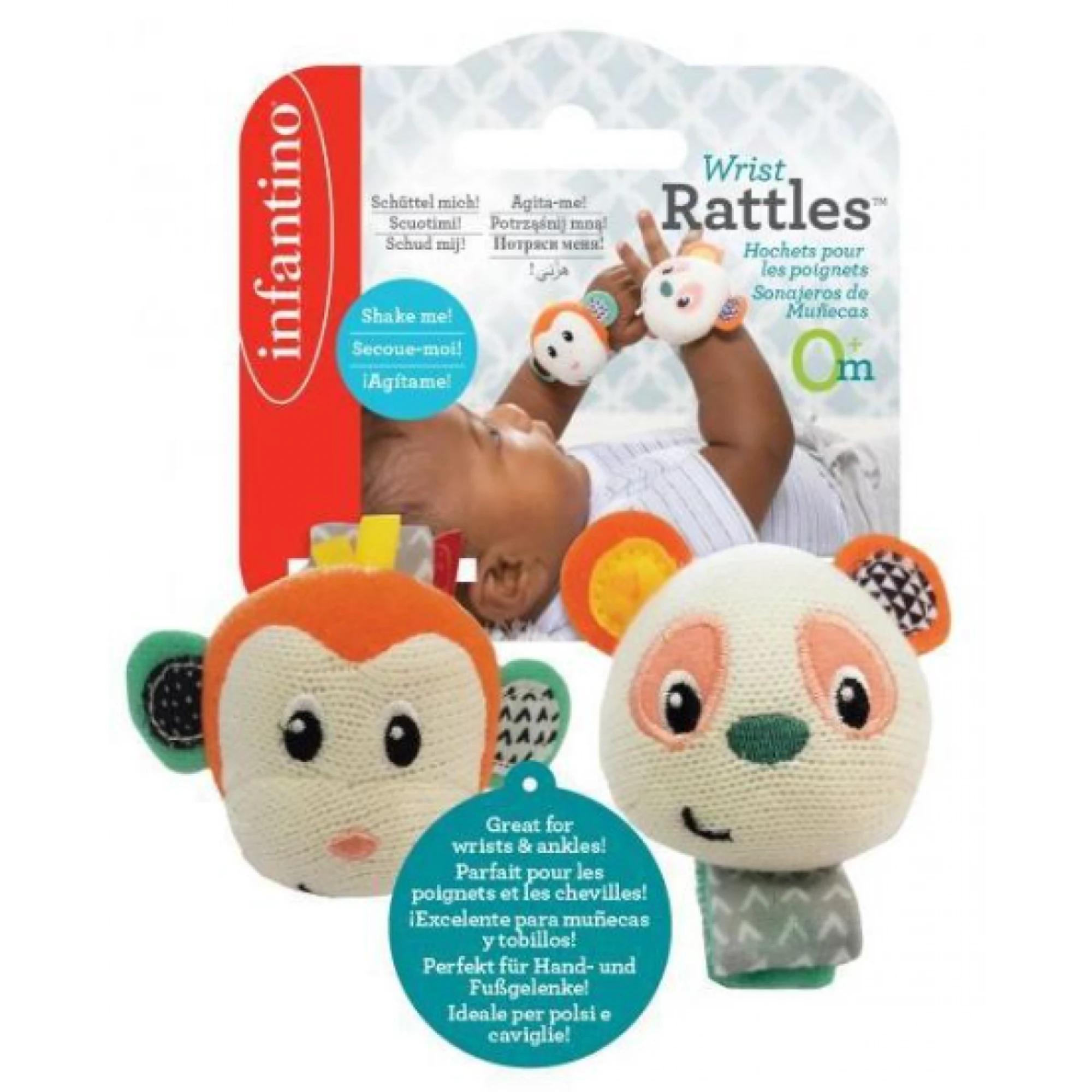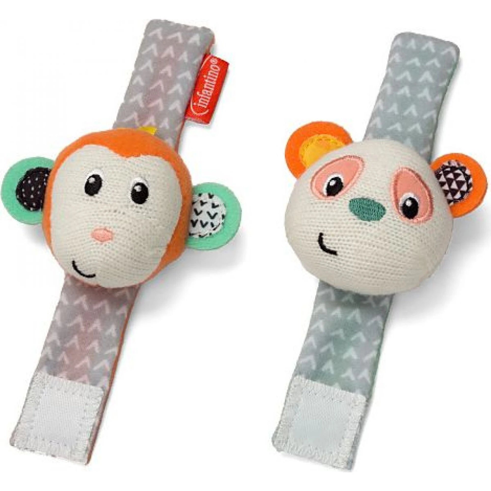 Dvě zvířátka, opička a panda, se ubytovala přímo na zápěstí malých miminek jako hravá chrastítka. Zvuk jejich chrastících hlaviček spolehlivě upoutá pozornost děťátek. Připevnění na suchý zip drží jak přibité – z dětské ručičky samy neodpadnou.