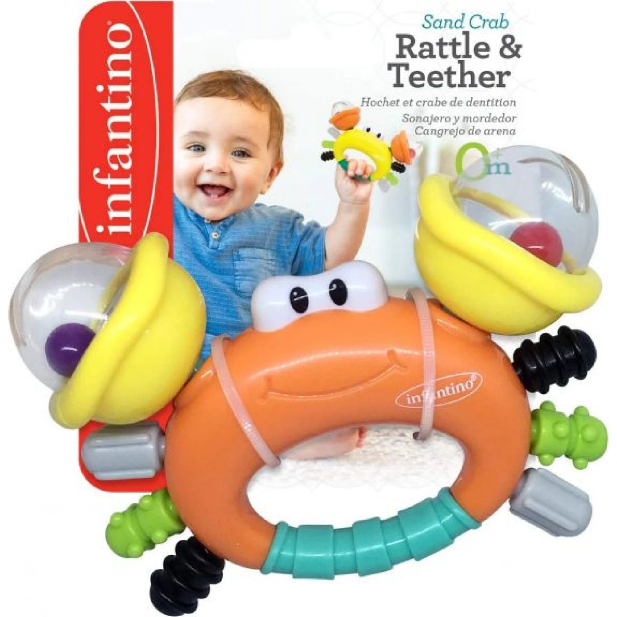 Krab se proměnil v hravé, tvarově pestré chrastítko. Dětem nabízí rozdílné struktury materiálů a kousátka pro úlevu nateklým dásním při prořezávání prvních zoubků. Černobílé prvky jsou ideální pro nejmenší, kterým se barevné vidění teprve rozjíždí.