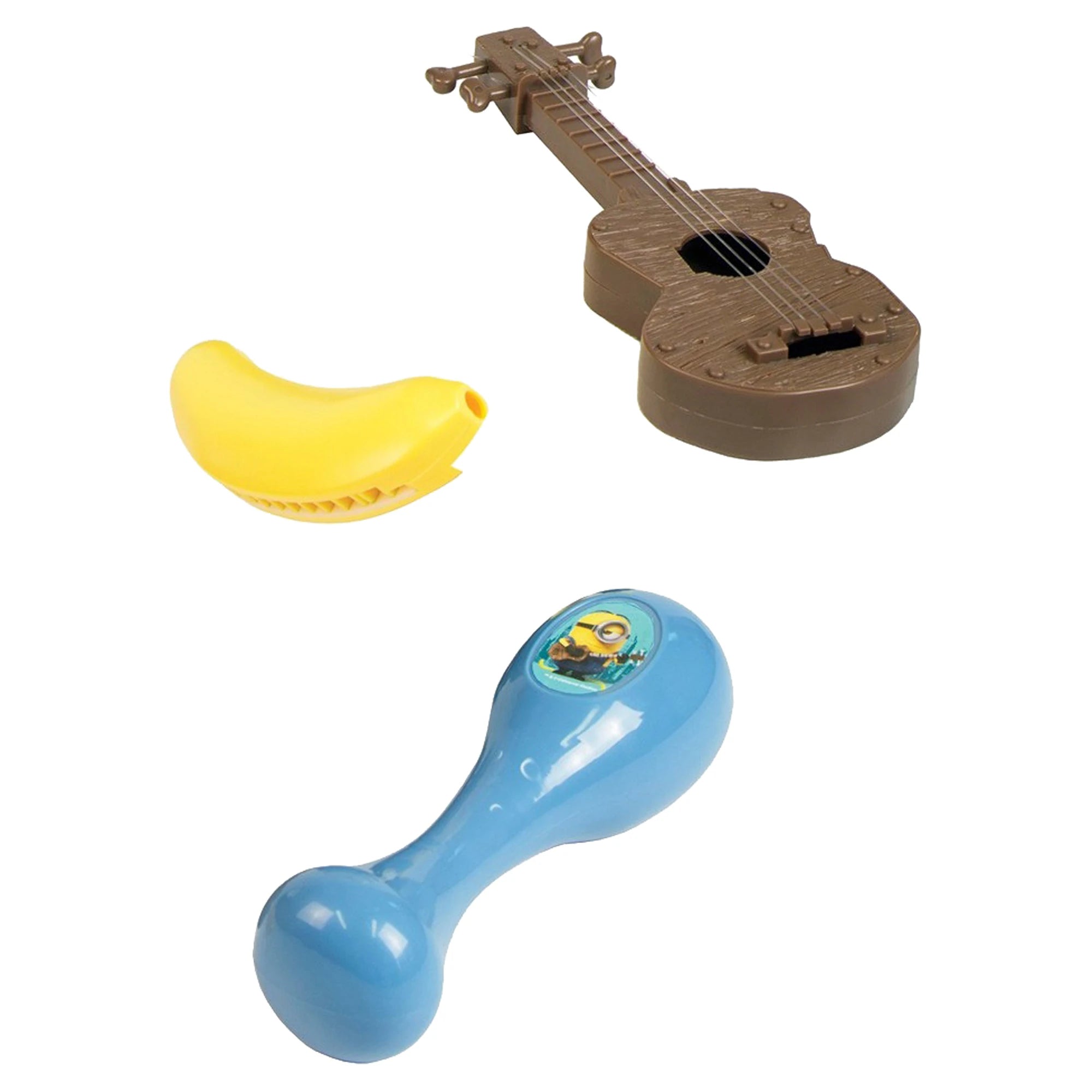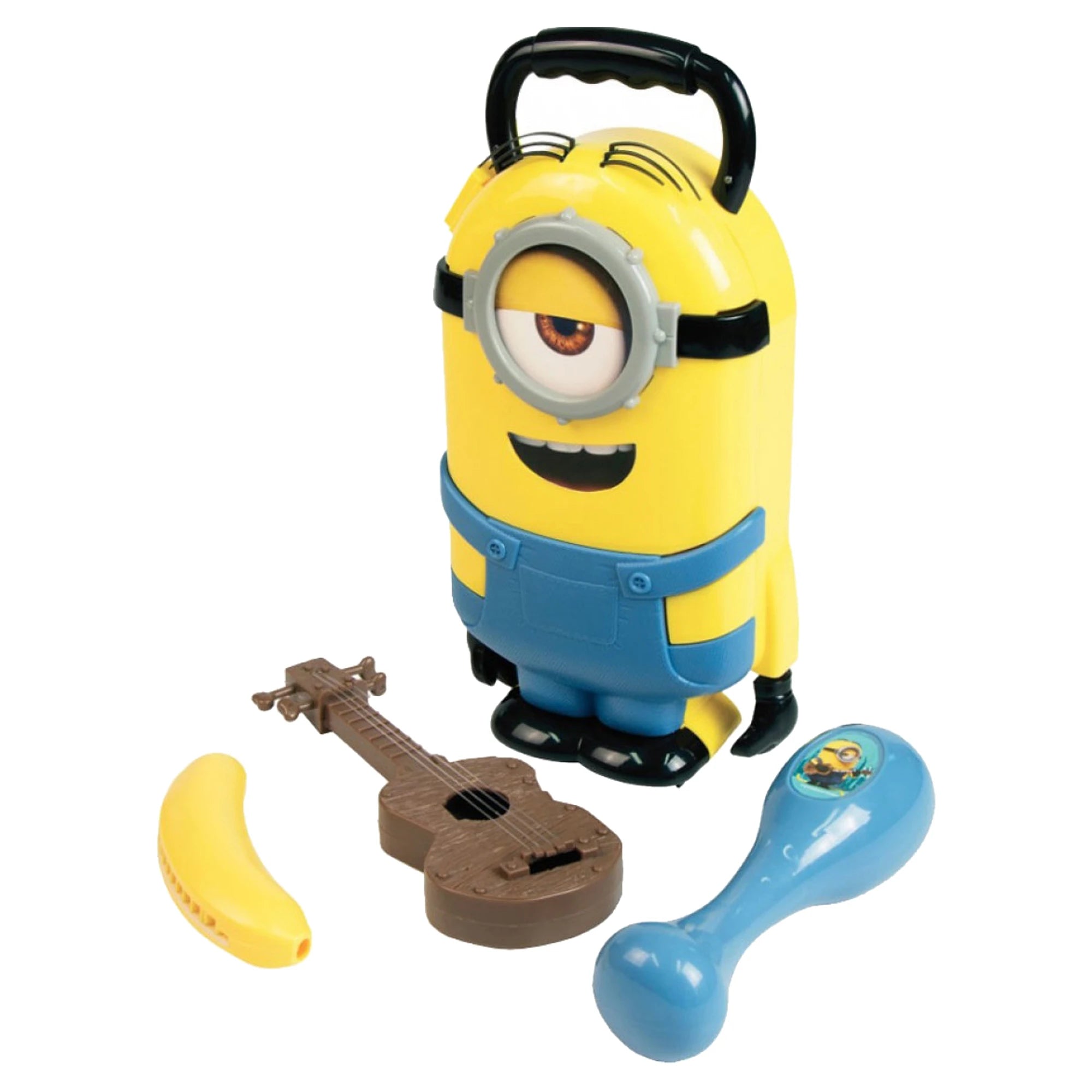 1x kufřík ve tvaru Stuarta, 1x mini ukulele, 1x harmonika ve tvaru banánu, 1x rumba koule