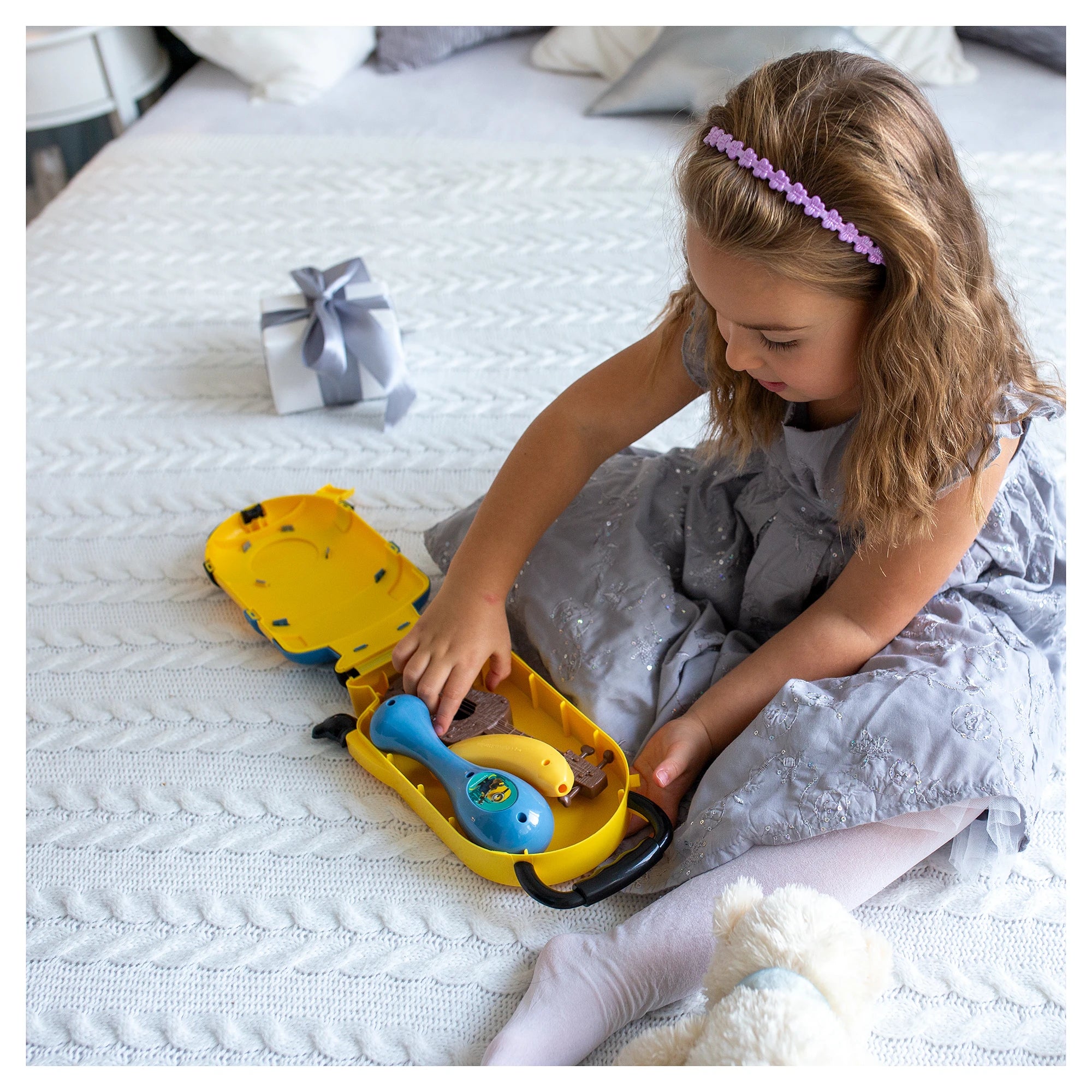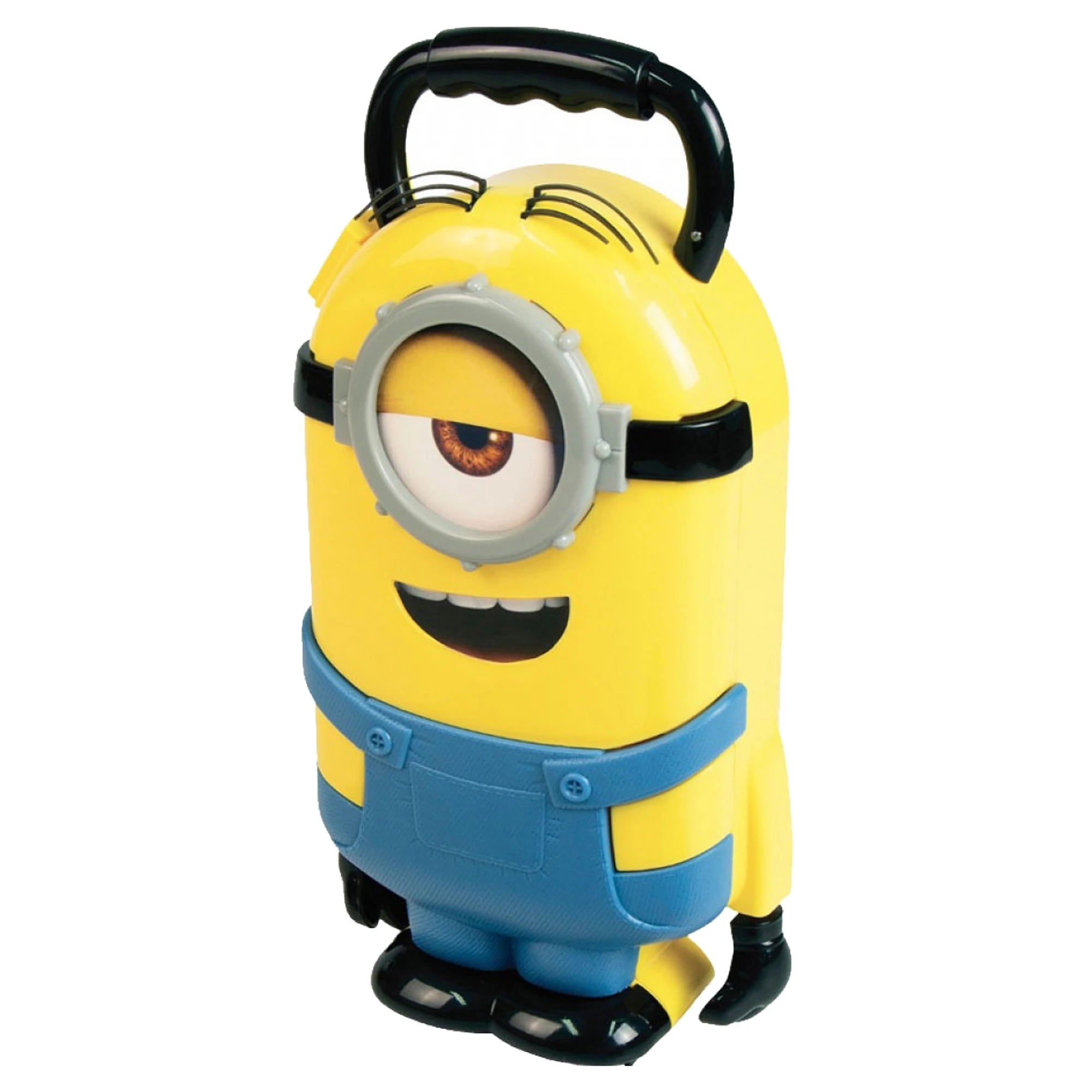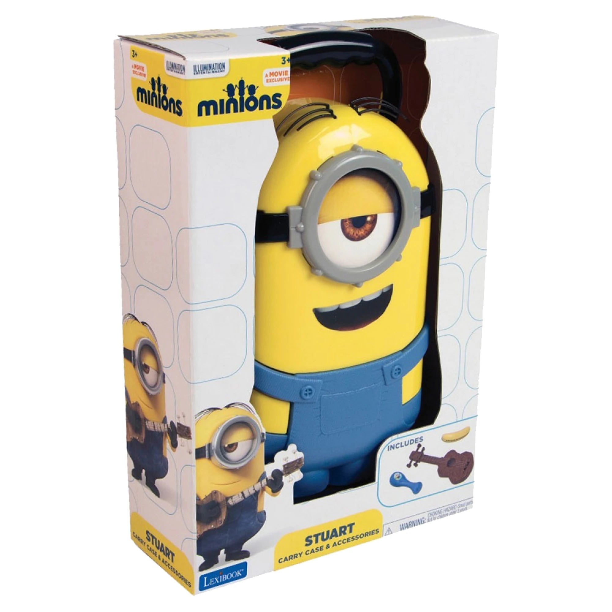 Stylový kufřík ve tvaru Mimoně Stuarta s praktickou rukojetí? Jasně! Parádní doplněk pro všechny malé fanoušky, co chtějí mít miniband vždy po ruce. Uvnitř čeká všechno, co si děti spojují s touhle oblíbenou žlutou postavičkou – nechybí mini ukulele, na které si mohou zabrnkat jako ve filmu, harmonika ve tvaru banánu a jedna rumba koule. Herní příslušenství se snadno vejde zpátky do kufříku a může cestovat kamkoli. Kufřík o rozměrech cca 16,50 x 6,60 x 28,80 cm klidně poslouží i na přenášení dalších drobností.