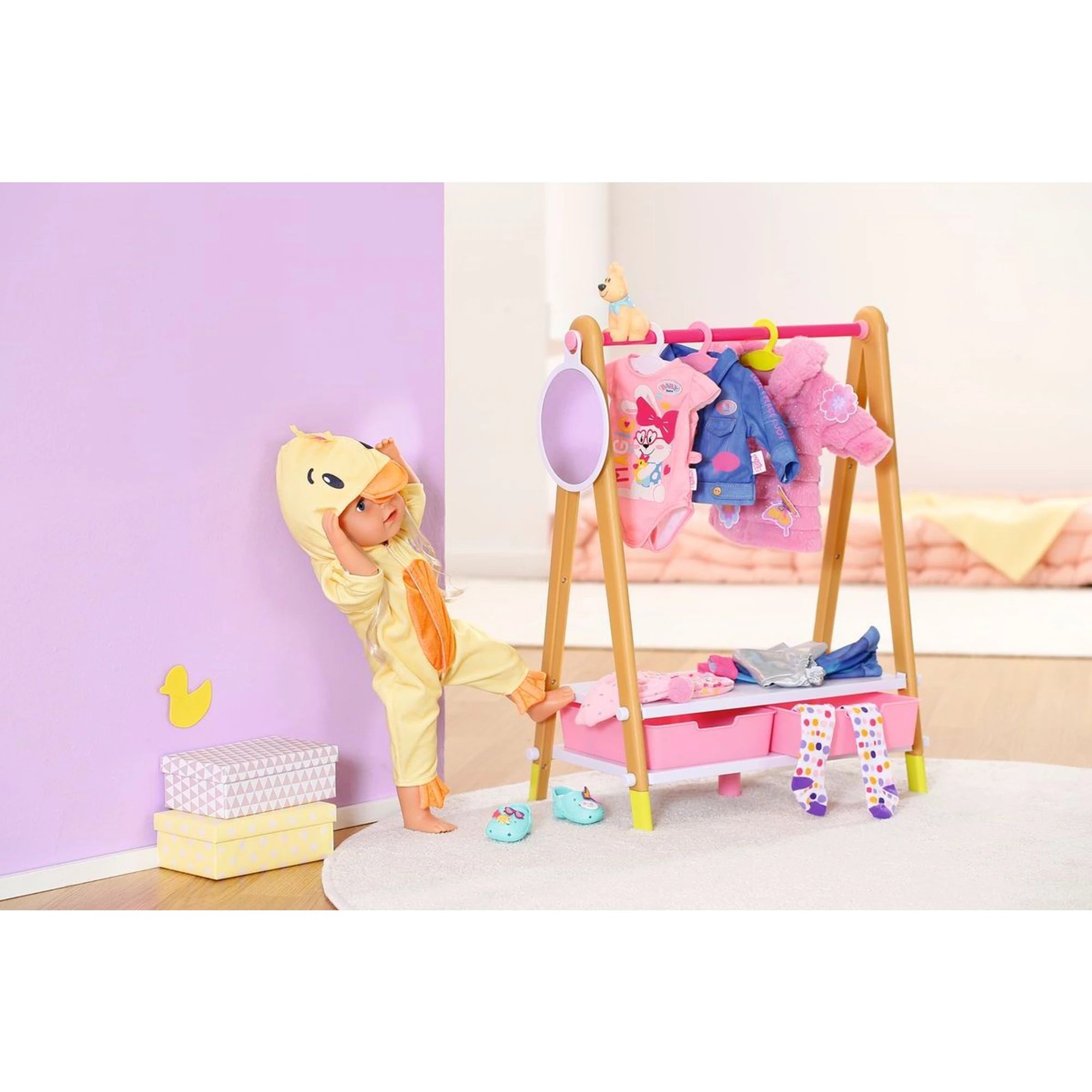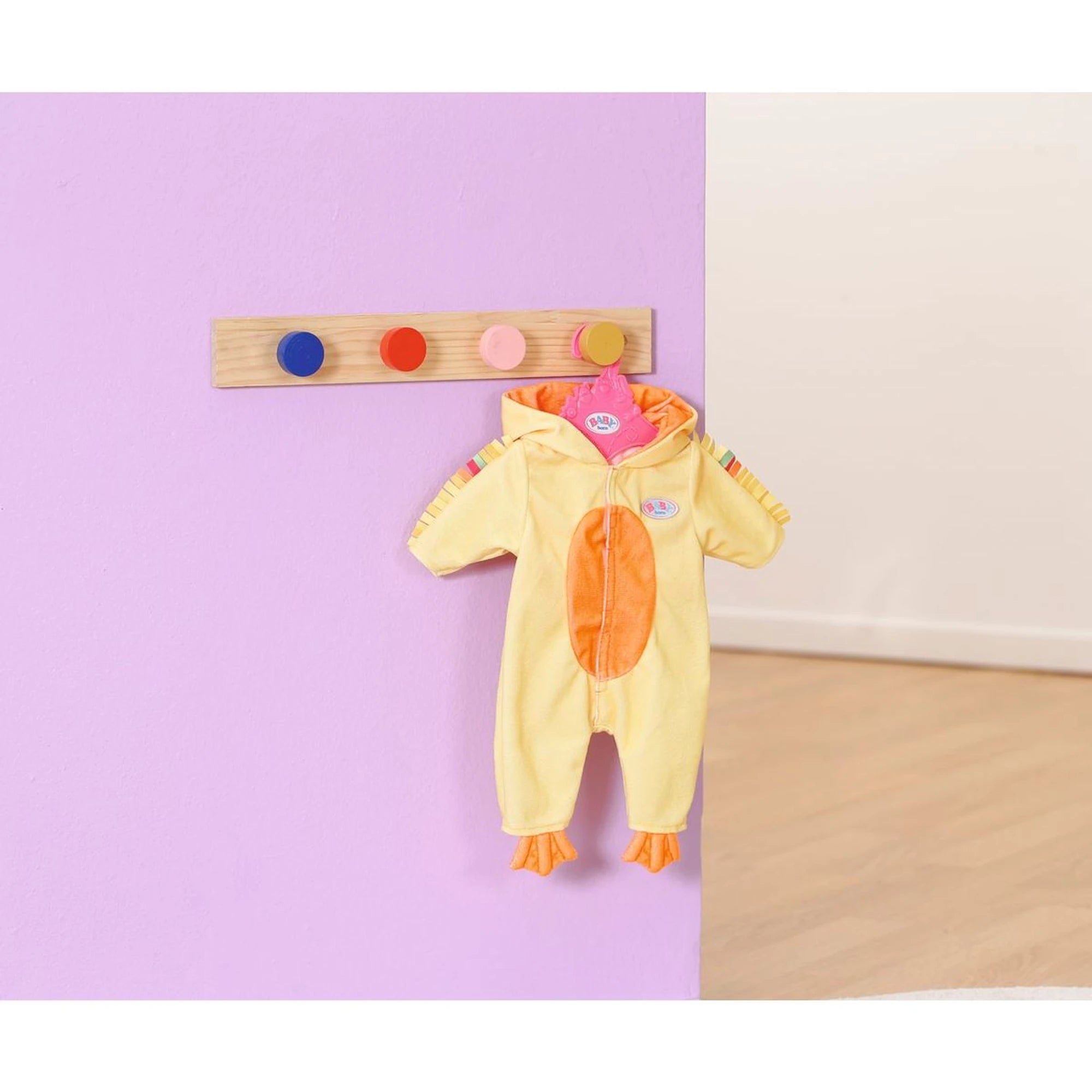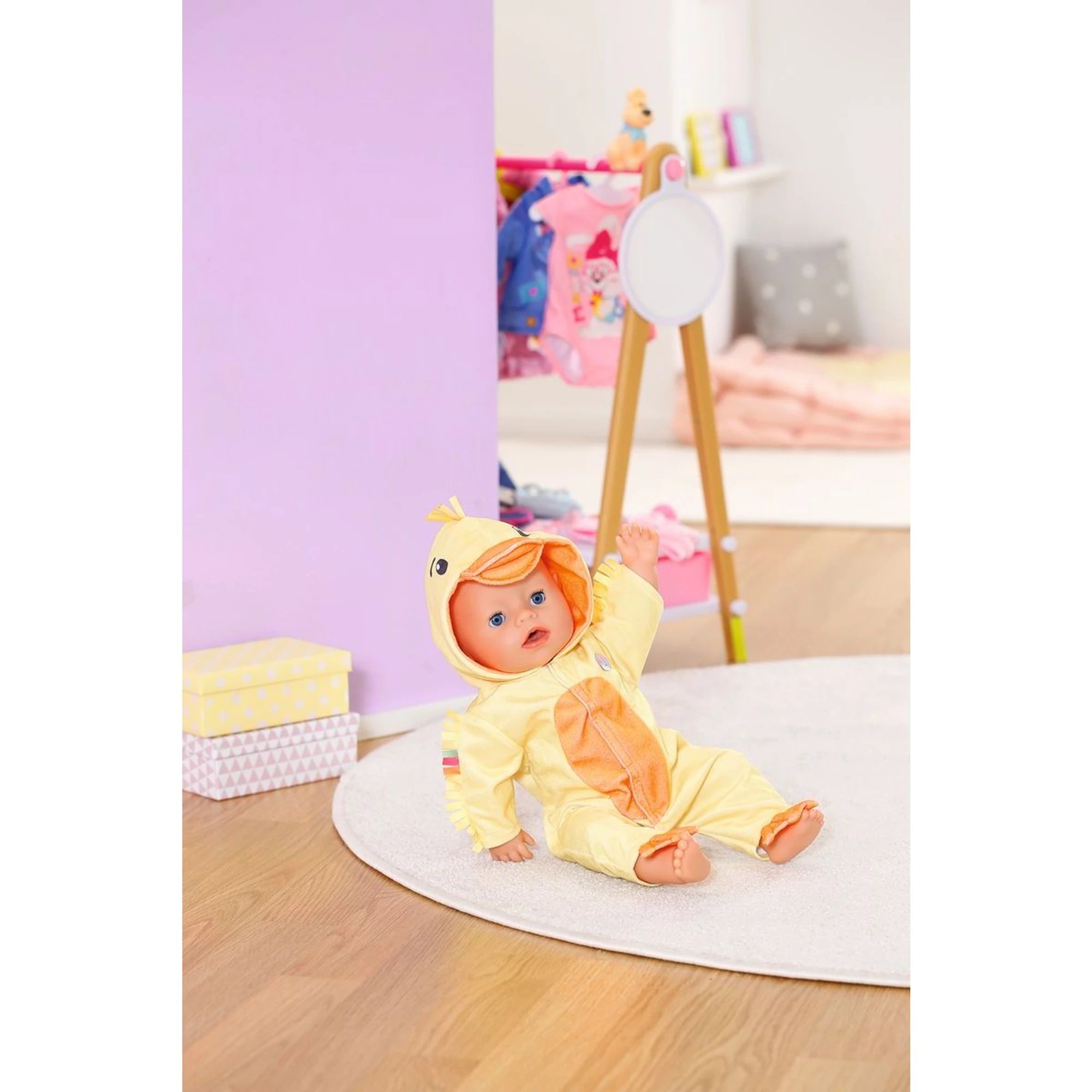 Originální kostým kačenky Berty pro panenky Baby Born – jednodílný overal s kapucí pro panenky velikosti 43 cm, připravený rozvířit domácí rybníček fantazie.