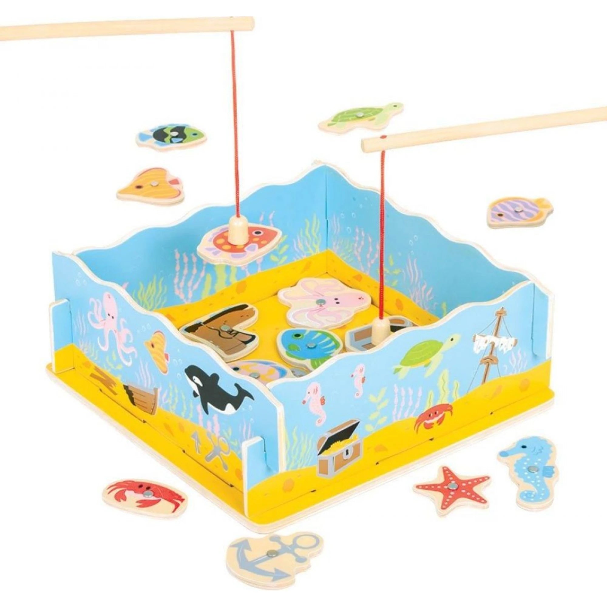 Pomyslné moře s mořskými živočichy, se starou botou i pokladem, už bublá nedočkavostí – a čeká na malé rybáře. Holčičky i kluci je můžou rybářskými pruty s magnetem nejen chytat a lovit, ale taky je hezky poctivě vracet zpátky do správných výřezů. Jo, i ta bota má v moři svoje místo. Kdo by to byl řekl.