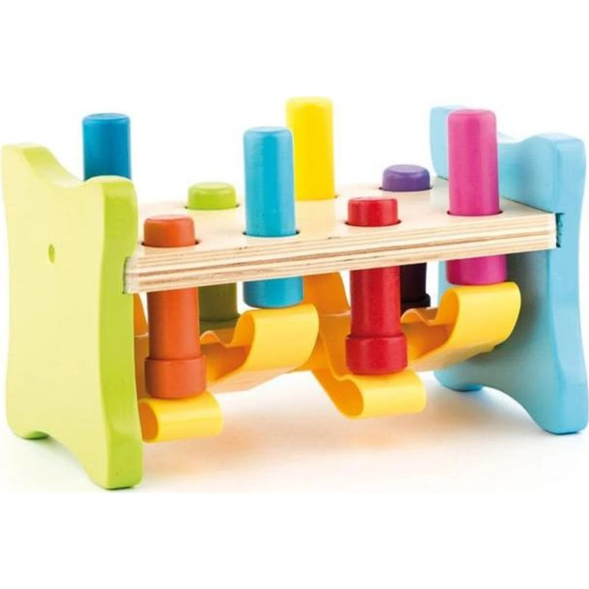 Zatloukačka pro šikovné ručičky malých dětí – tentokrát v úpravě, která se jen tak neokouká. Barevné kolíčky jsou upevněny proti sobě, takže když jeden dostane „ťuk-ťuk“ lekci, ten protější se vítězoslavně vyhoupne nahoru. Malý kolotoč radosti na stole.