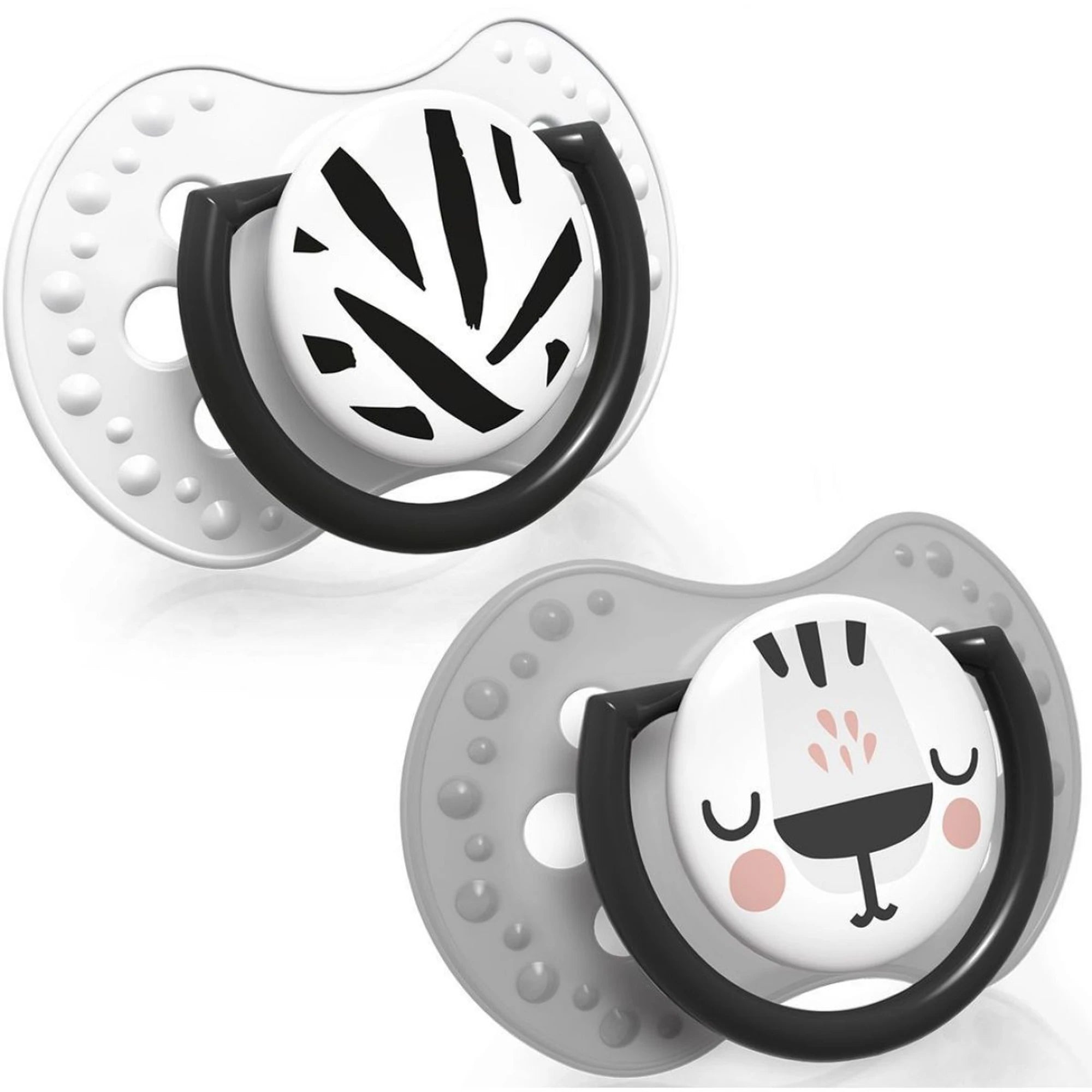 Sada dvou dudlíků s perforovanými ústními kryty – ideální parťáci pro malé sací šampiony ve věku 6–18 měsíců.