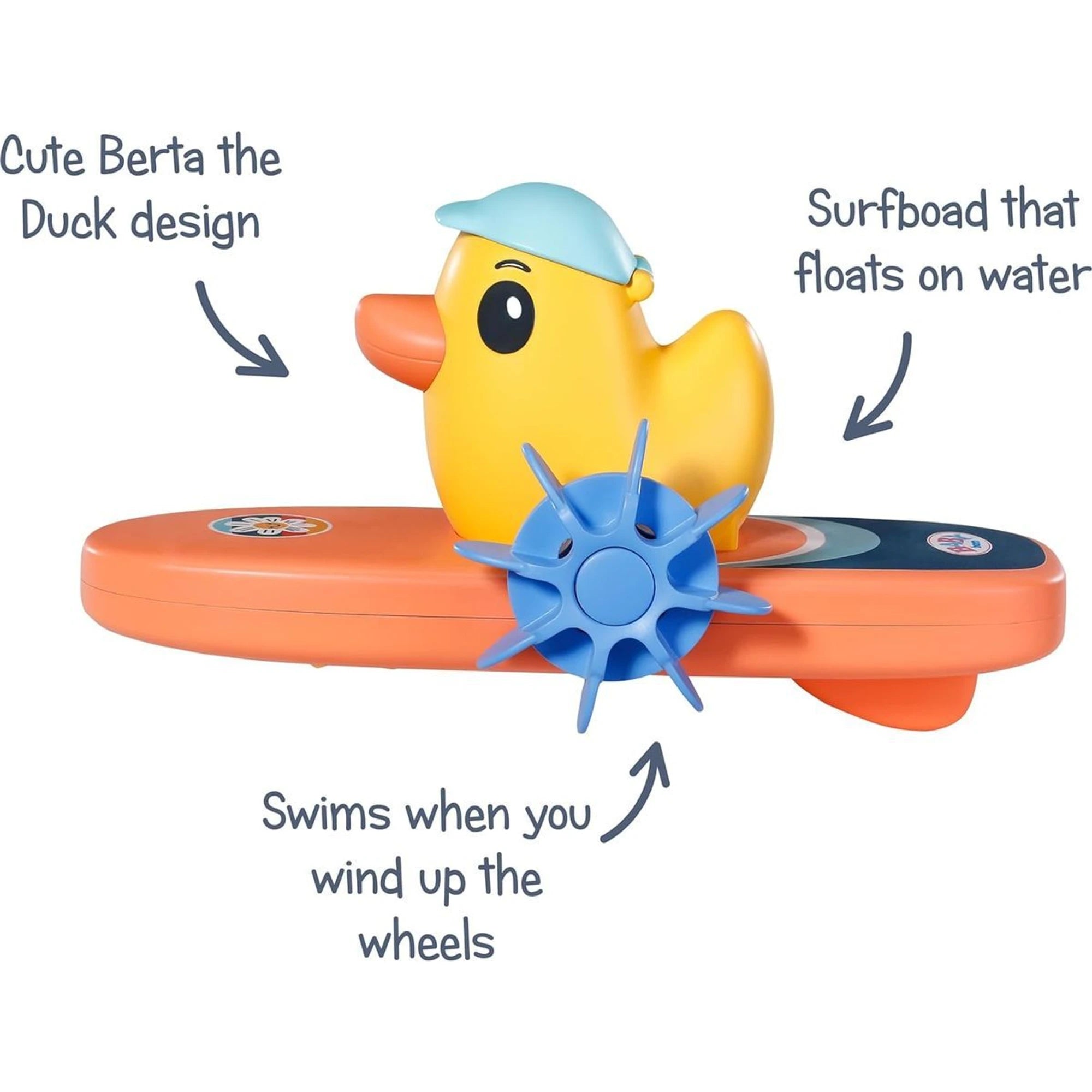 Berta surfuje jako profík – i ve vaně! Žádné baterie, jen čistá vodní jízda! Natoč kolečka, polož Bertu na hladinu a sleduj, jak sviští po vlnách rychleji než bublinky z pěny.