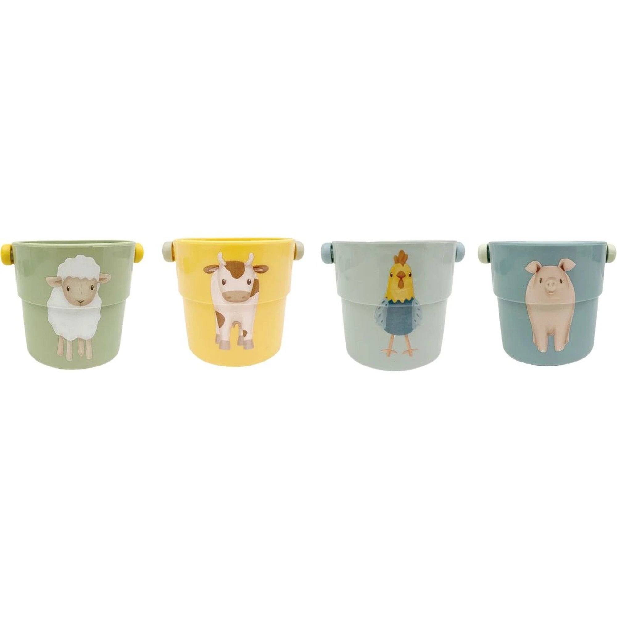 Sada kelímků pastelových barev, s vlídnými obrázky, promění koupání malých dětí v zábavné šplouchání – voda lítá, úsměvy taky.