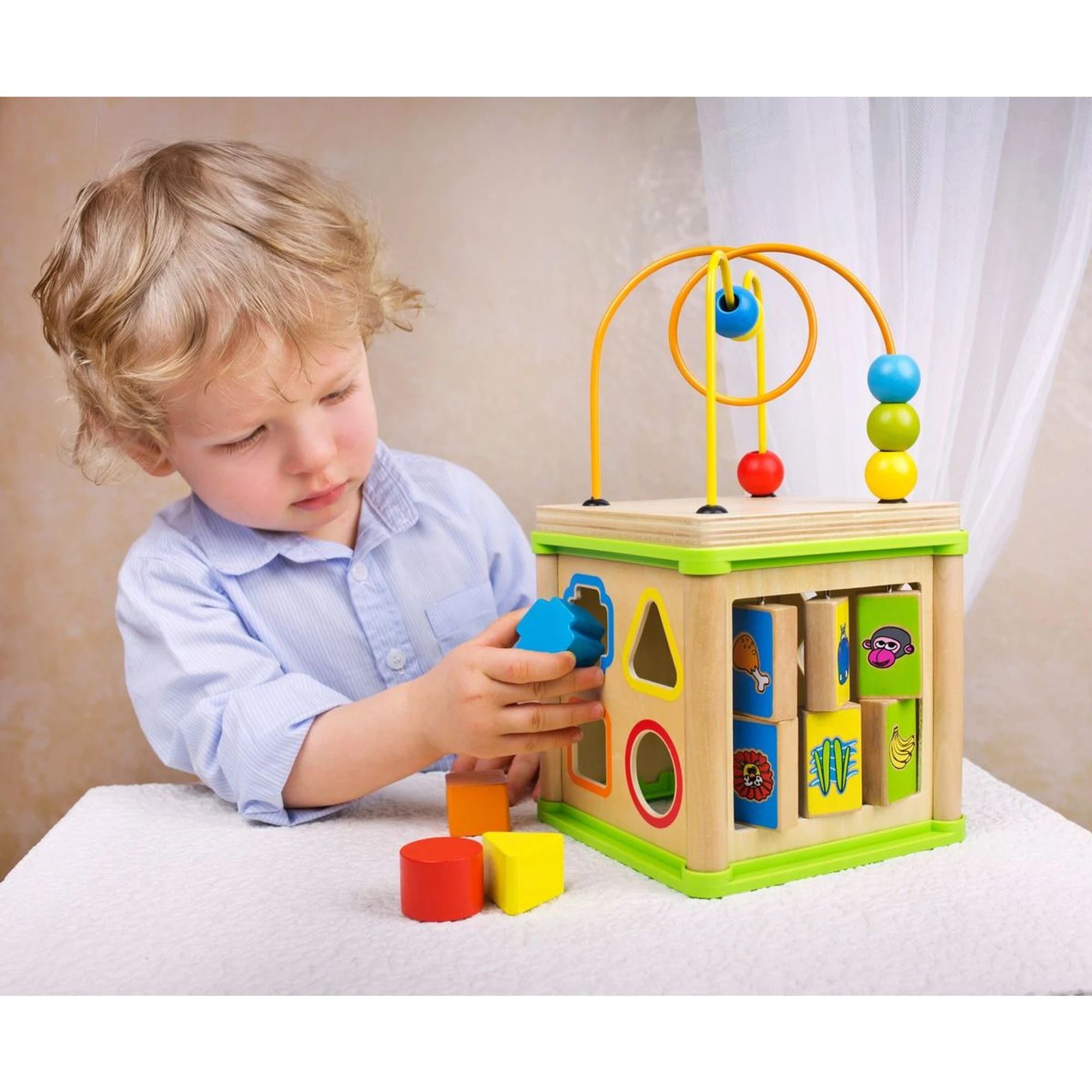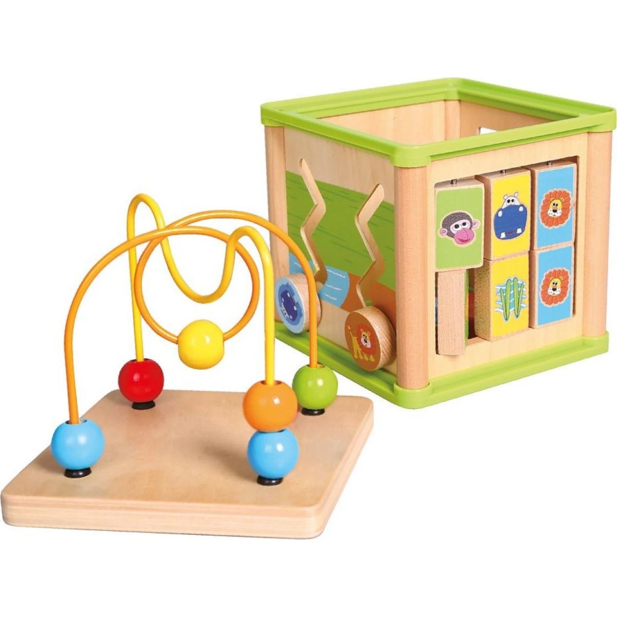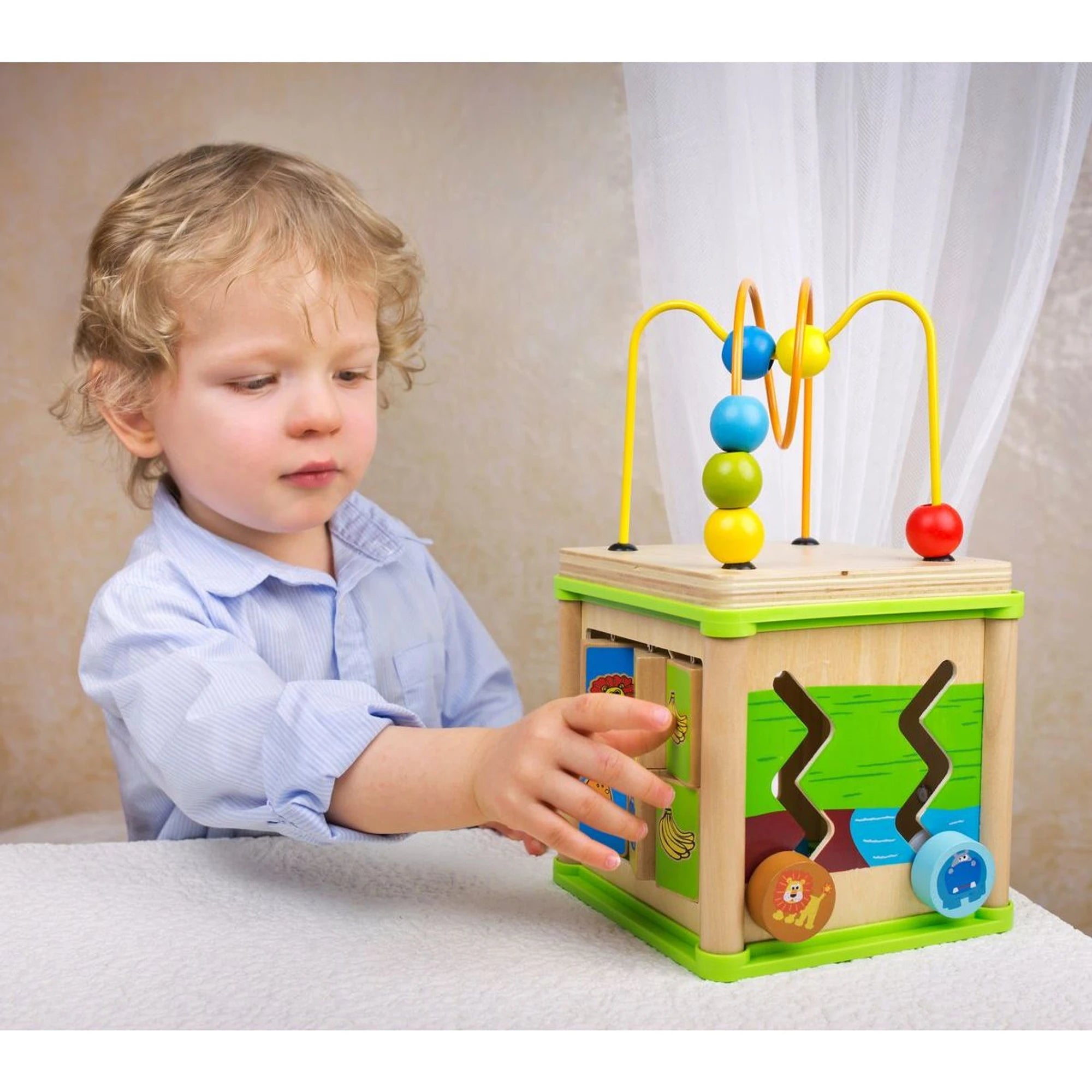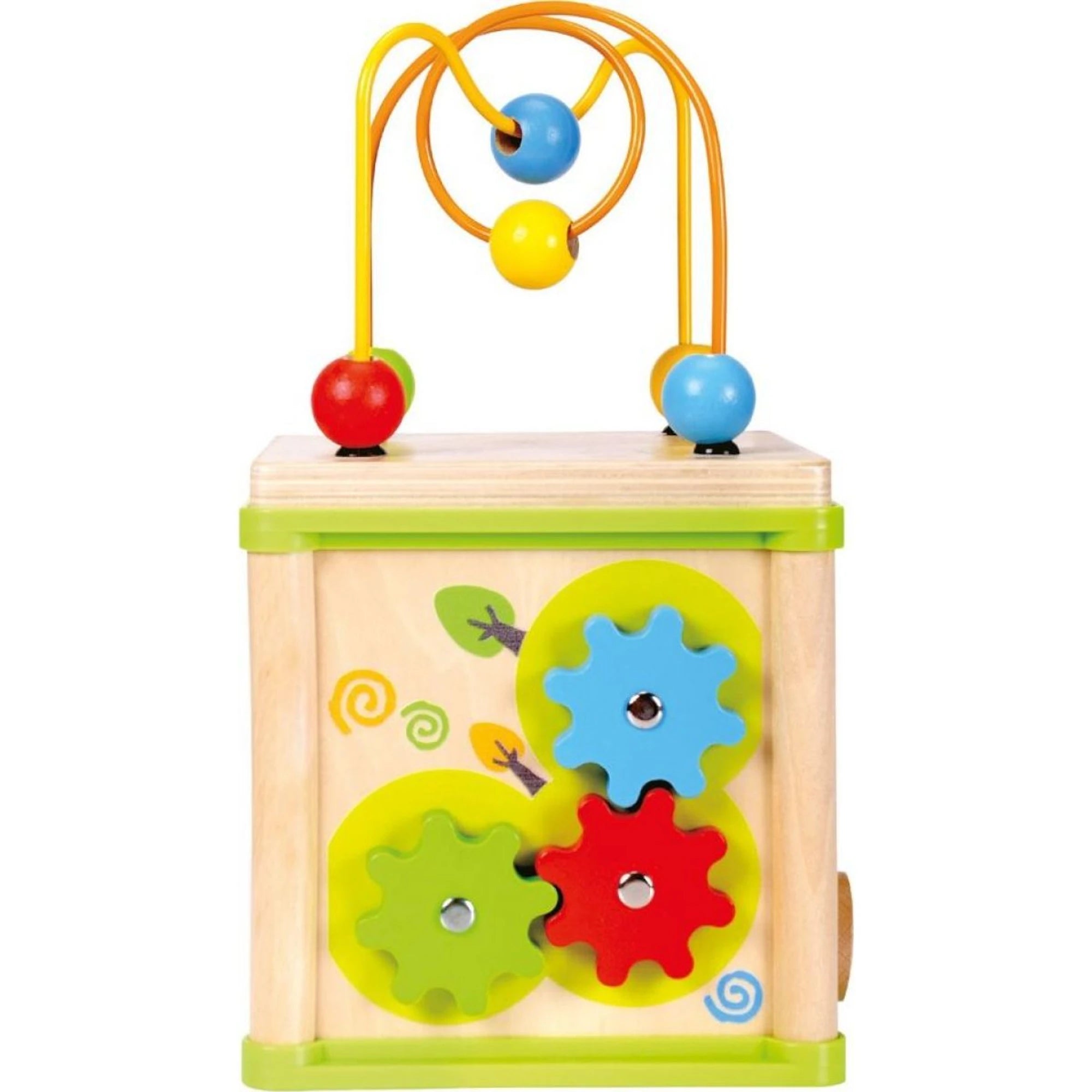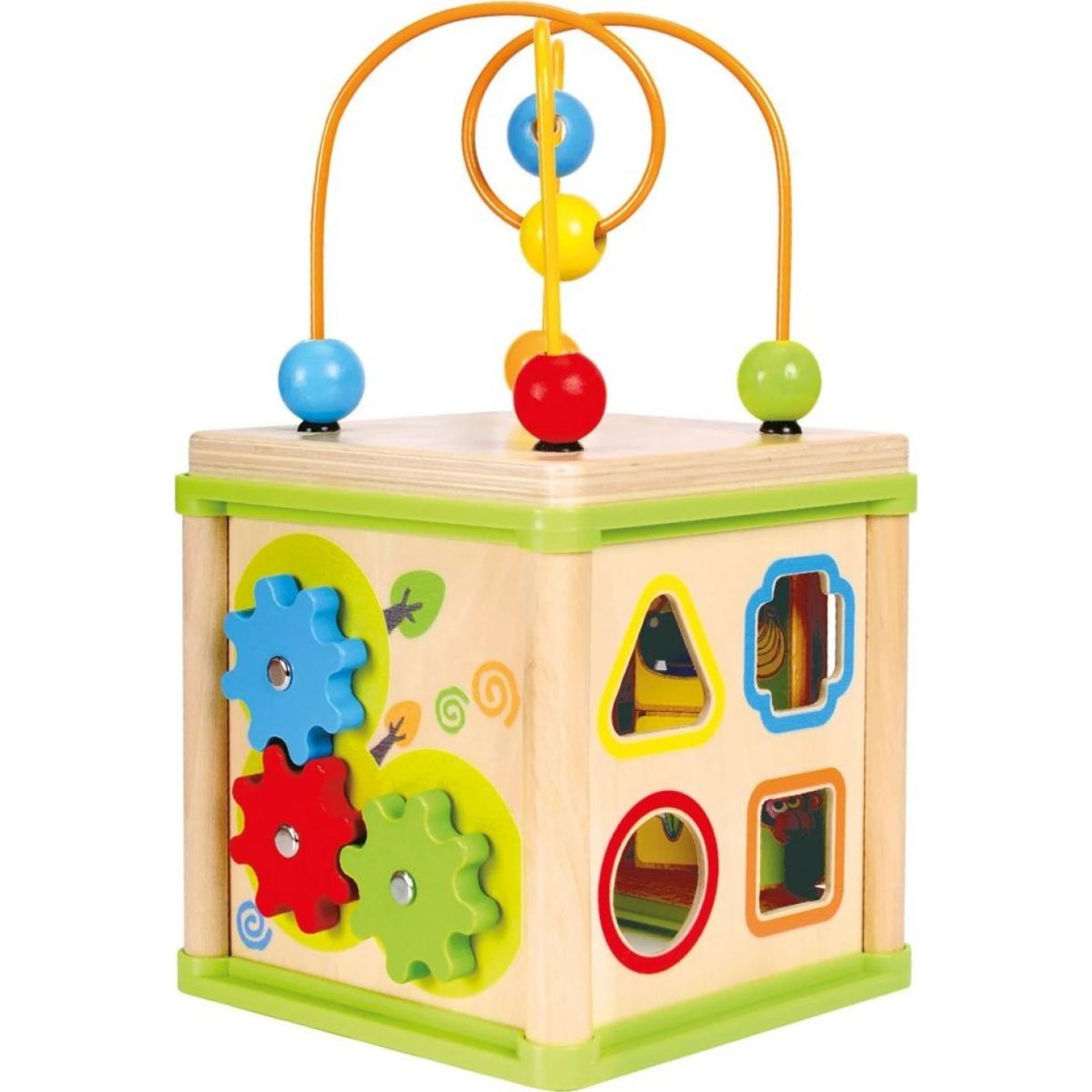 Na každé straně kostky je jiná aktivita. Tady mohou malí objevitelé vkládat tvary, jinde se točí ozubená kolečka a v labyrintu se hledá správná cestička pro barevné dílky – prstíky makají, hlavička přemýšlí.