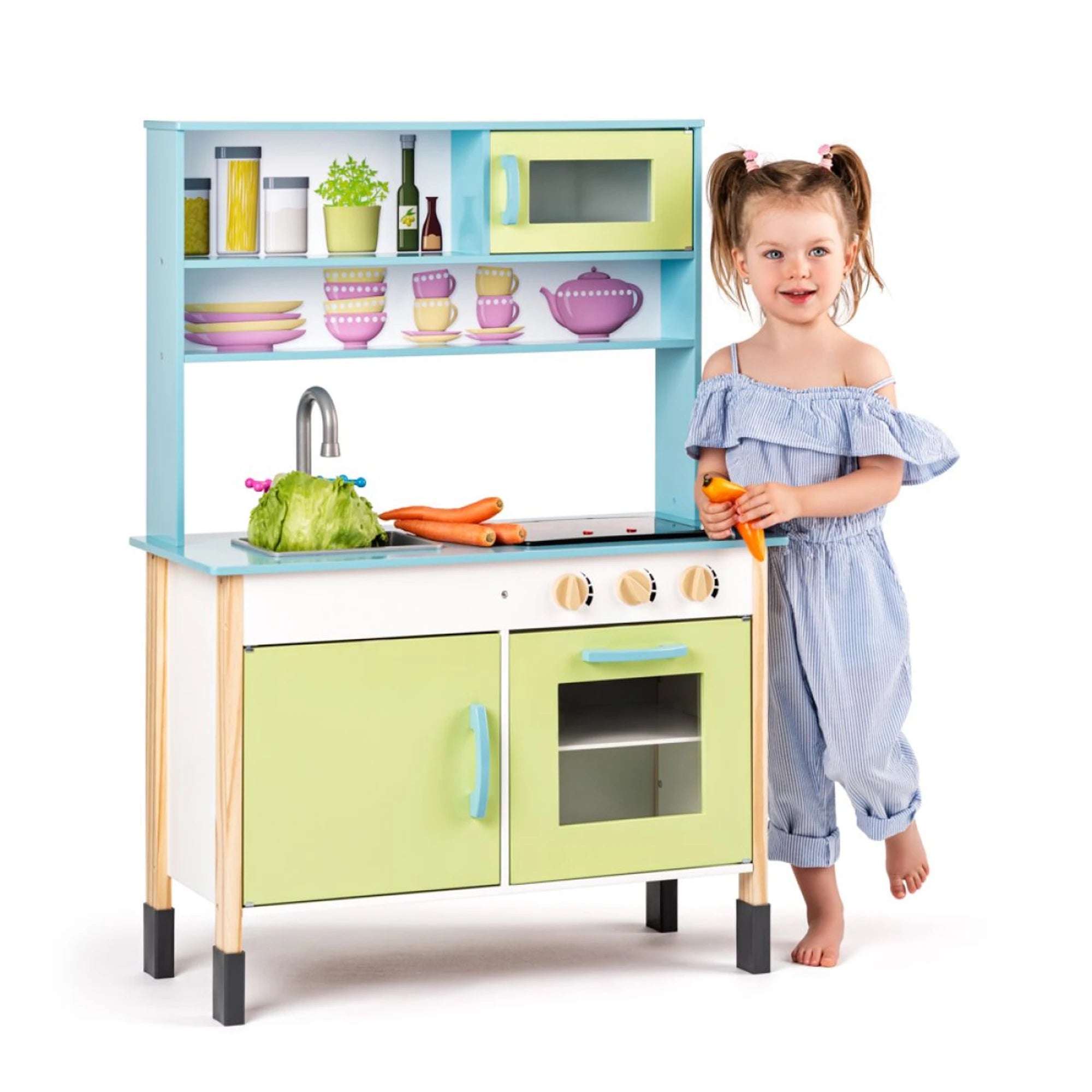 Dřevěná kuchyňka v pistáciovém provedení umí rozzářit nejeden malý kuchařský talent. Nahoře čeká mikrovlnka s otočnými knoflíky a dvířky, co se fakt otevírají – a dole trouba, taky pěkně poctivě na „klik“. U dřezu je otočná baterie, takže voda sice neteče, ale fantazie ano. Kuchyňka je ze smrkového dřeva, prokládaného překližkou.
