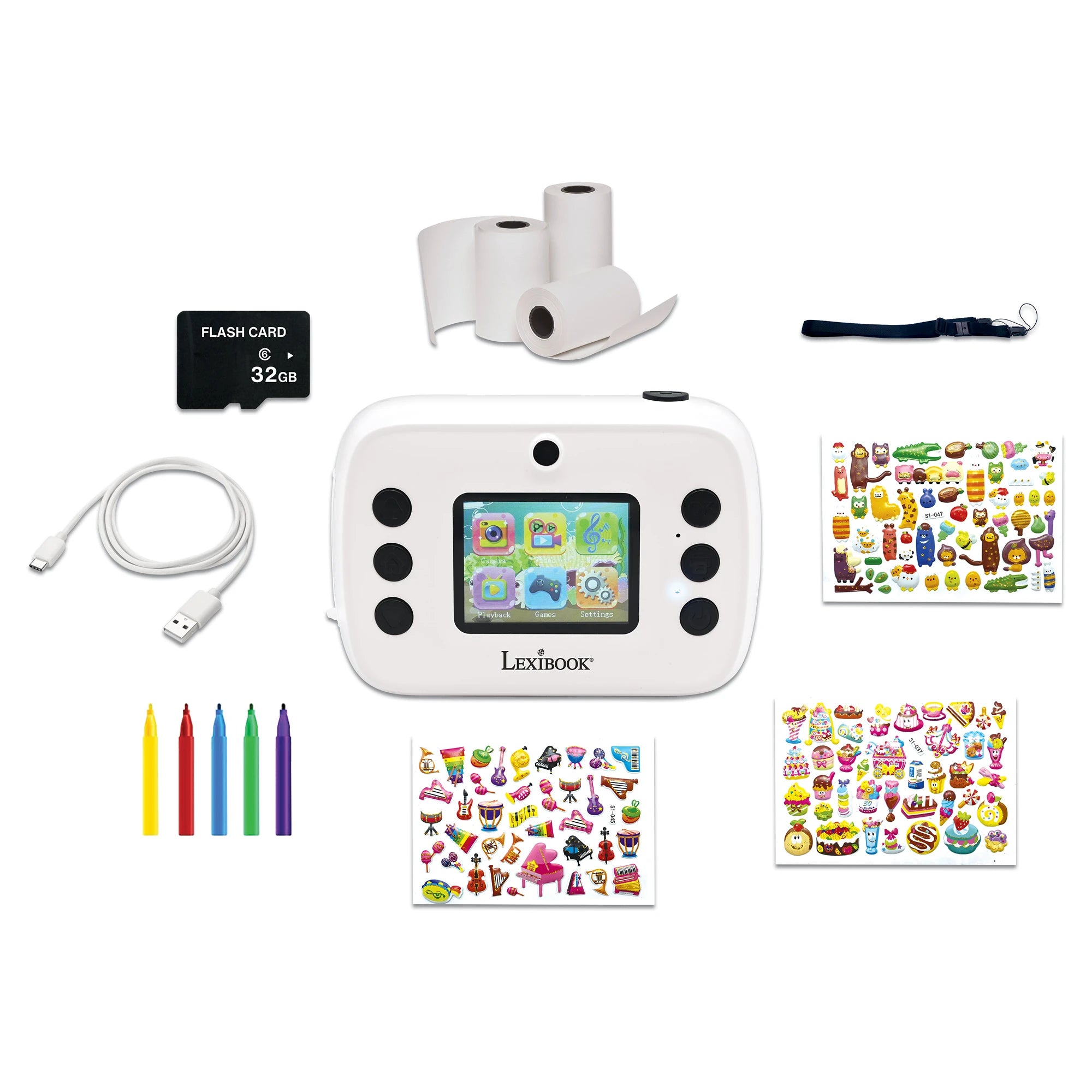 1x fotoaparát, 1x 32 GB paměťová SD karta, 1x nabíjecí kabel USB-C, 5x fixa, 3x role termopapíru, 3x arch samolepek, 1x řemínek na zápěstí