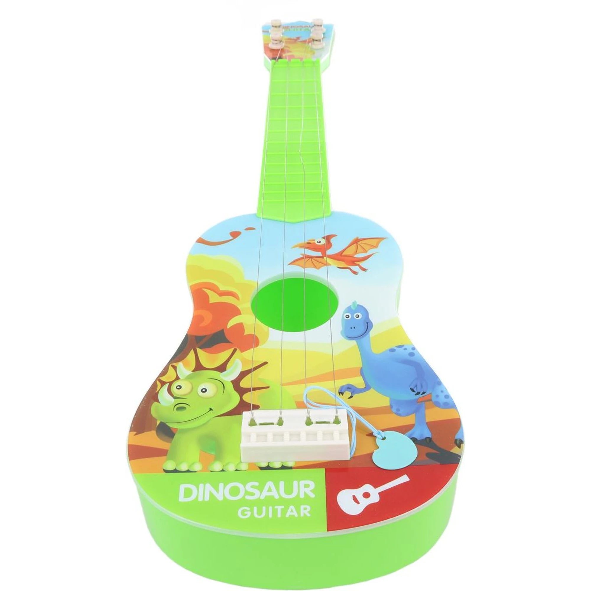 Hudební hračka v podobě plastové kytary, tentokrát s veselým potiskem dinosaurů, co láká k prvnímu brnknutí.
