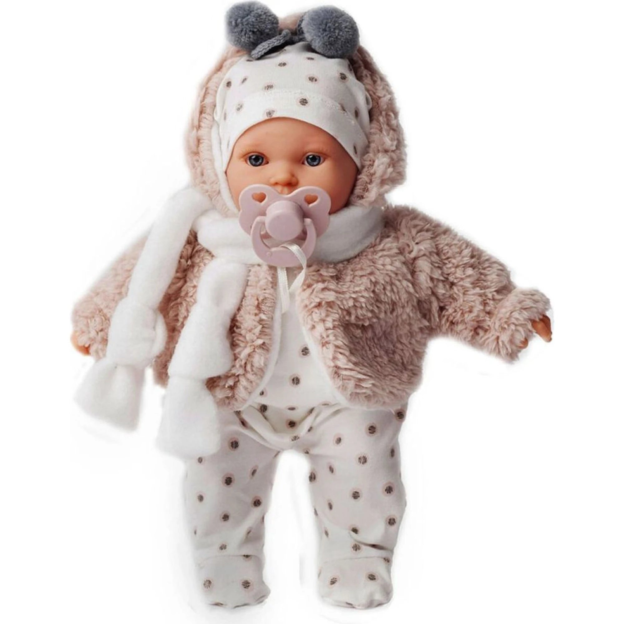 Postavička má měkké látkové tělíčko, hlava a končetiny jsou z kvalitního vinylu. Obleček je příjemně hebký na dotek. Tentokrát má na sobě světlé dupačky s jemným vzorkem a huňatý kabátek se šálou. Na hlavě má čepičku s bambulkami – připraveno k mazlení.