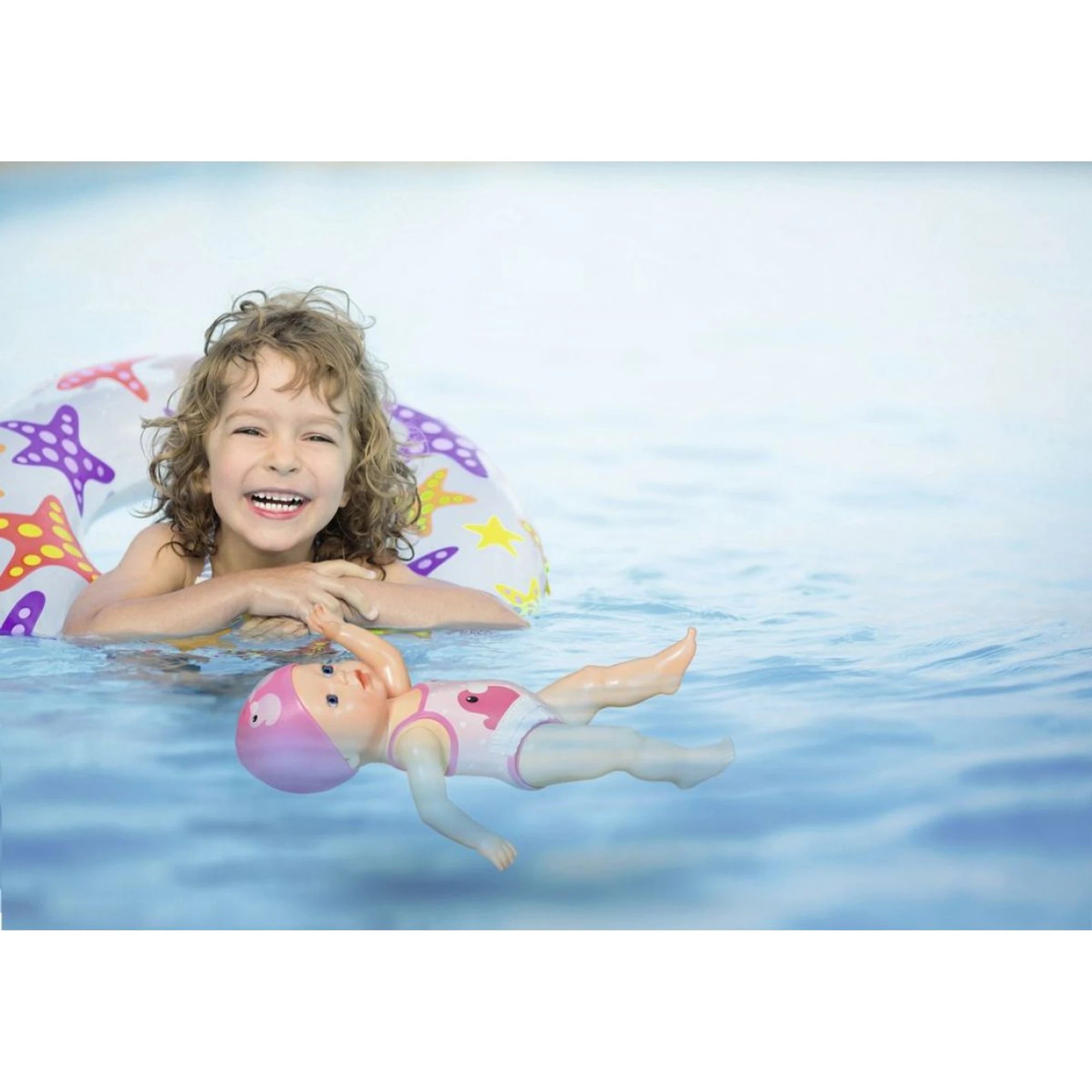 Panenka plavkyně ve vodě předvede parádní kraul i motýlka – jako malá mistryně bazénu. Při kraulu střídá ruce jednu za druhou, u motýlka hýbe oběma stejně. Baterie? Ani kapka není potřeba. Plavky i plavecká čepice jsou natištěné přímo na těle jako reliéf a navíc je zdobí obrázek kačenky.