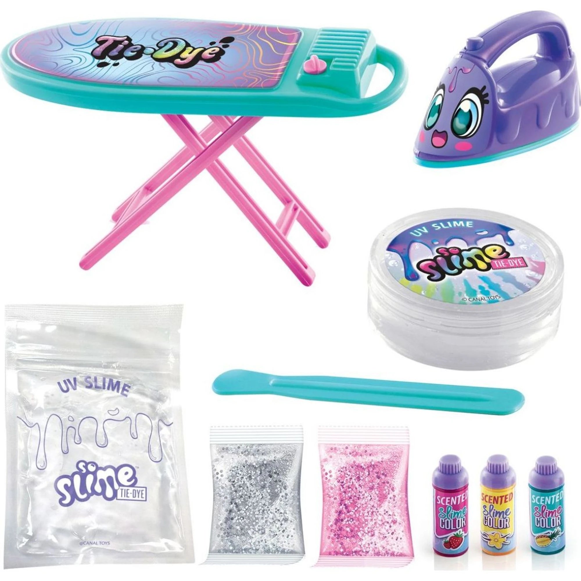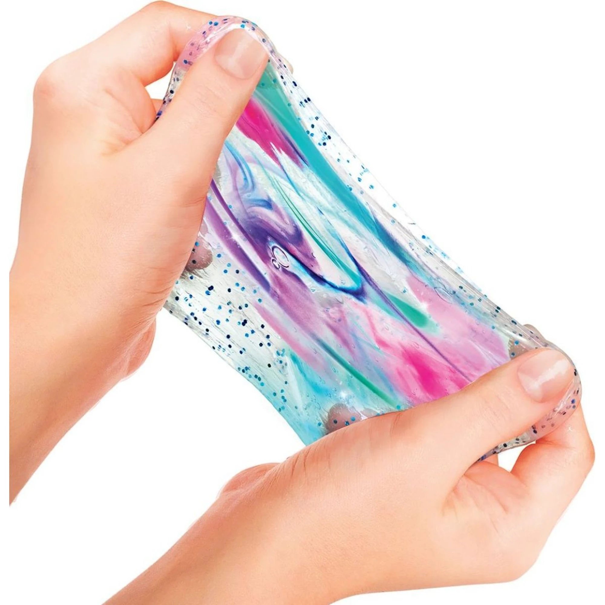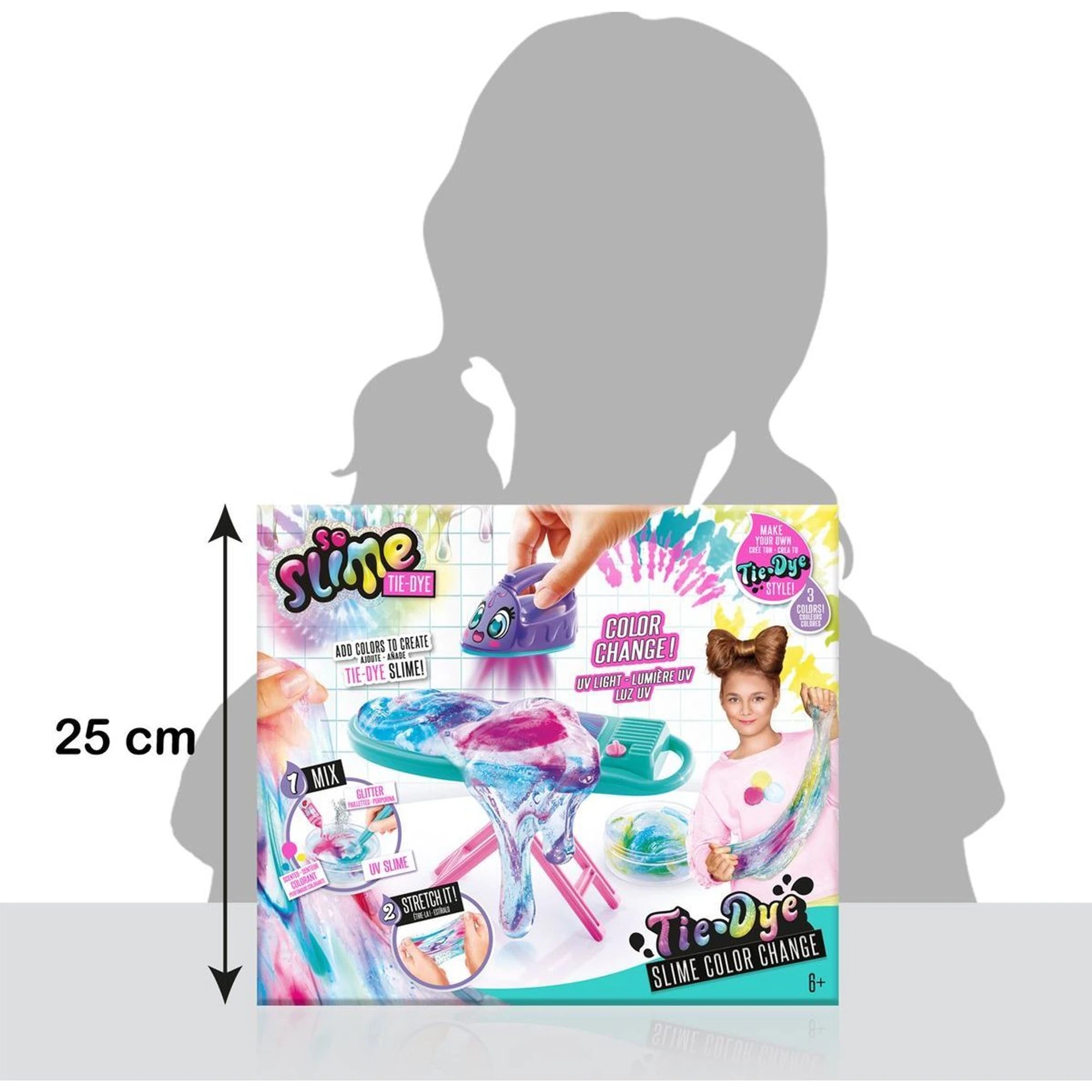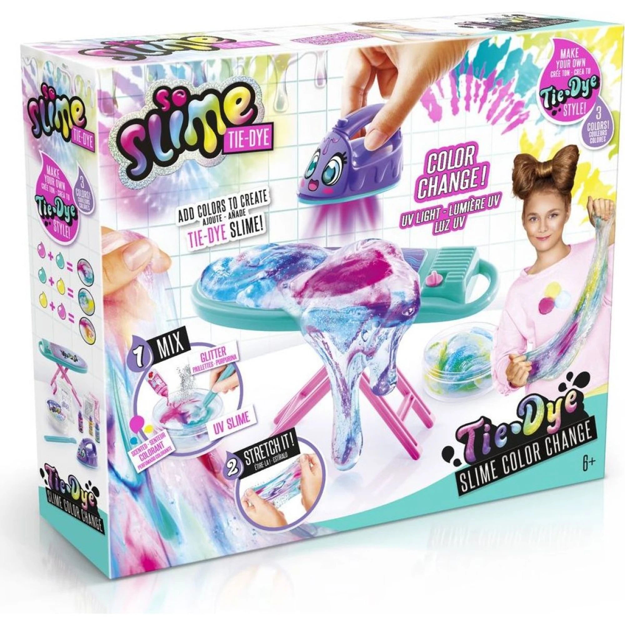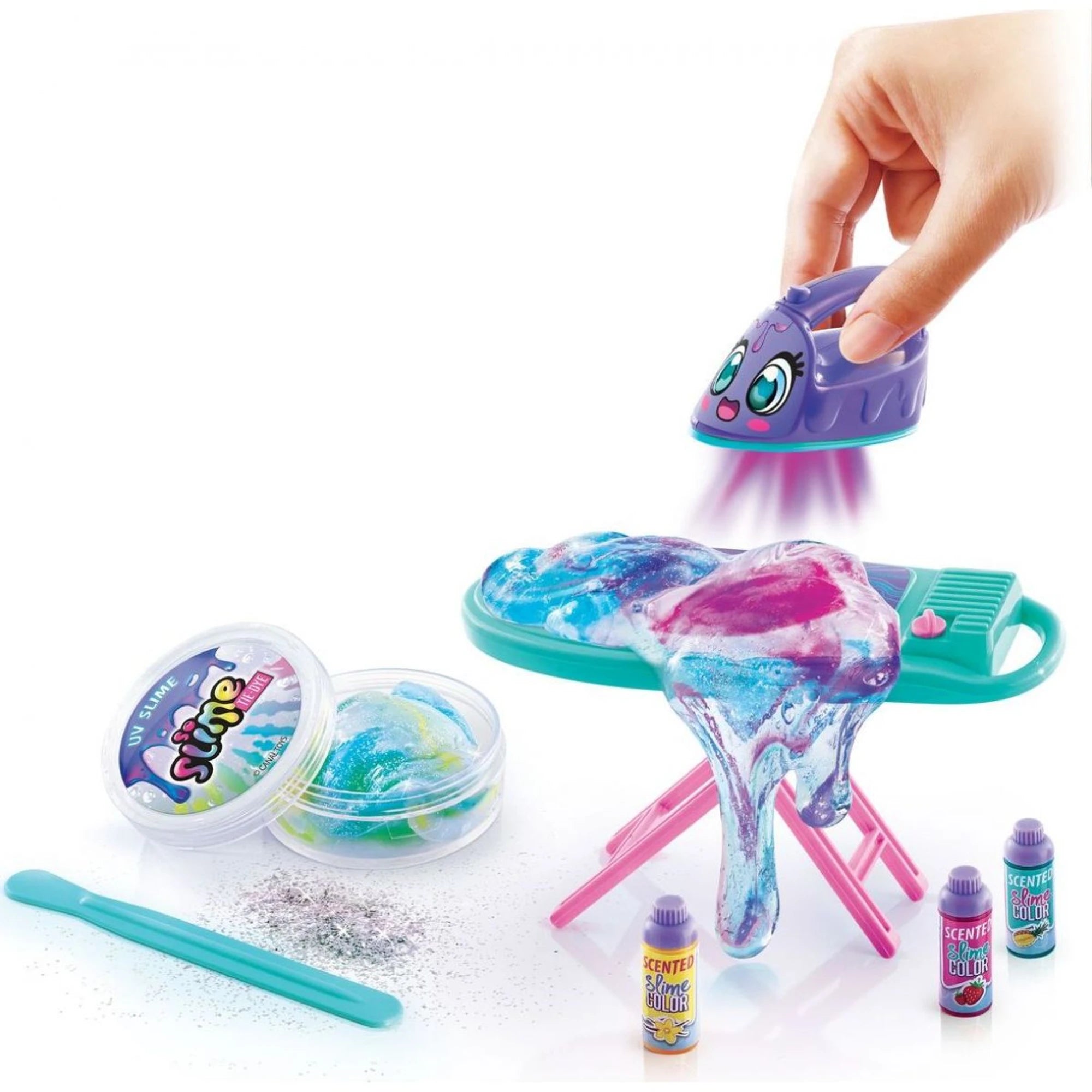 Sada materiálu, která doma roztočí duhovou slizopárty. Bezbarvý sliz mohou obarvit, libovolně kombinovat a přisypat třpytky. Pak ho mohou přežehlit žehličkou s UV světlem a sledovat, jak barvy kouzelně střídá jako pod reflektory. Při natahování barevného slizu mohou cítit jeho vůni.