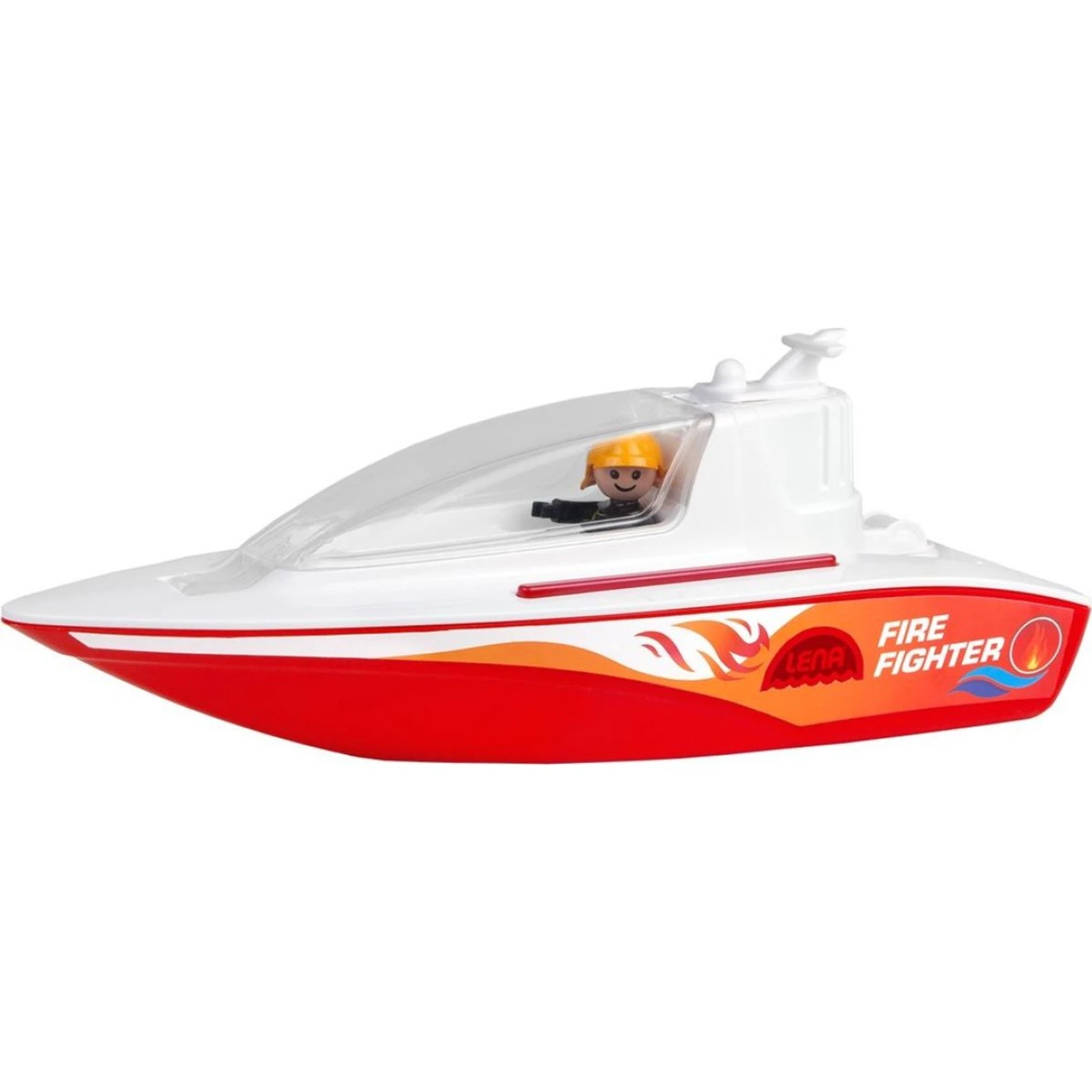 Hasičský člun v parádním červeném odstínu, uvnitř s figurkou řidiče – připravený k zásahu raz dva.