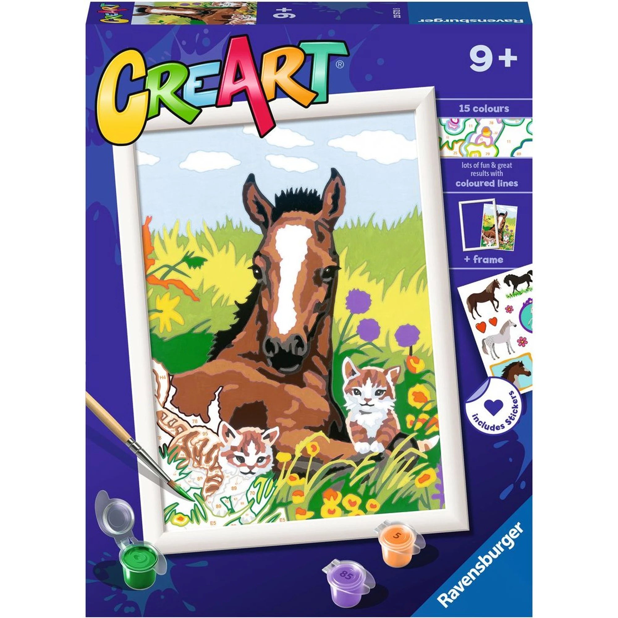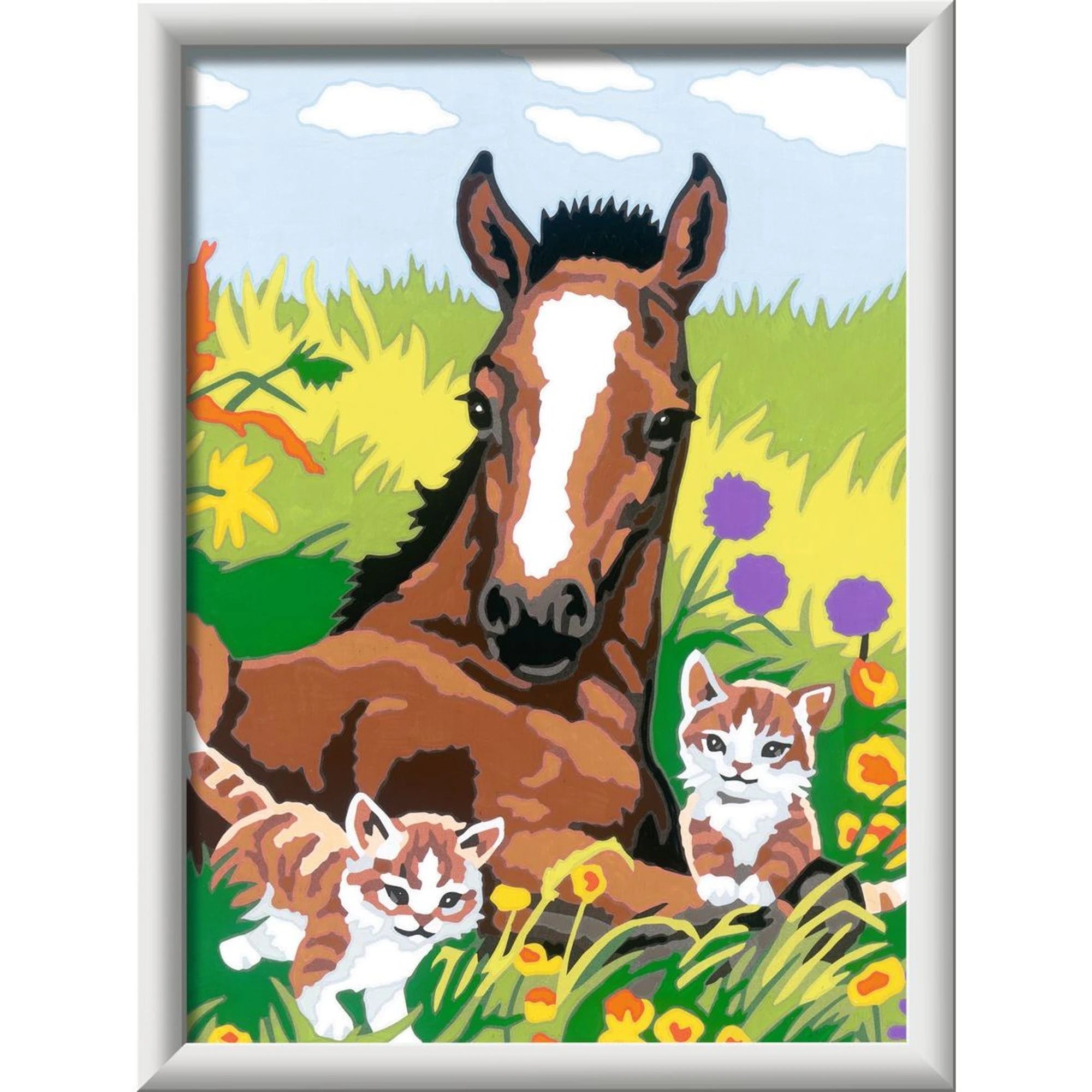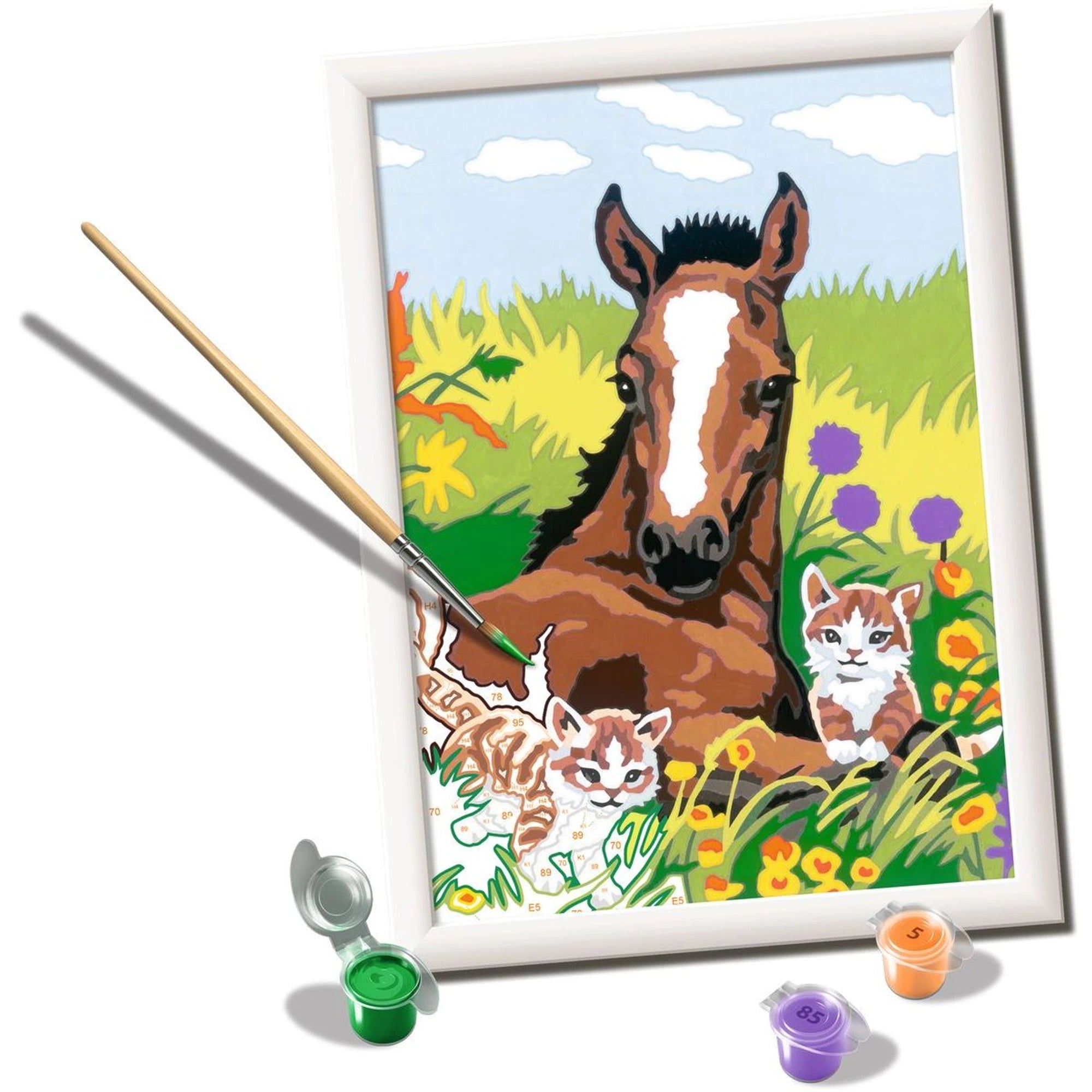 Kůň a koťata jsou hvězdami kreativního setu, který dětem servíruje malování na připravenou plochu. Políčko po políčku – každé číslo má svou barvu – a pod rukama vyroste pestrý obraz.