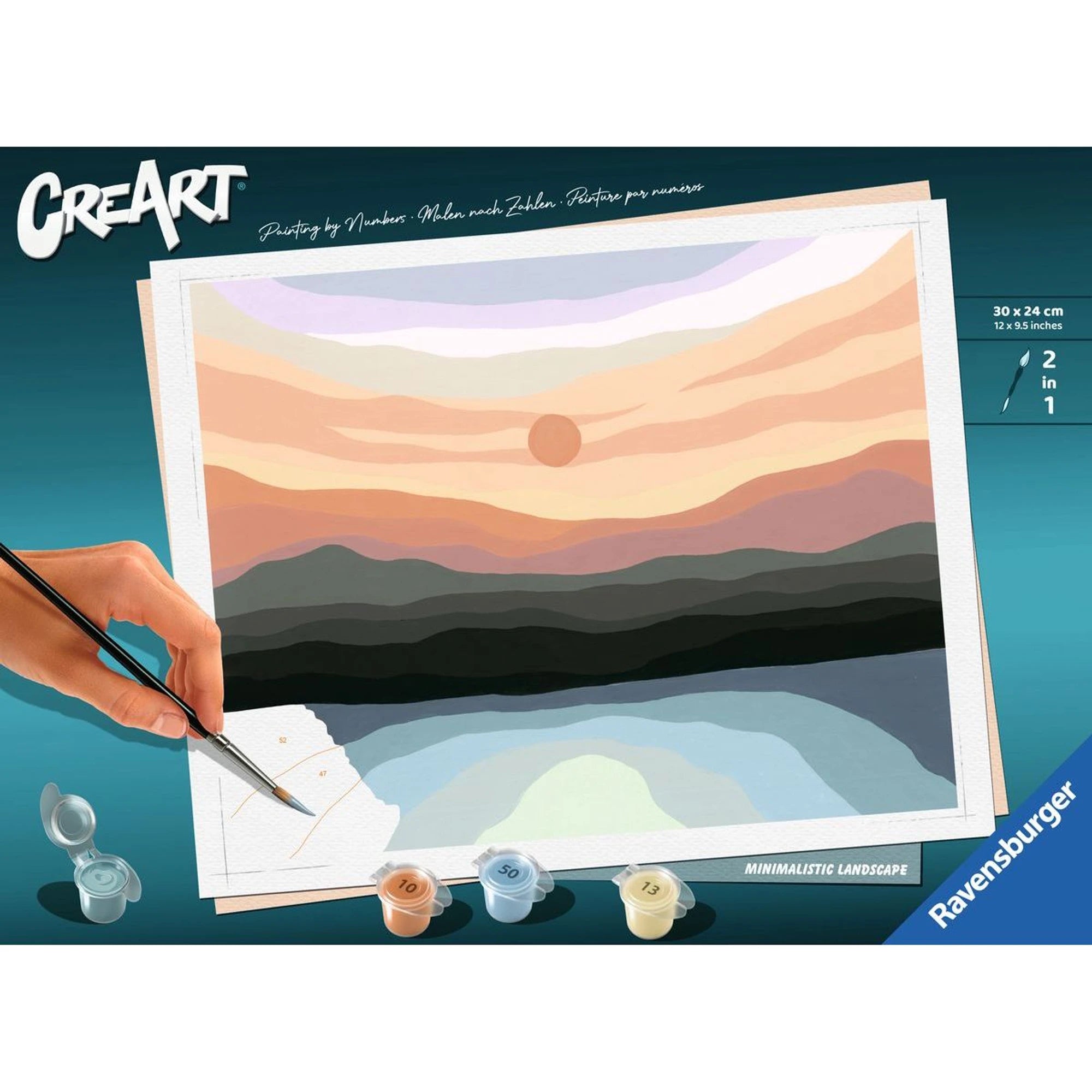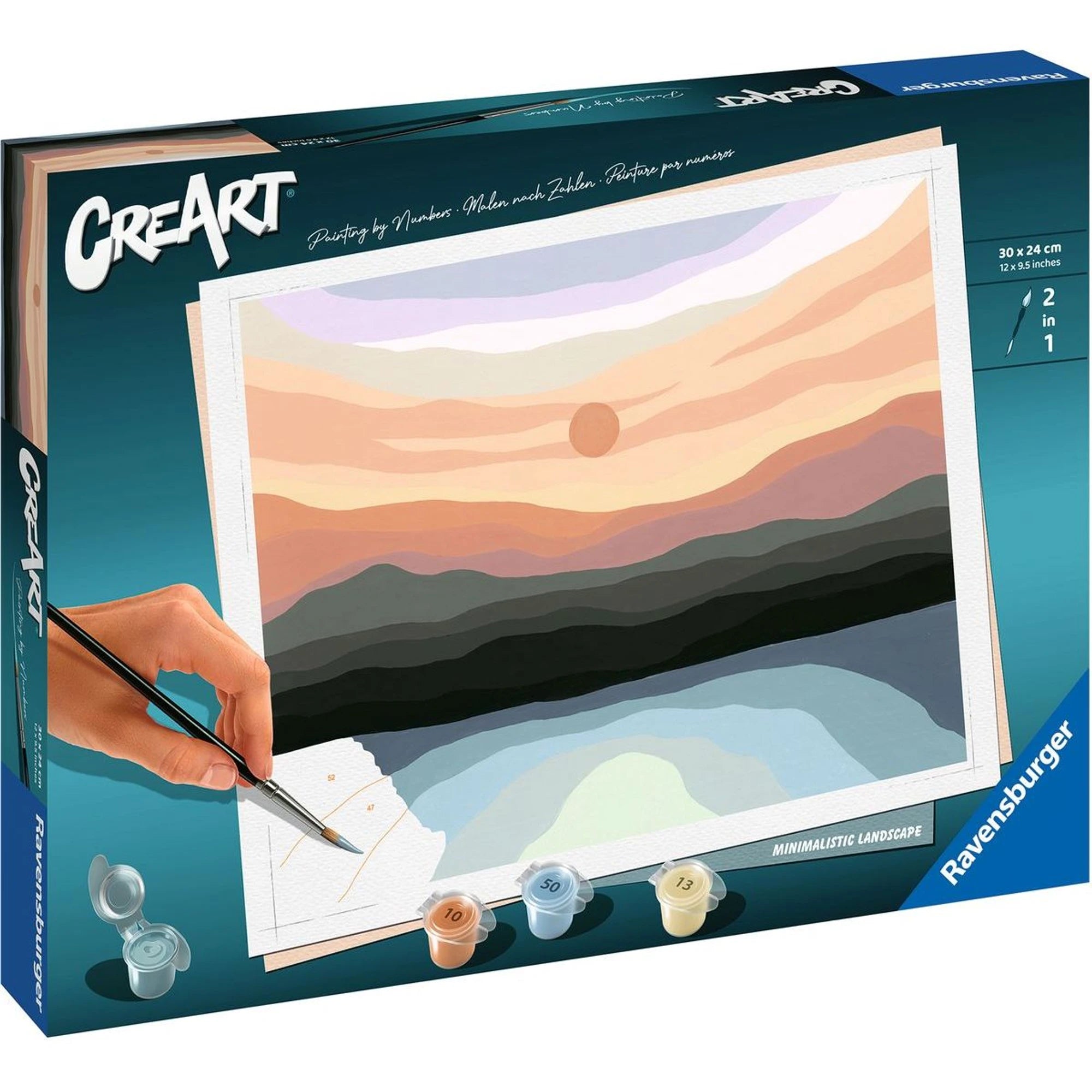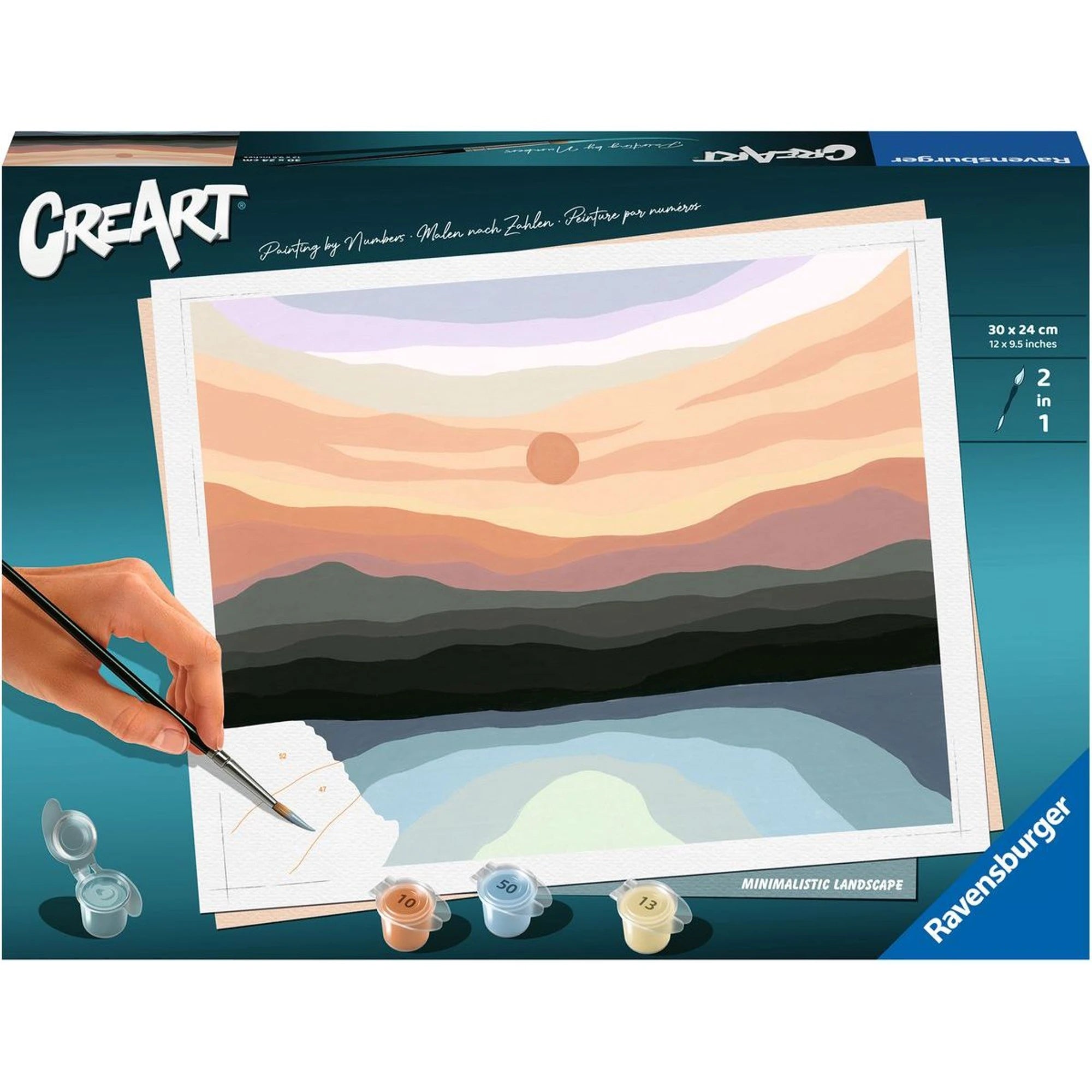 Minimalistická krajina je tématem hravého kreativního setu, který posílá děti malovat na připravenou plochu. Plošky stačí vybarvovat podle čísel – každé číslo patří jedné barvě – a před očima se rodí barevný obraz.