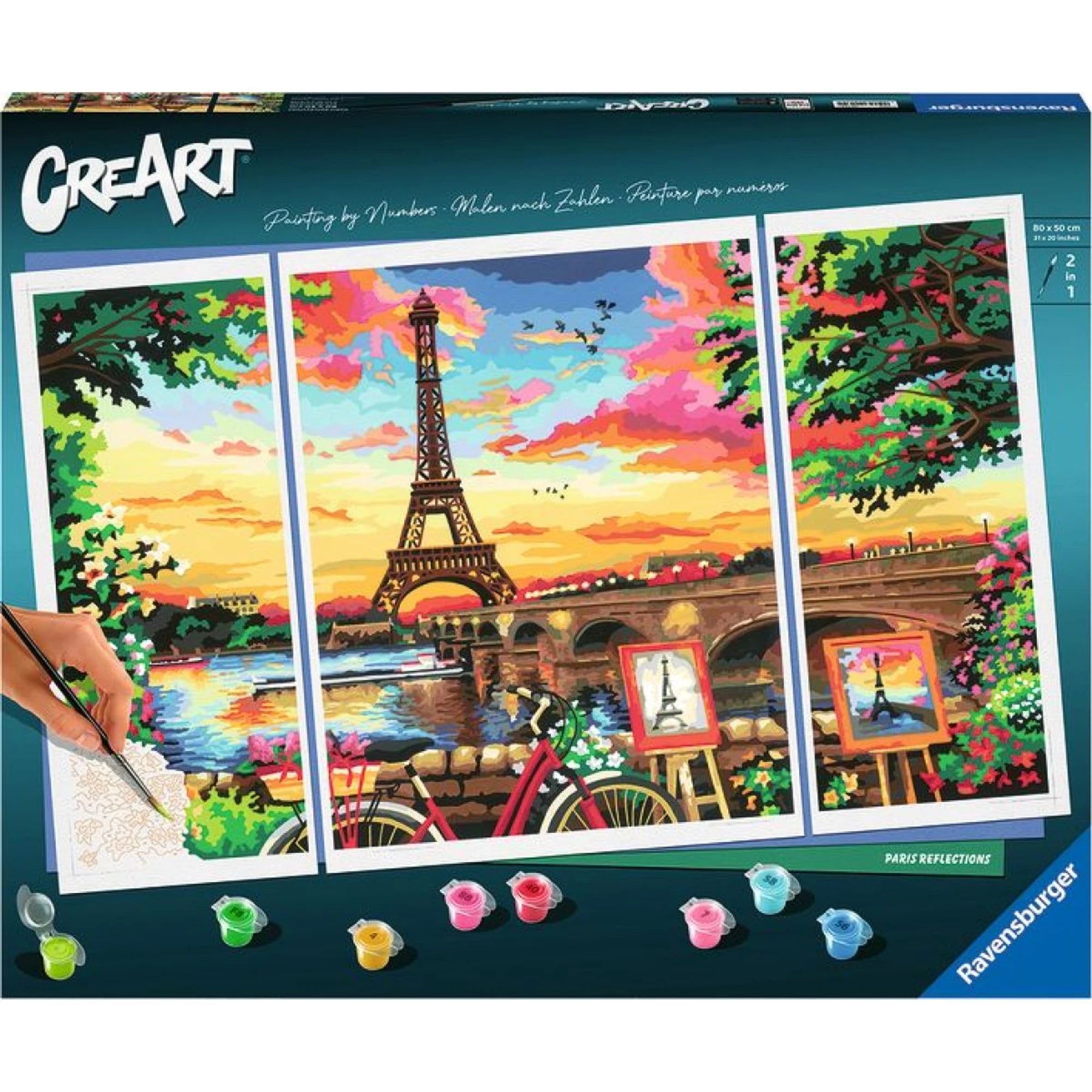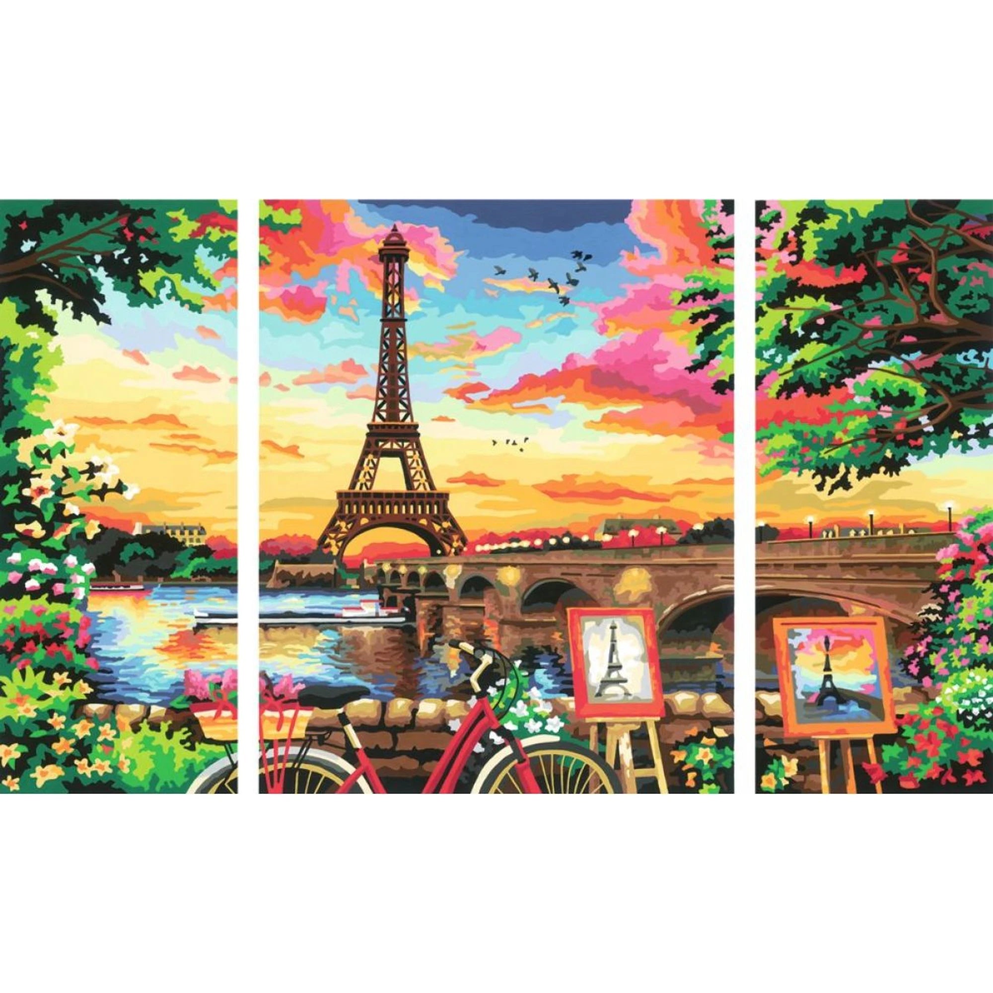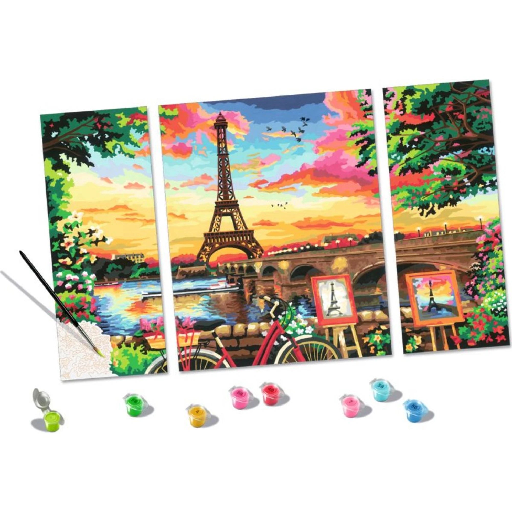 Břeh Seiny je námětem kreativního setu, který dětem servíruje malování na připravené plátno bez stresu z „co teď“. Stačí vybarvovat očíslované plošky – každé číslo má svou barvu – a před očima dětí vyroste barevný obraz s pařížskou náladou.