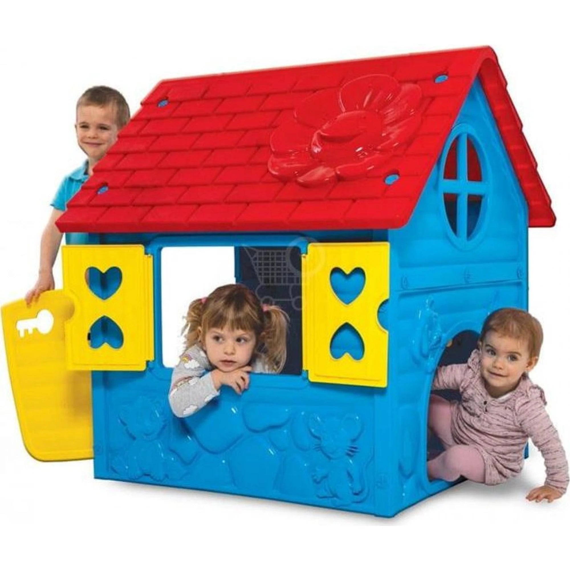 Plastové stěny jsou modré, otevíravé dveře a okenice září žlutě. Střecha je ozdobená strukturální květinou a na stěnách se zabydlela zvířátka – aby to tam mělo správnou pohádkovou atmosféru.
