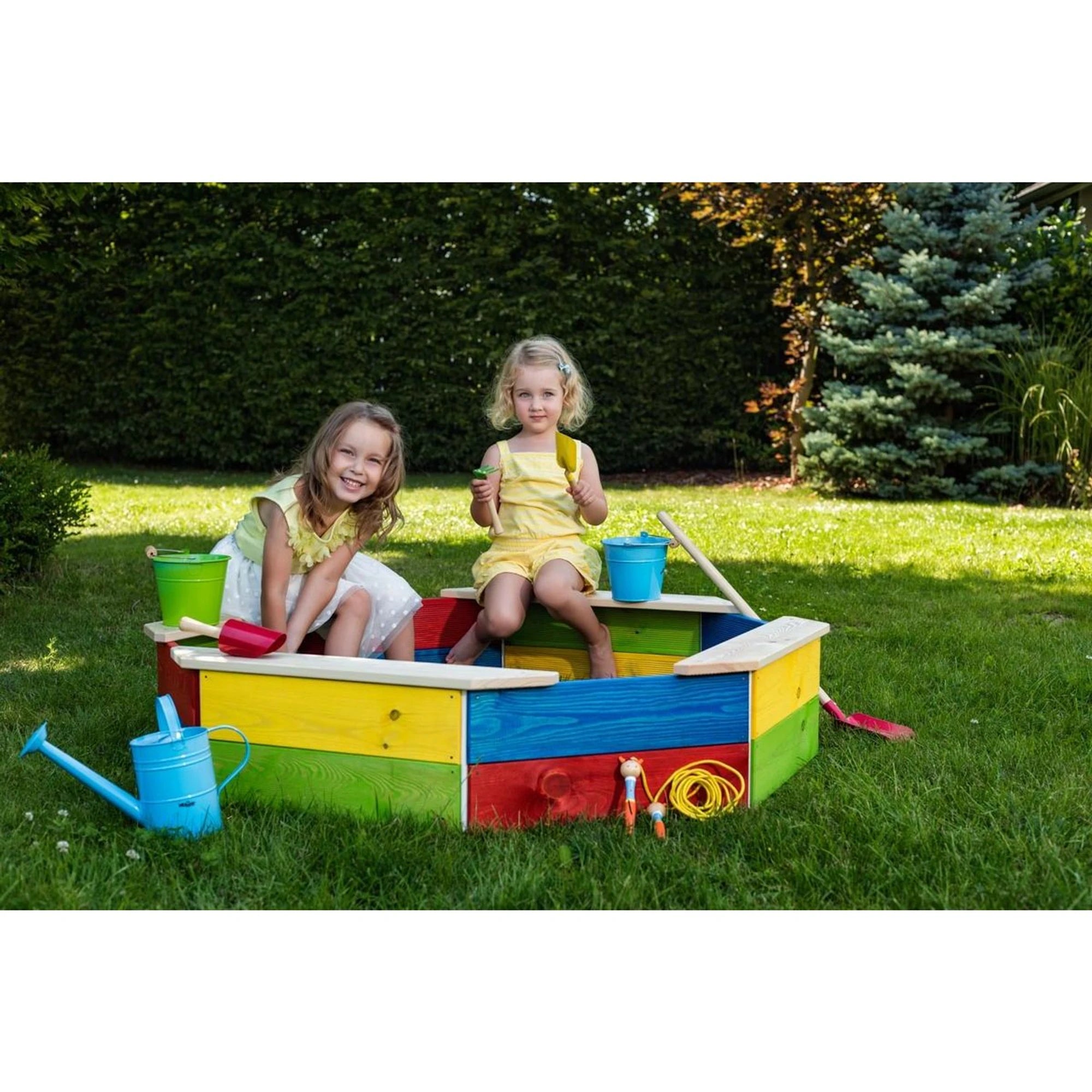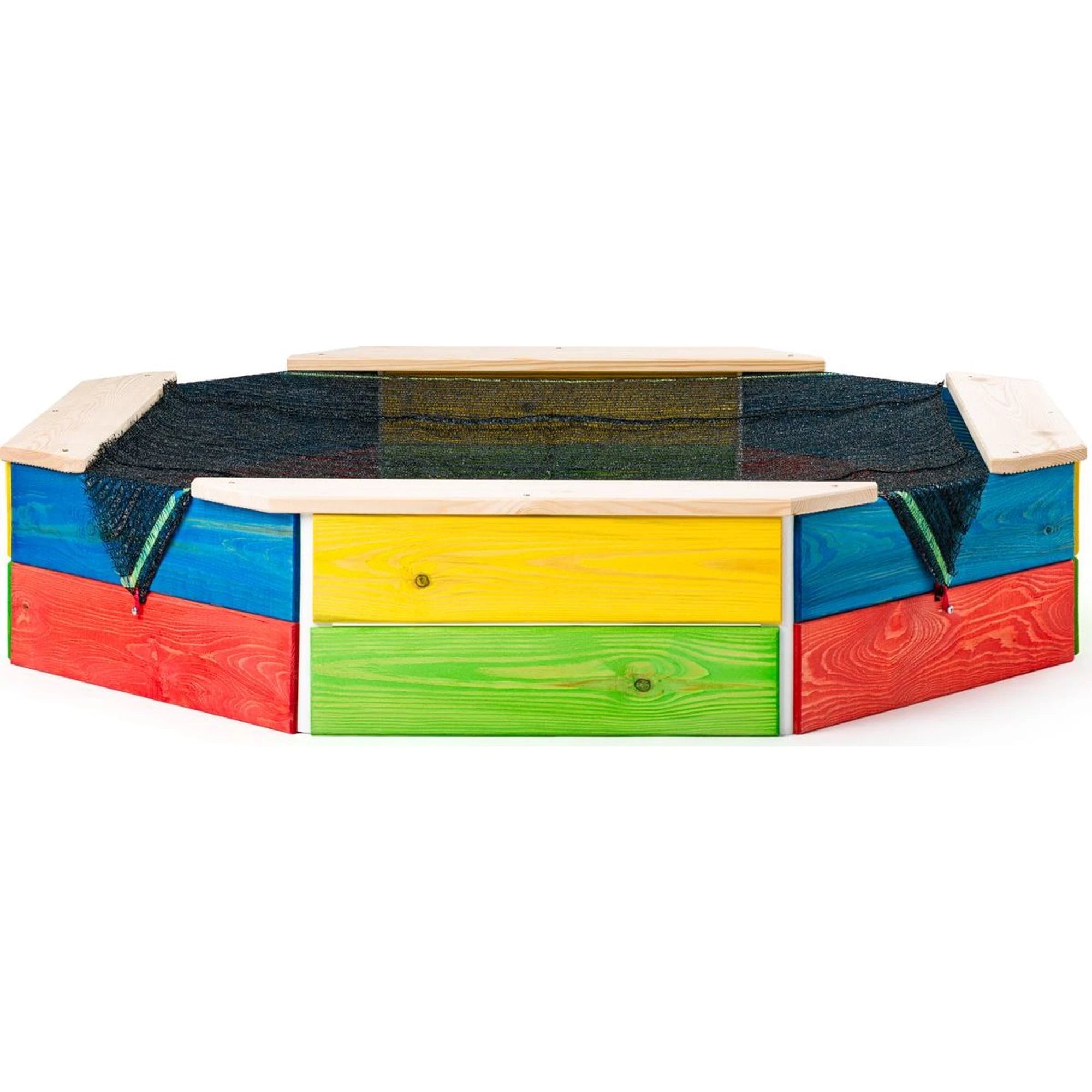 Dřevěné pískoviště je poskládané z barevných stěn do tvaru osmihranu – takové malé pískové království, co vypadá, že to myslí vážně.