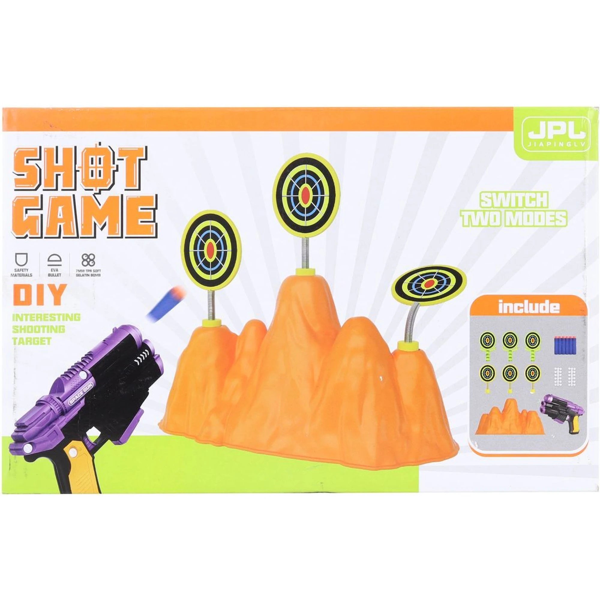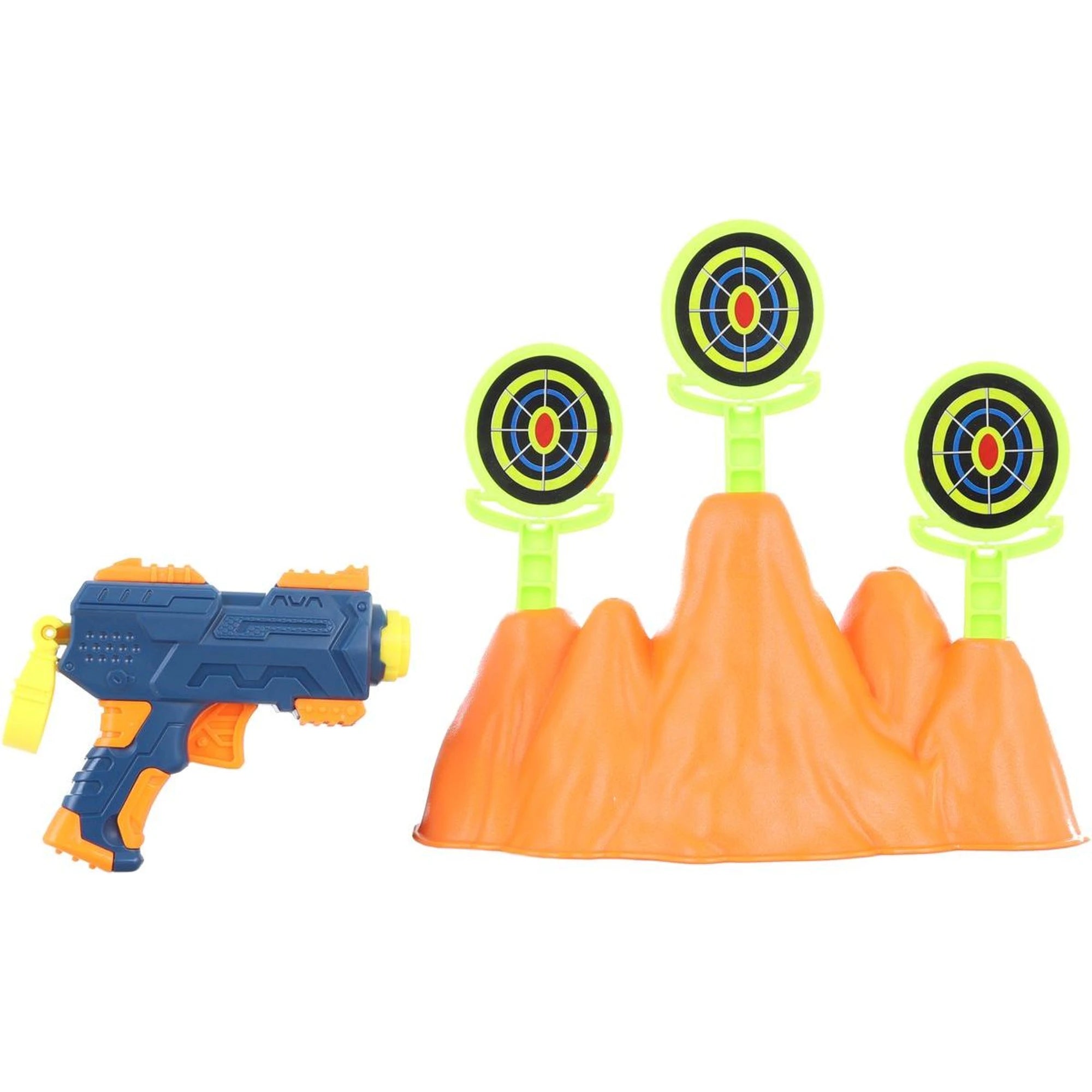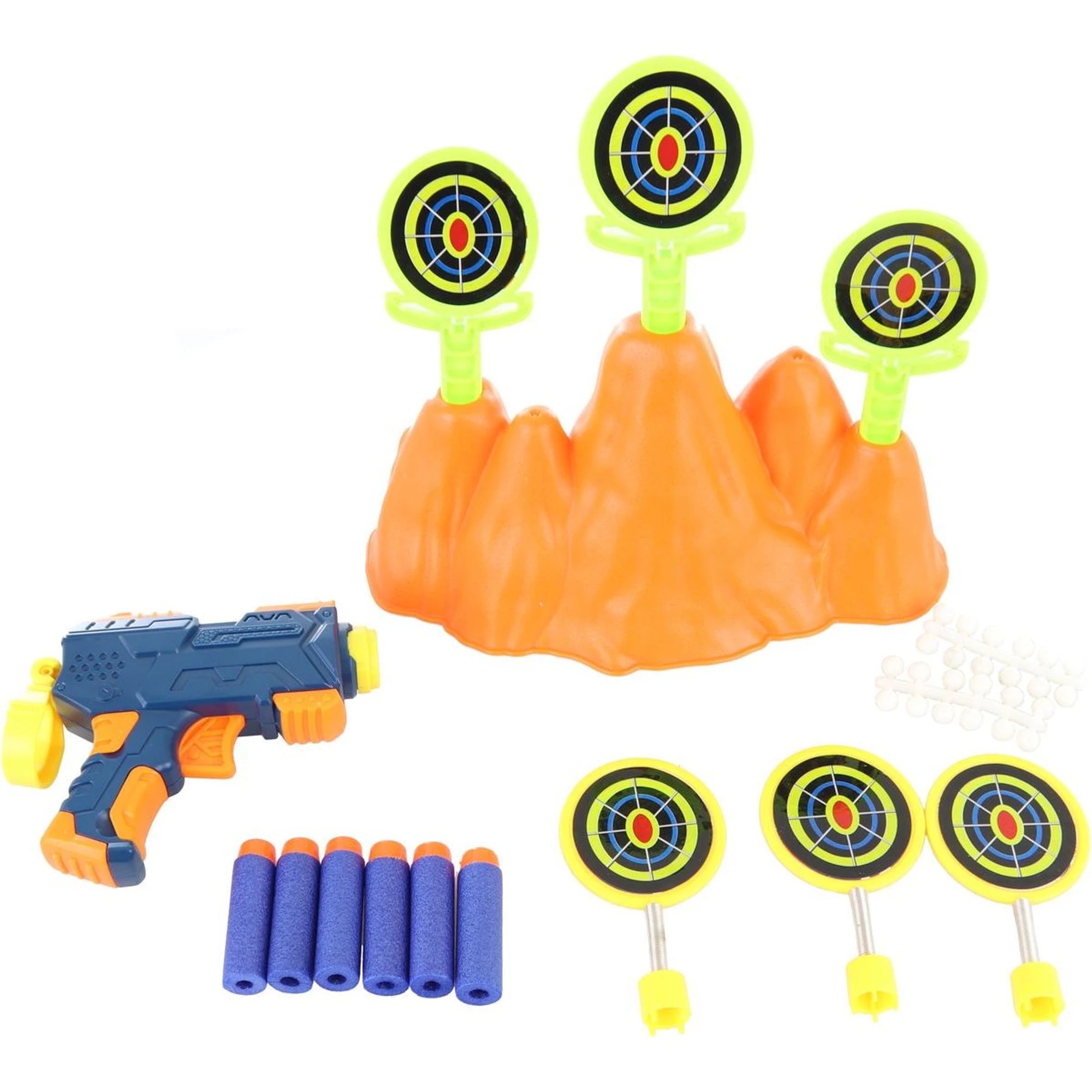 Pistole s připravenou zásobou pěnových nábojů rovnou v balení? Přesně tak! Natáhnout, zamířit a šup – střelba na terčíky může začít. Terče se usadí na vyvýšeninu, která si hraje na malý terénní kopeček.