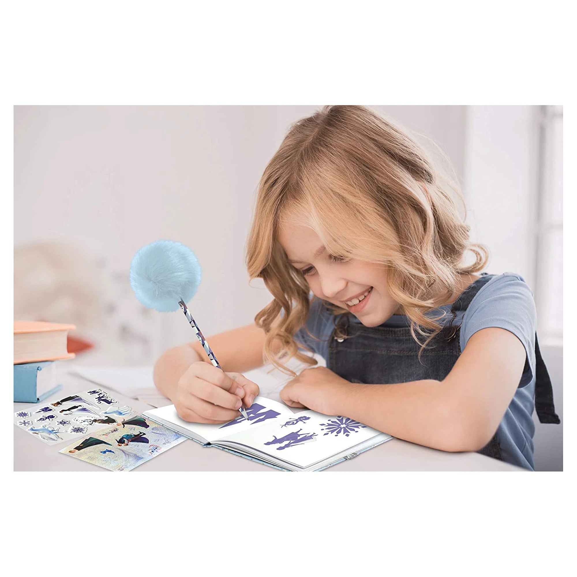 1x diář, 1x lepicí role, 1x bambulkové pero, 1x zámek, 2x klíč, 5x fixa, 2x arch samolepek