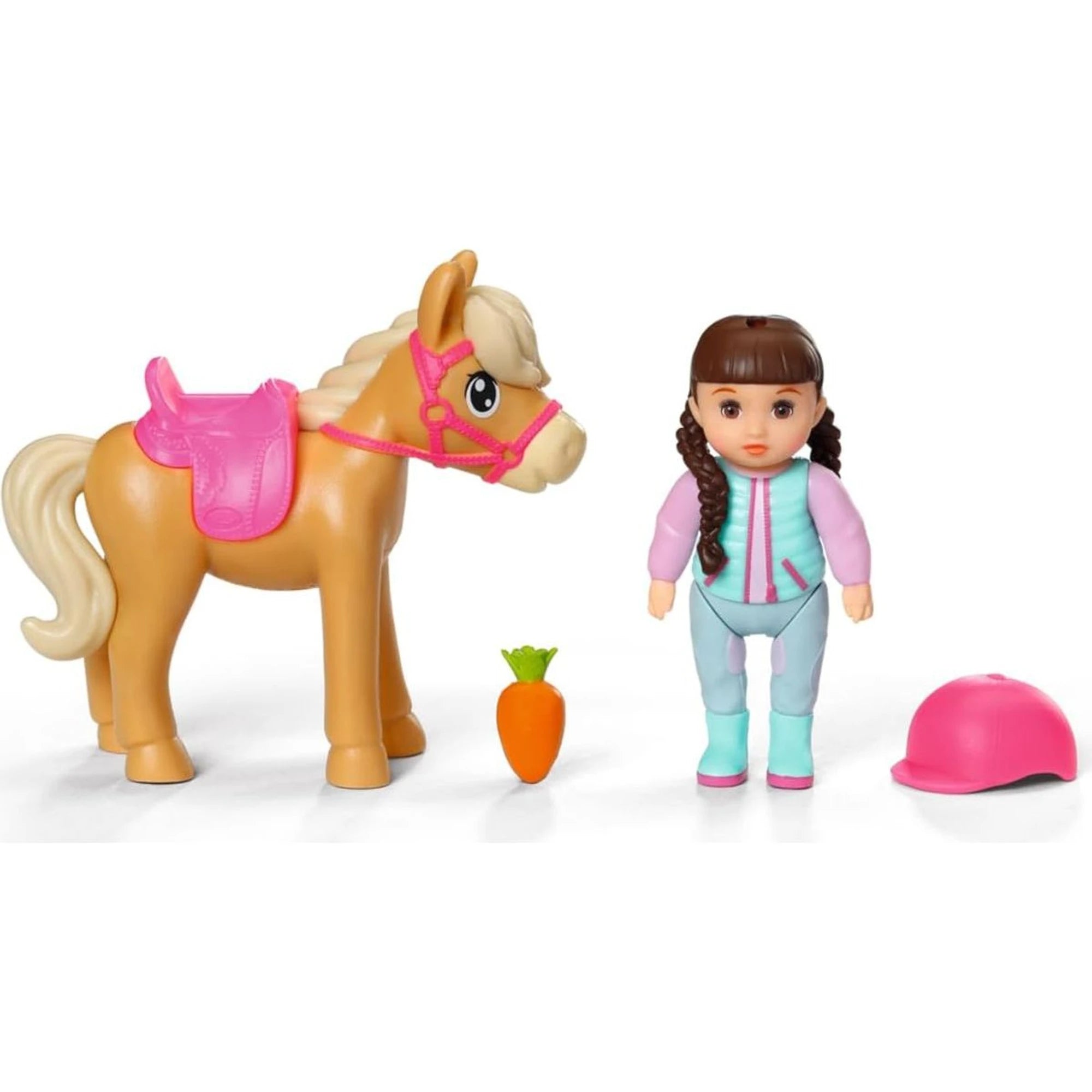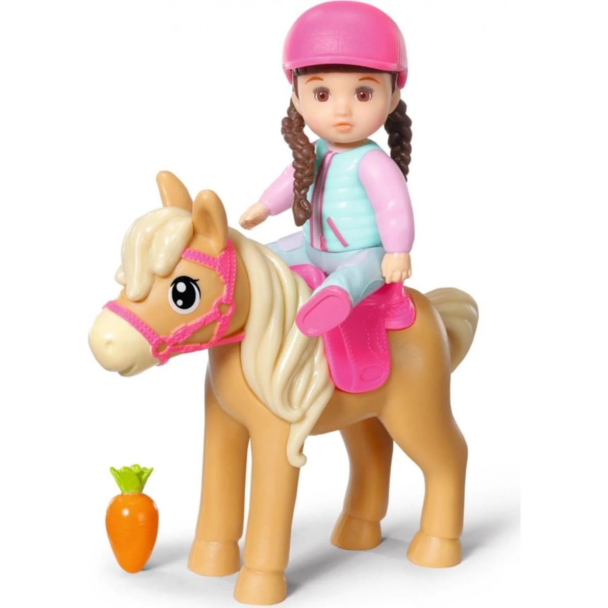 Holčičky můžou posadit panenku do růžového sedla a vyrazit s ní i koníkem na projížďku. K ruce je i mrkvička – ideální svačinka a motivace pro čtyřnohého fešáka.