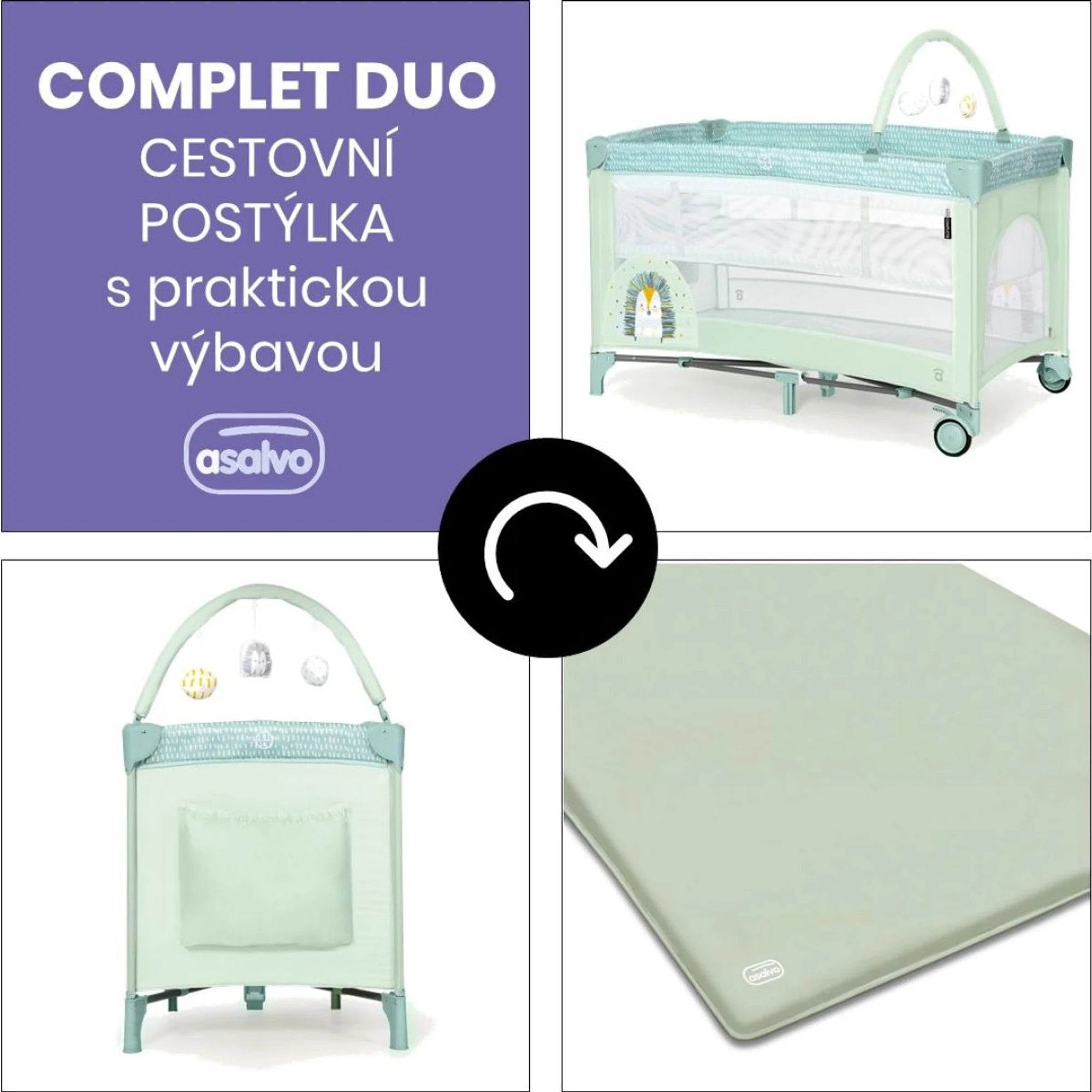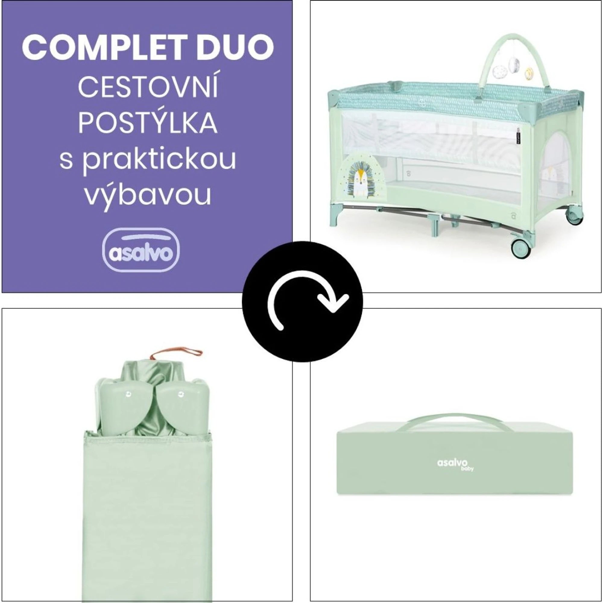Cestovní postýlka COMPLET DUO umí skloubit bezpečí a praktičnost tak, že se rodičům chce tleskat (potichu, ať se miminko nevzbudí). Dva síťované boky se postarají o ideální cirkulaci vzduchu, dvě kolečka s brzdou zase o to, že se s ní manipuluje bez zbytečného posilování.