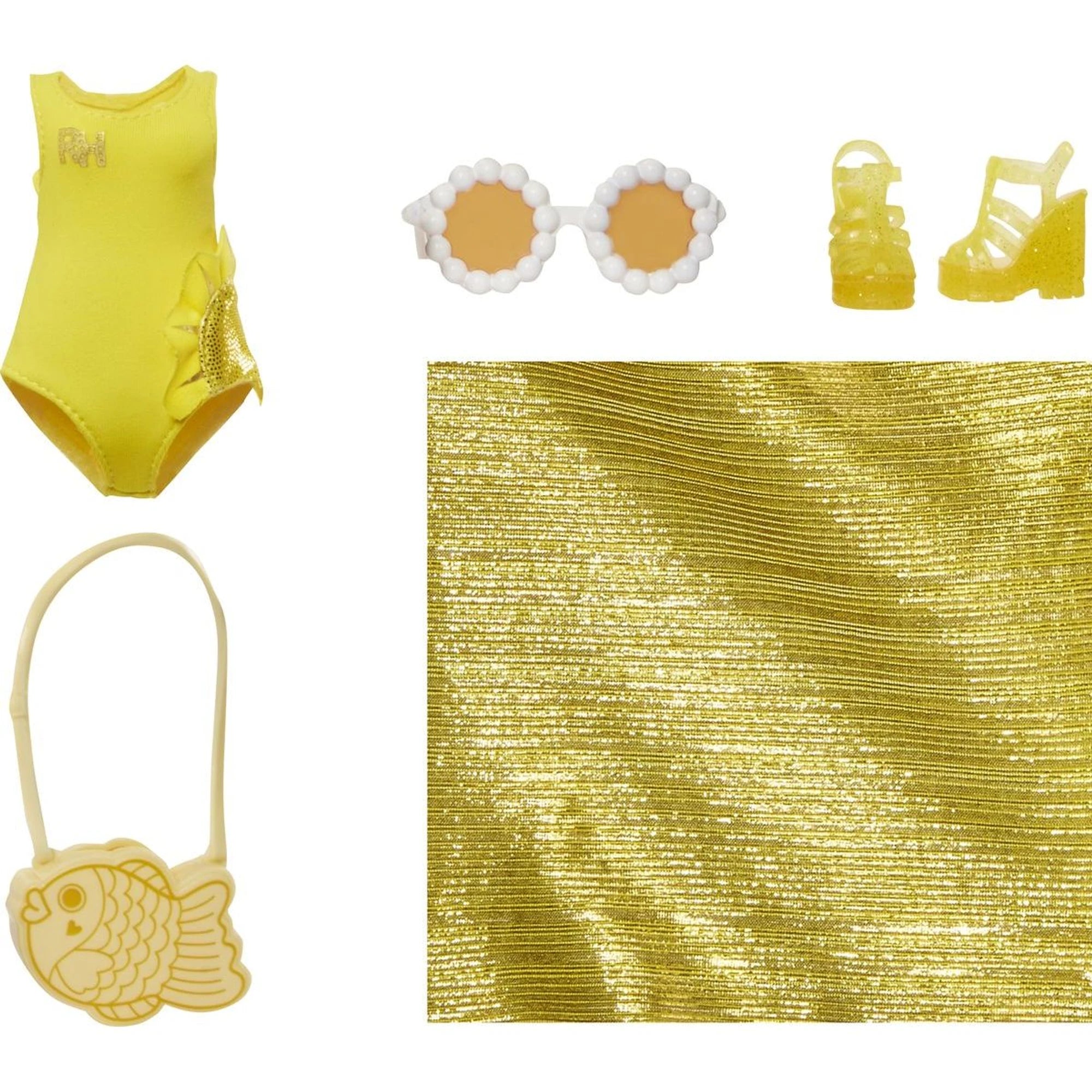 Na sobě má jednodílné plavky a kolem pasu šátek – styl i k bazénu. Doplňují ji sluneční brýle. Celá je laděna do žluté, včetně kadeřavých vlasů. V balení najdeš spoustu doplňků a šátek, se kterým vytvoříš více než 10 looků.