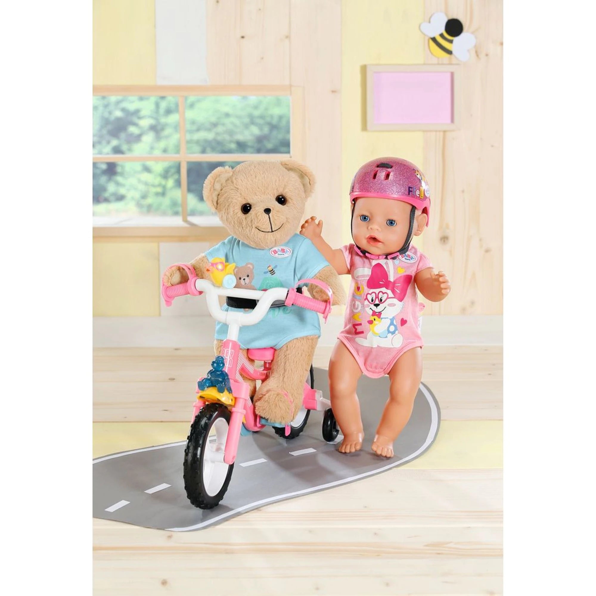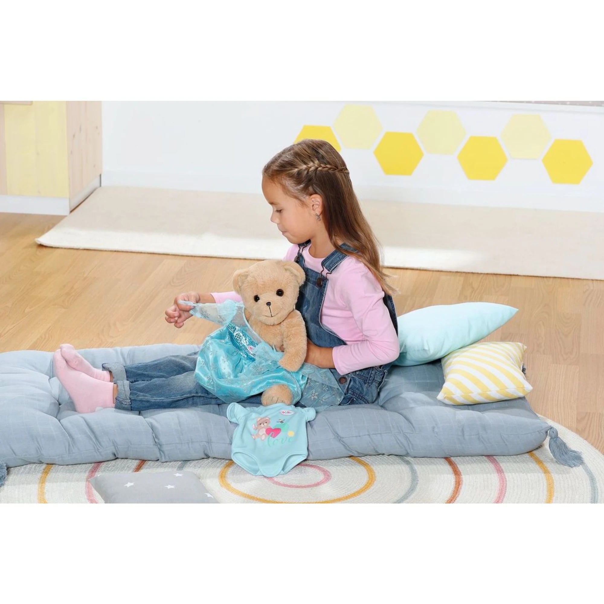 Je oblečen do slušivého modrého oblečku – elegantní jak malý gentleman. Další oblečky a doplňky jsou v nabídce samostatné módní kolekce. Medvídek je navržen tak, aby mu sedělo téměř všechno oblečení pro Baby Born velikosti 43 cm.