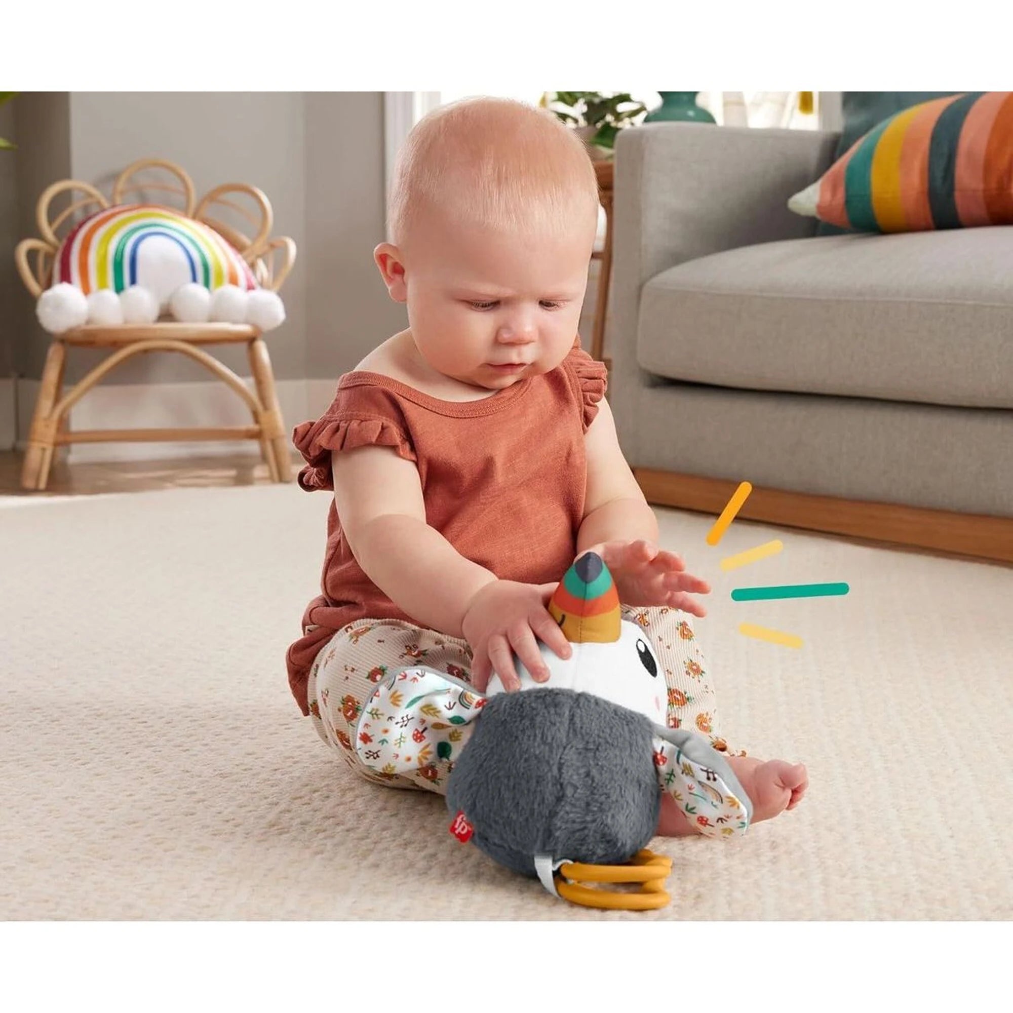 Snadno se připne klipem na postýlku nebo kočárek. Malé prstíky si pohmatem užijí různorodé materiály, ze kterých je tukan ušitý.