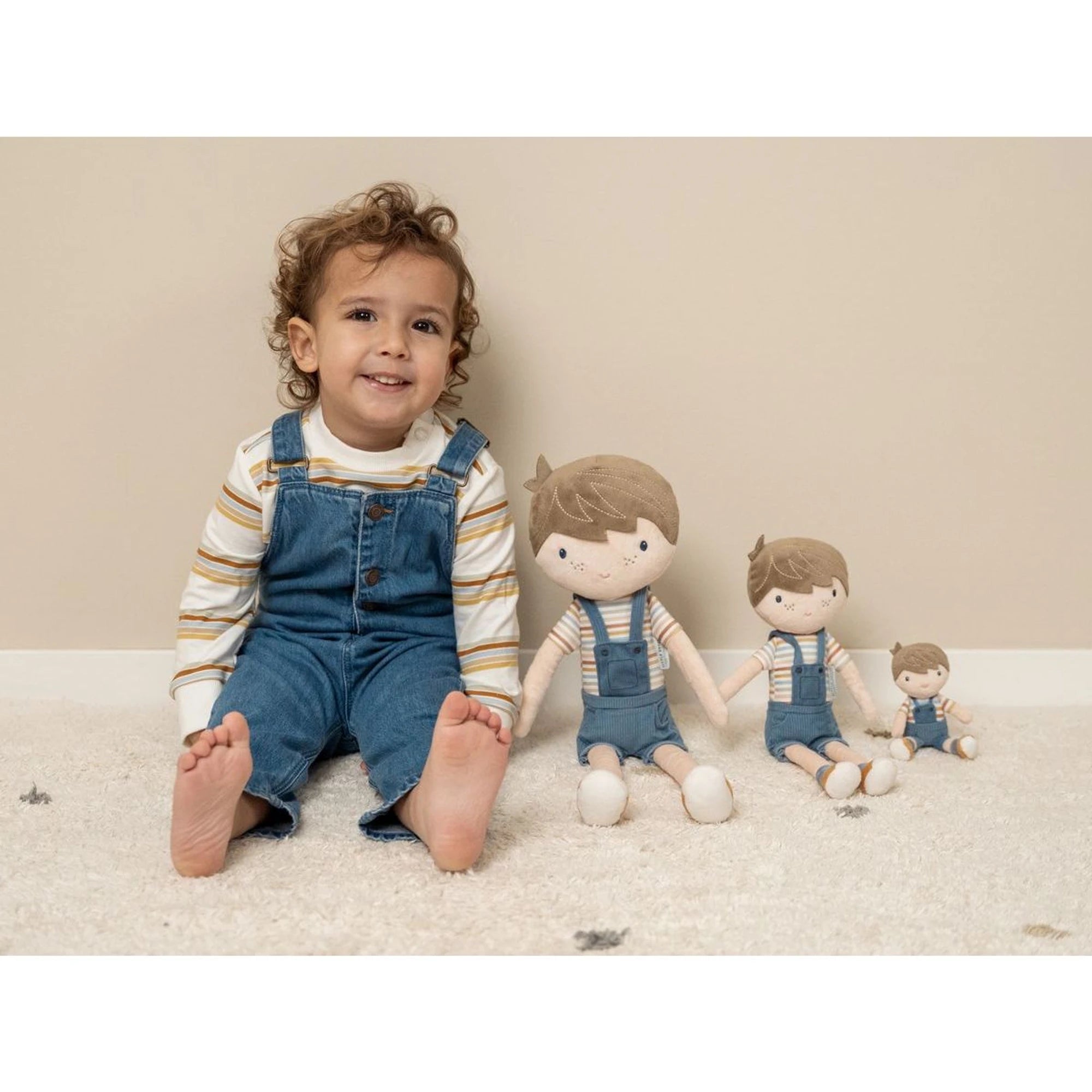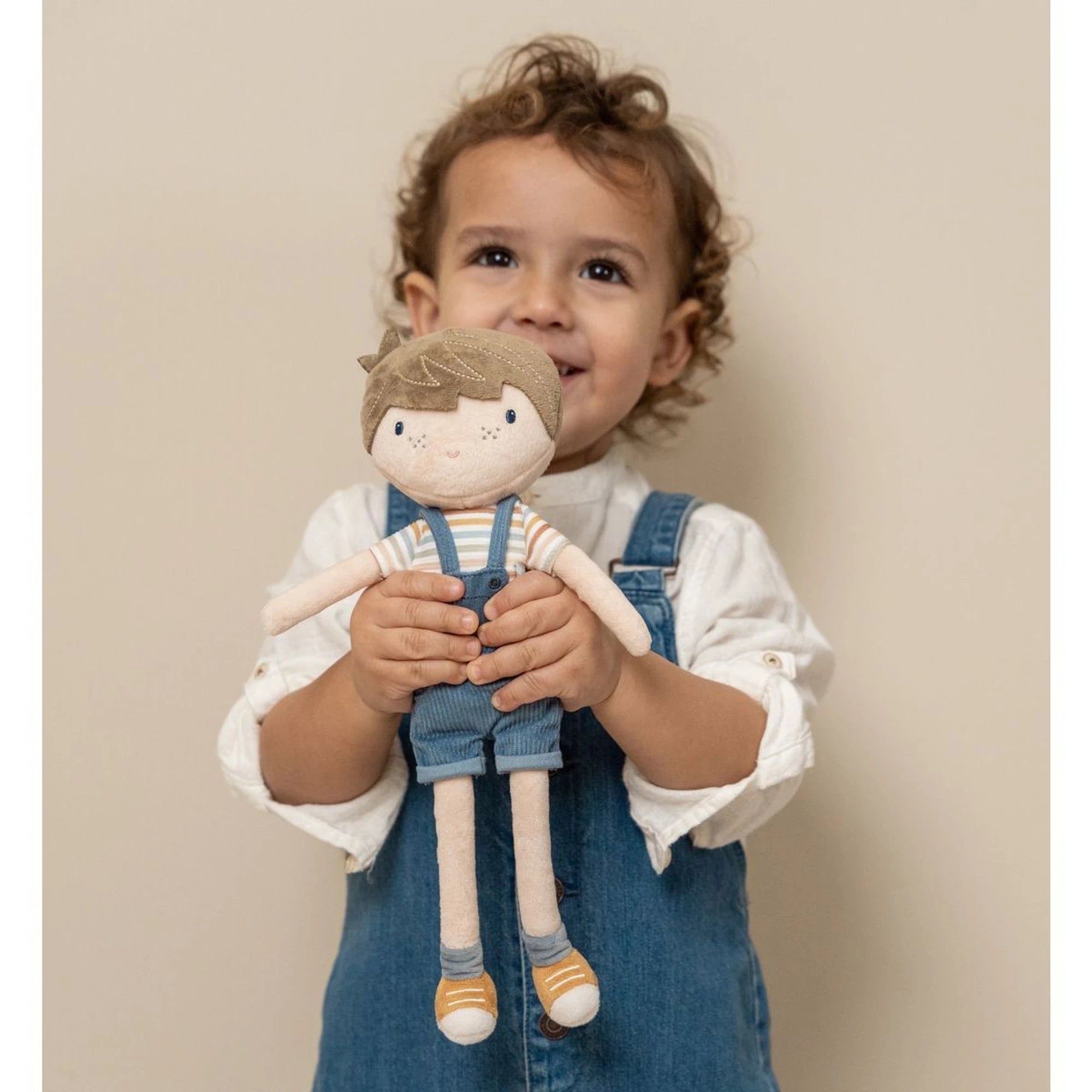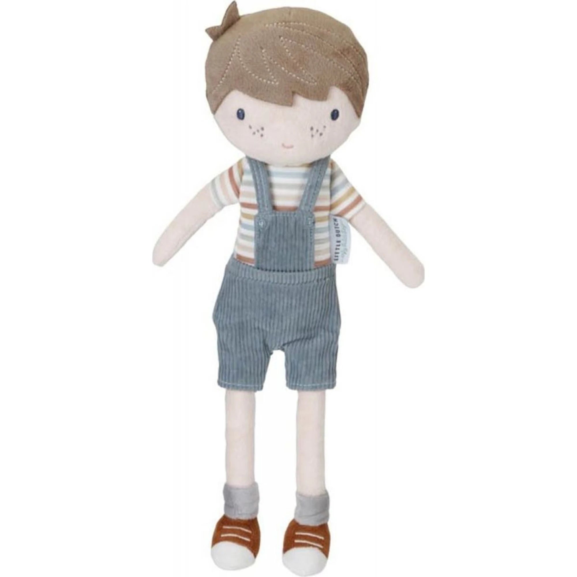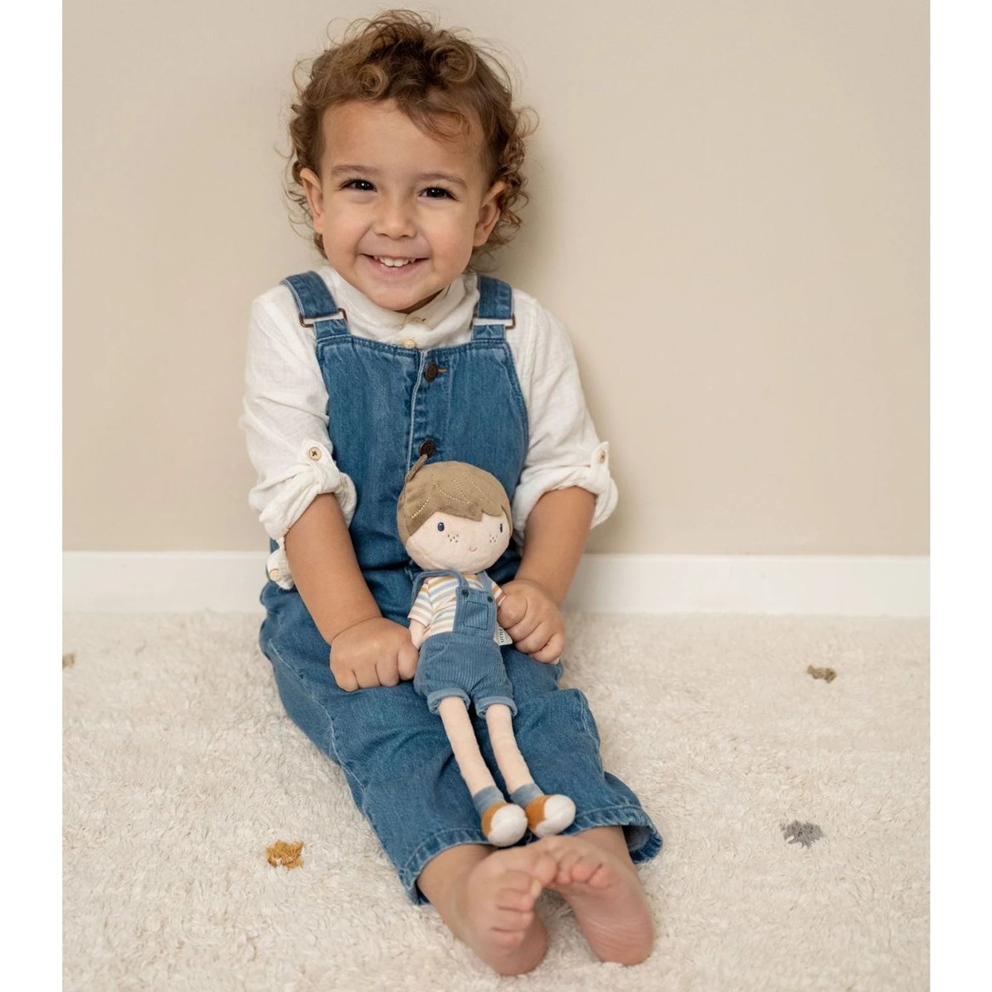 Jim je oblečen do krátce střižených kalhot s laclem a trička s krátkým rukávkem – praktický fešák, co se umí mazlit. Při výrobě hraček Little Dutch se dbá na kvalitu výrobků a bezpečnost (tohle já fakt oceňuji). V nabídce této značky jsou látkové panenky, dřevěné kostky, hudební i motorické hračky – parádní výbava pro malé objevitele.