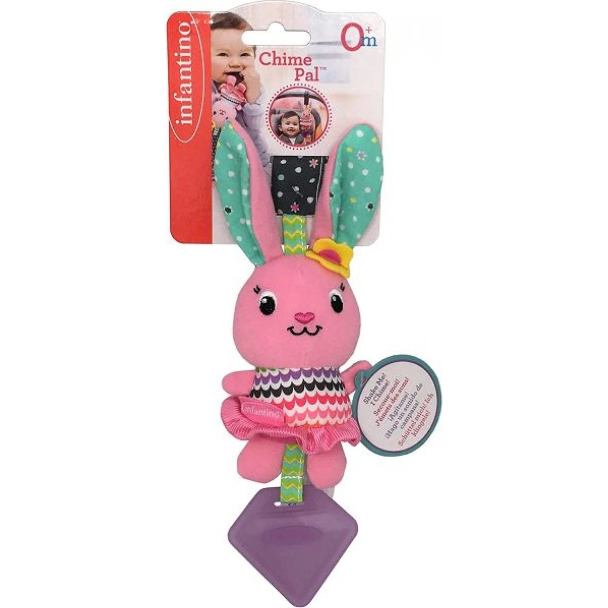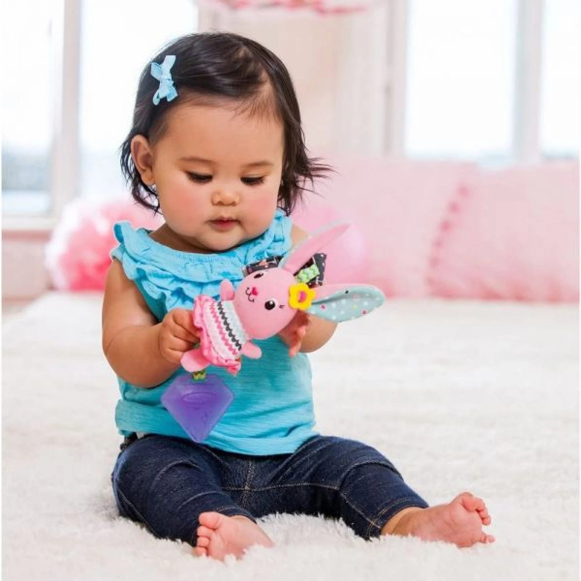 Růžový králíček skáče rovnou do akce – je to závěsná hračka s poutkem na suchý zip. Malým pozorovatelům naservíruje pestré barvy a tvary a do ručiček různé struktury, které lákají k ohmatání. Černobílé prvky? Šikovná výpomoc pro úplně nejmenší, kterým se barevné vidění teprve probouzí. A dole kousátko – první zoubky si na něm odfrknou a nateklé dásně si oddechnou.