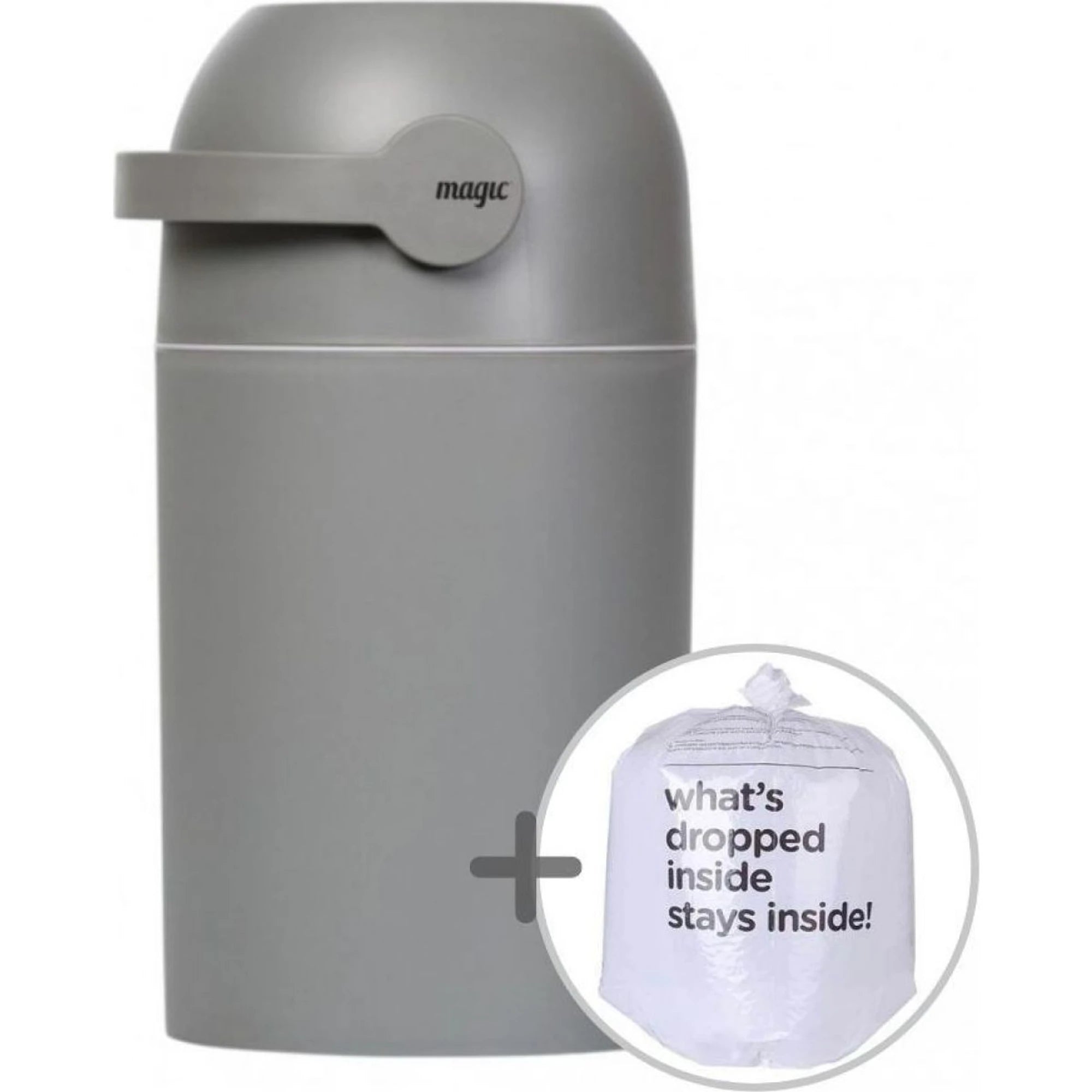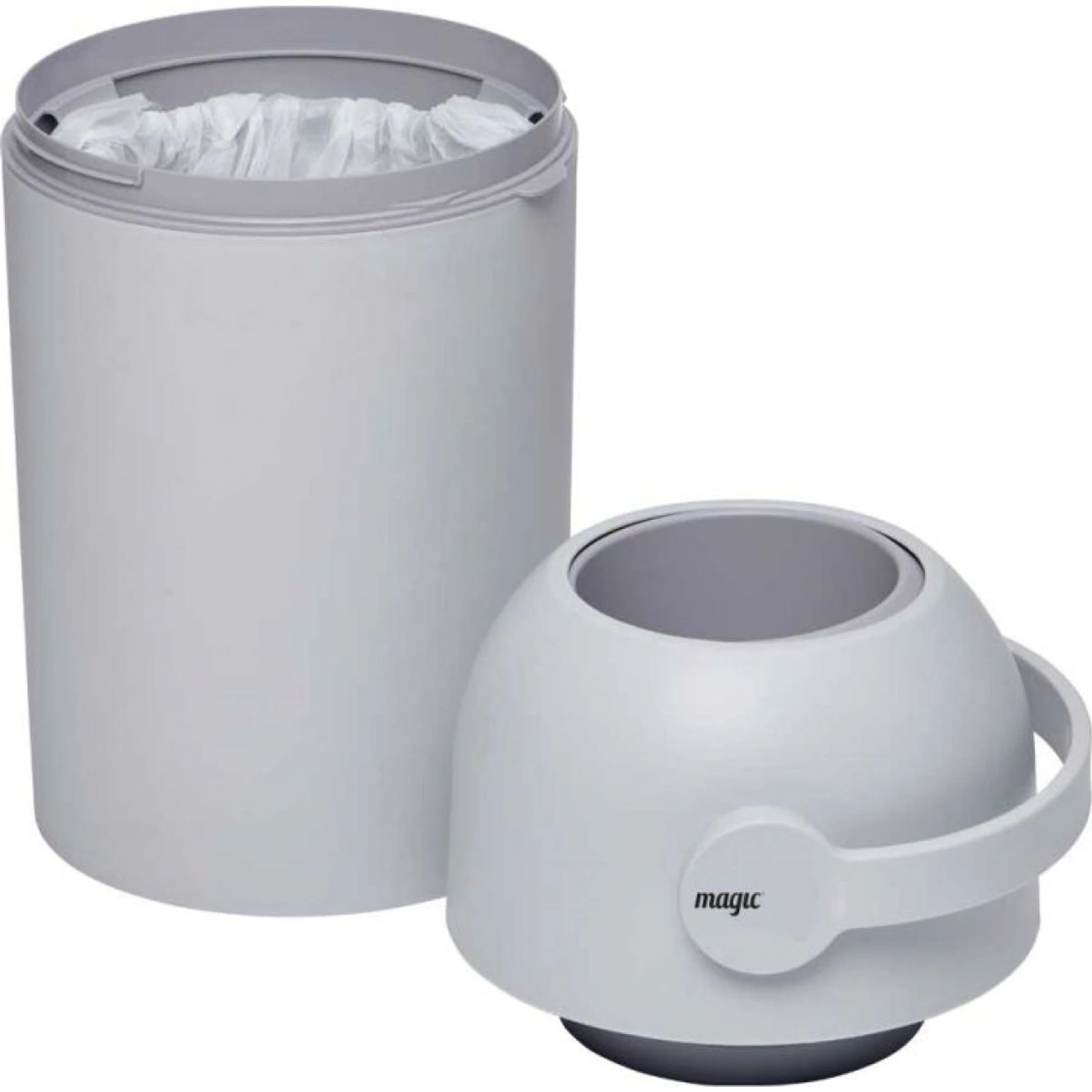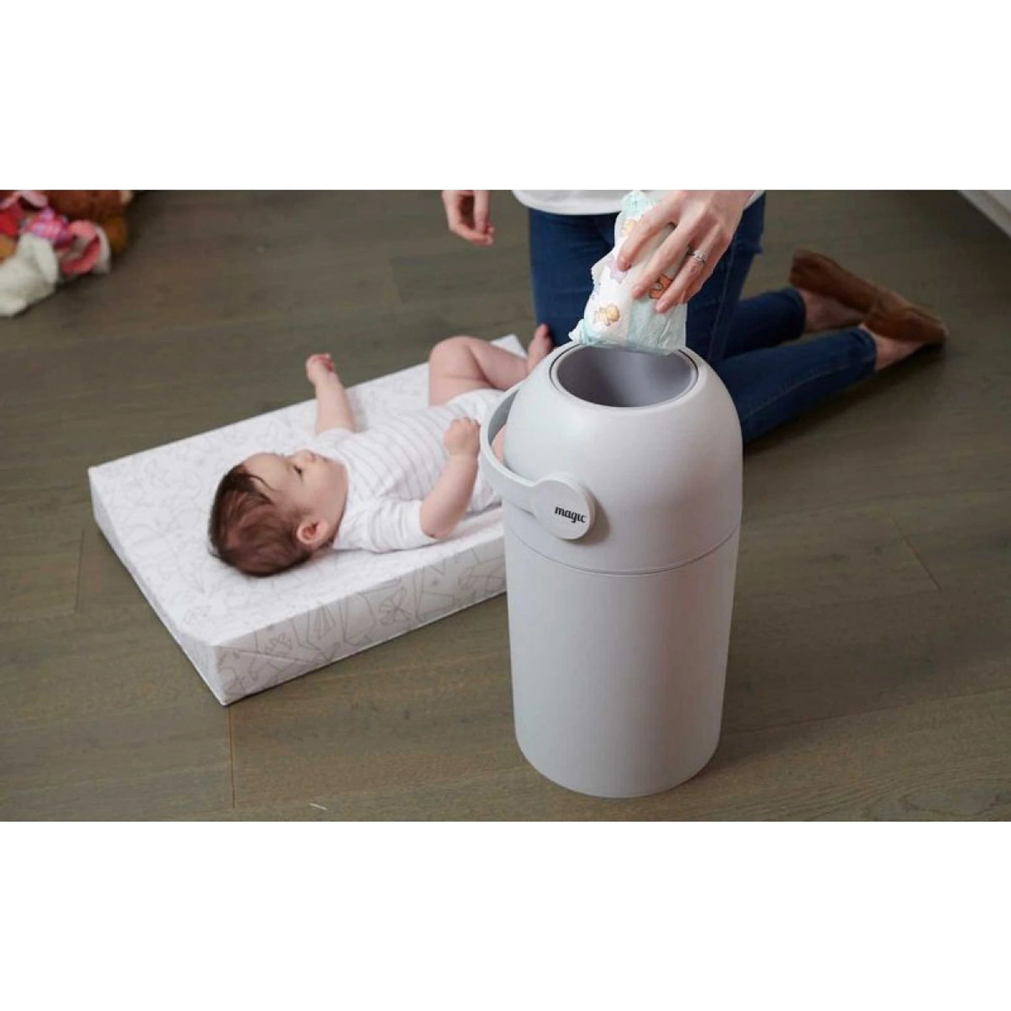 Patentovaný koš na pleny Magic je tichý hrdina přebalovací stanice – pohodlně spolkne použité pleny a doma je klid.