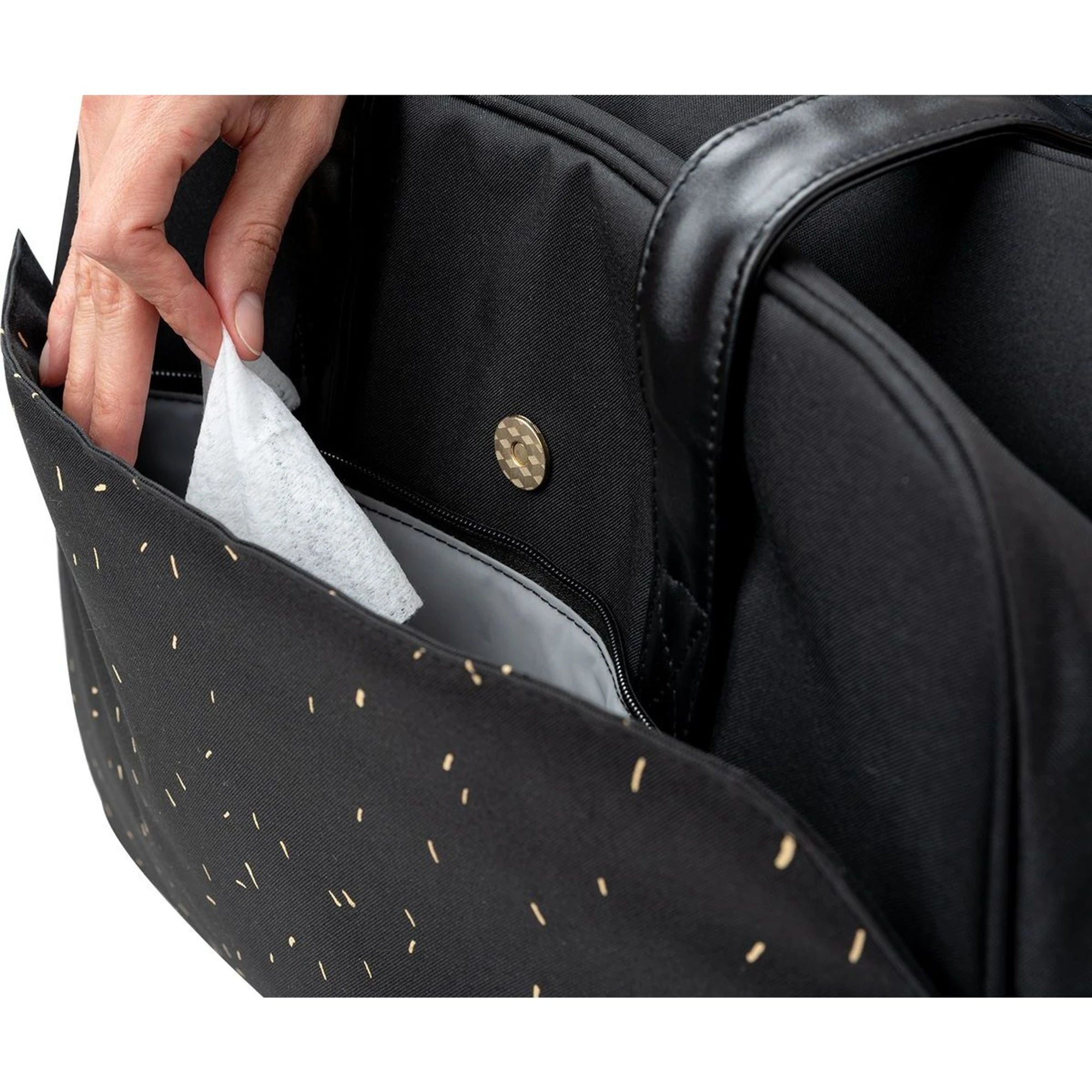 Přebalovací taška černé barvy si na chaos nehraje – přehledně urovná a udrží veškeré potřebné příslušenství pro miminko.