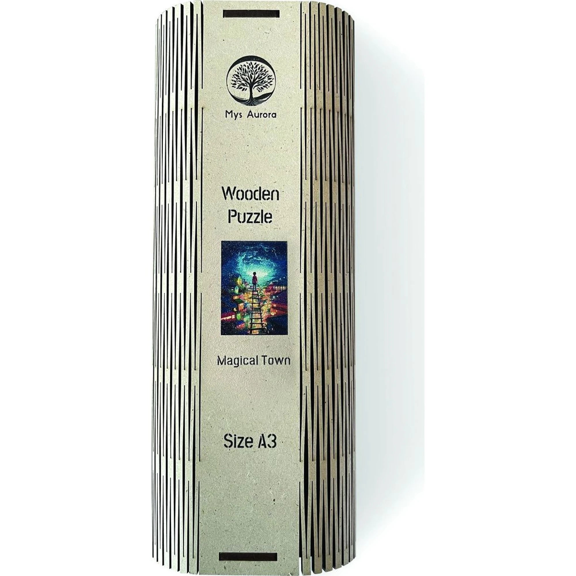 Magické město je tématem dřevěného puzzle obrázku, který malí stavitelé poskládají z připravených dílků – klik, klak a jede se!