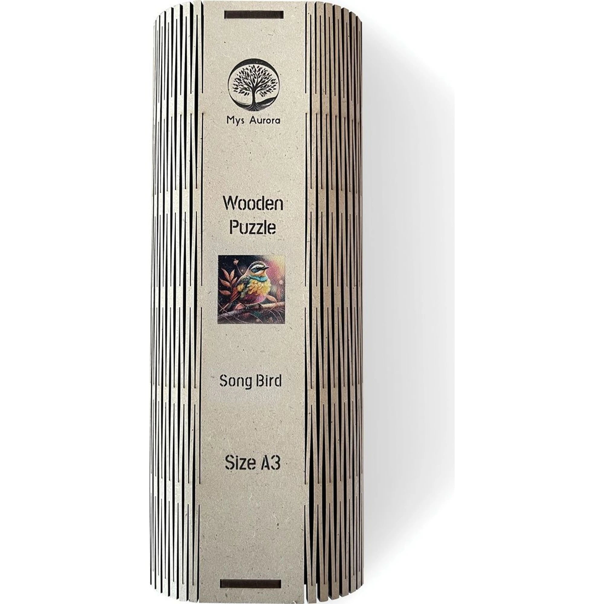 Zpěvný ptáček je hvězdou dřevěného puzzle obrázku, který si děti složí z připravených dílků – zábava, co ladí do posledního peříčka.