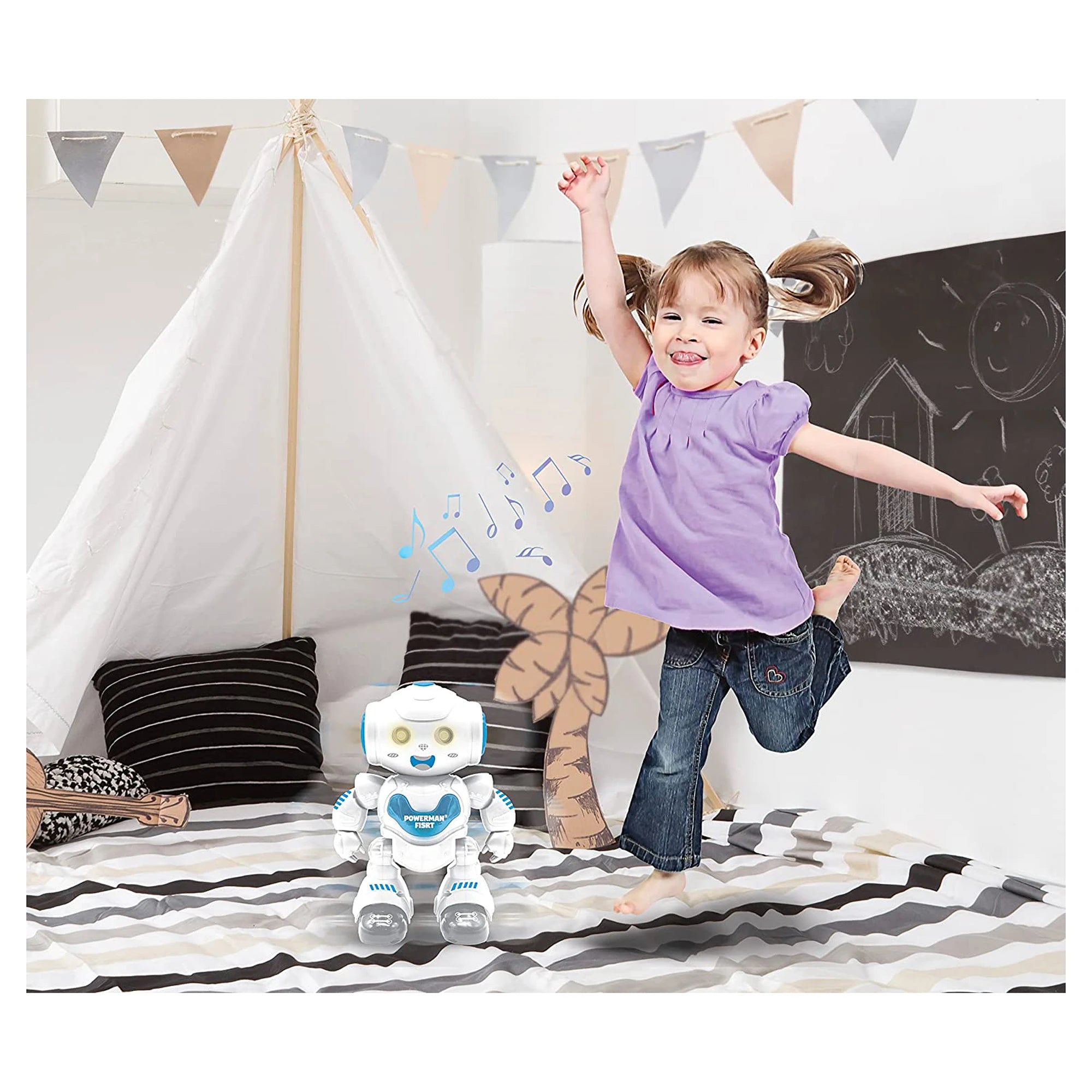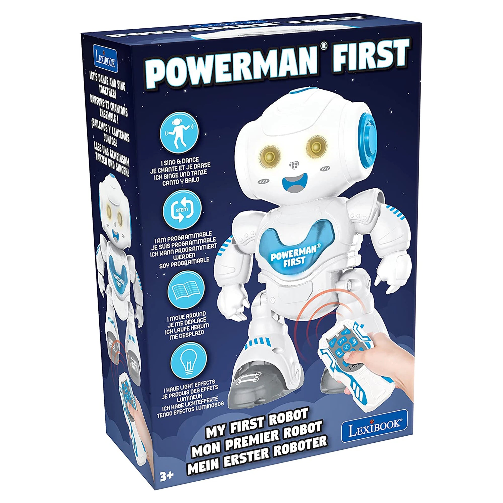 POWERMAN® First – roztomilý člen rodiny robotů, který baví i učí. Měří 21 cm, bliká, hraje a dává o sobě vědět zvukovými a světelnými efekty. Pro děti od 3 let je to parťák k nezaplacení. Se dálkovým ovládáním krouží po pokoji vpřed, vzad, vlevo i vpravo a když spustí hudbu a tanec, zvedne ze židle i plyšáky. Díky programovací funkci si malí choreografové naklikají nové tance do sekvencí, které robot přesně předvede. A jeho ohebné klouby? Rozsah pohybu jak na dětské diskotéce – zklamání nehrozí.