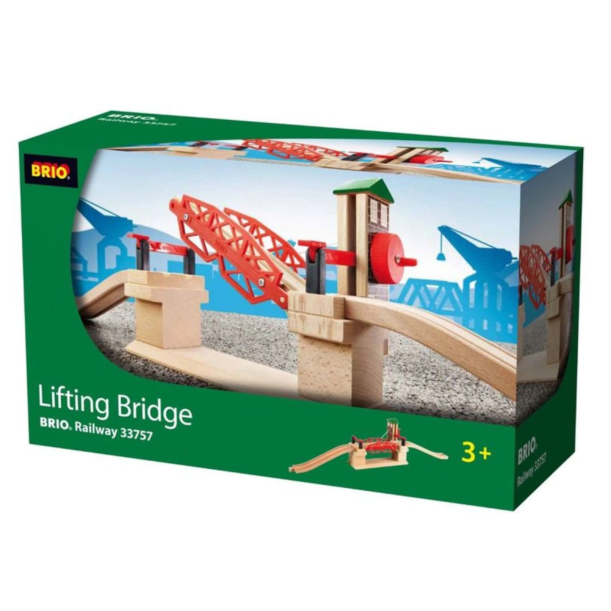 Zvedací železniční most je dalším parádním prvkem pro doplnění stávající vláčkodráhy. Kompatibilní s dalšími dřevěnými dráhami Brio. Zvedání mostu je mechanické – čistá paráda bez kudrlinek.