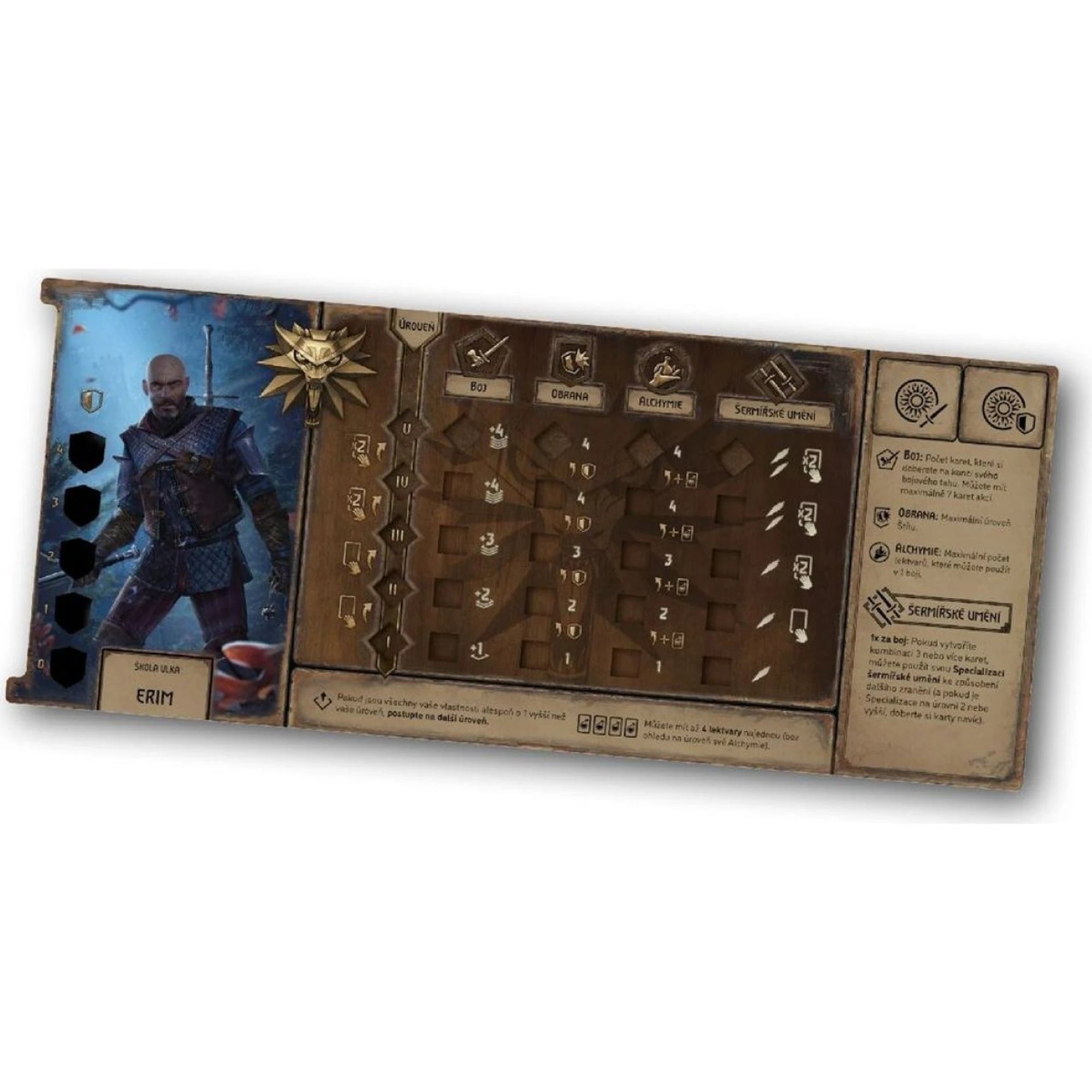 • herní plán, 5 panelů hráčů, 5 figurek zaklínačů