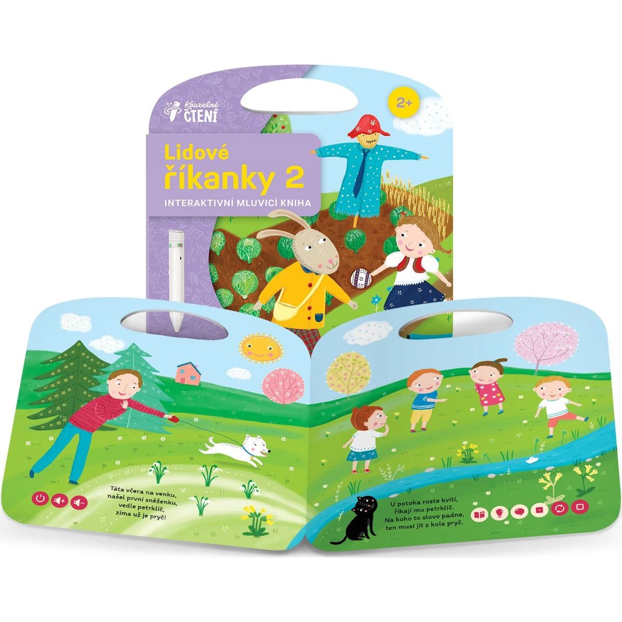 První říkanky mohou děti trénovat s interaktivním perem. Při doteku pera na stránkách knihy ožijí slova, věty i zvuky, tématicky naladěné na lidovou tvořivost. Holčičky a kluci se tak zábavnou formou seznamují s interaktivním způsobem výuky.