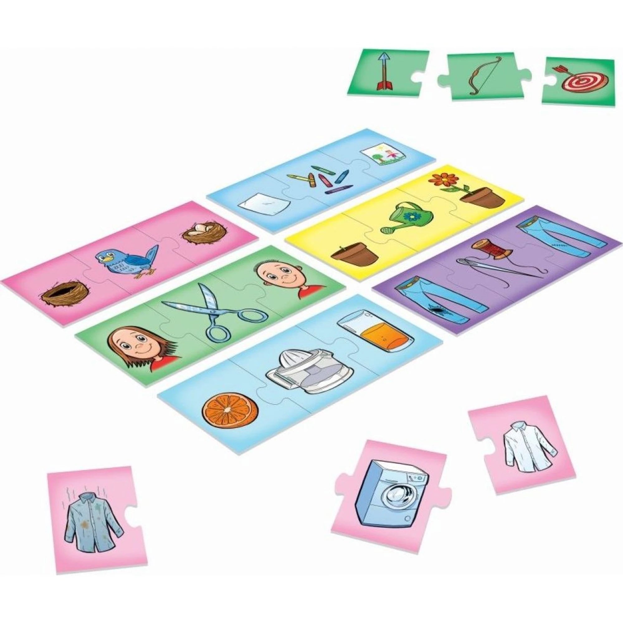 Ve 36 rozložených kartičkách se hledá vždy trojice – 3 dílků, které k sobě patří. Nalezené kartičky pak děti seřadí tak, aby znázorněný děj šel správně časově za sebou. Tvar dílků napovídá, takže skládání jde jako po másle – a já Fantarius tleskám pořádkumilovnému příběhu.