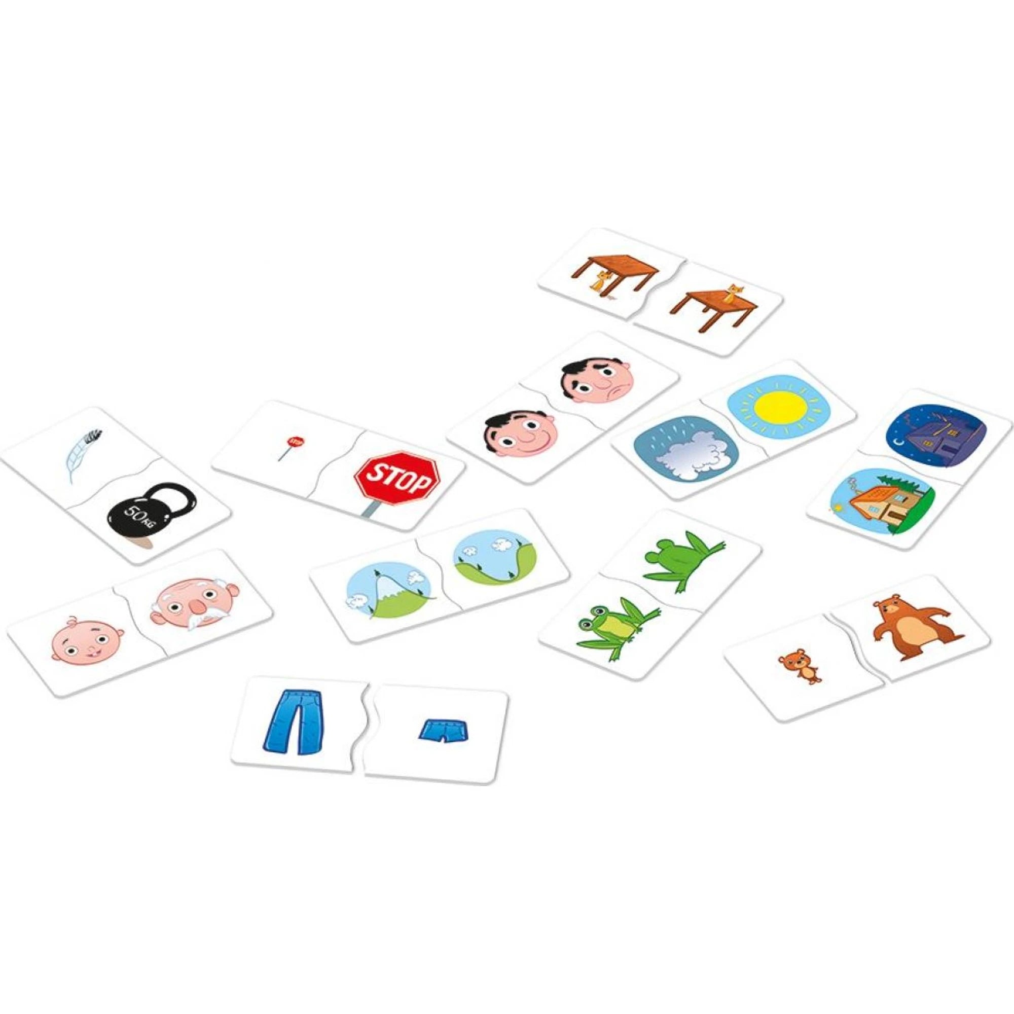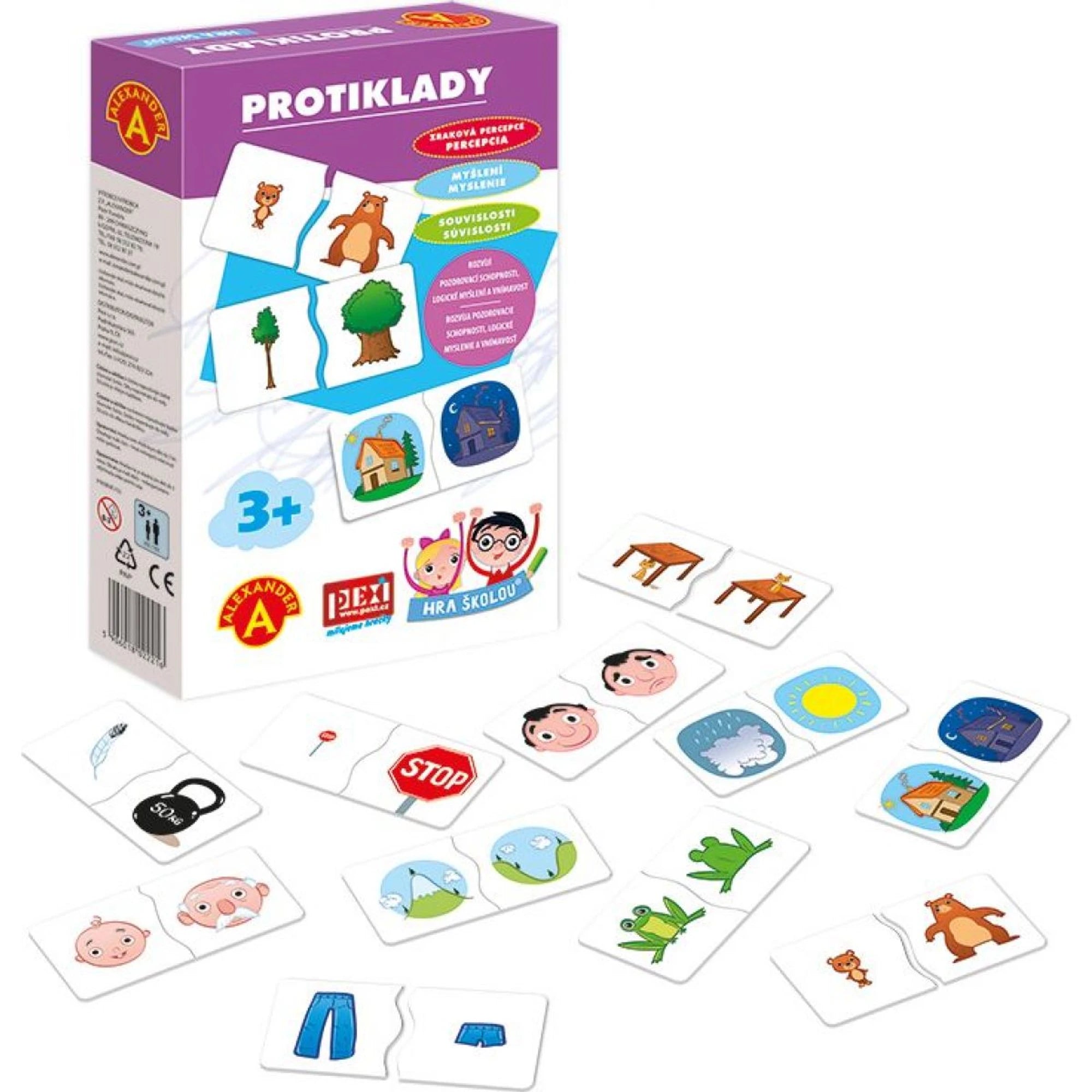 Protiklady jsou tady hvězdami stolní hry: děti zamíchají kartičky a pak hledají a spojují správné dvojice protikladů – např. světlý a tmavý, nebo malý a velký.