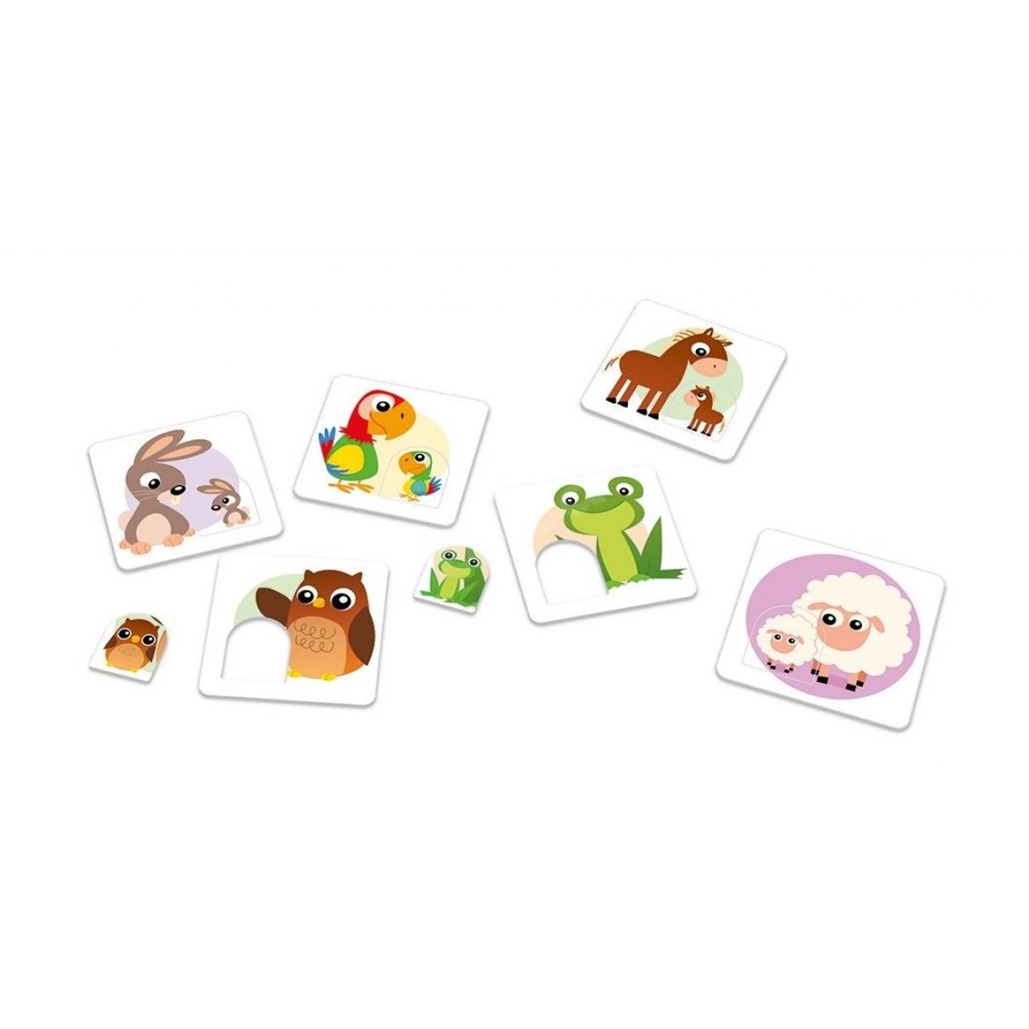 Úkolem dětí je správně nacházet a přiřazovat dvojice zvířátek, které k sobě patří. Pak šup s malými dílky do výřezů v destičkách. Obrázky se hezky pojmenovávají a slovní zásoba roste rychleji než bubliny v limonádě.