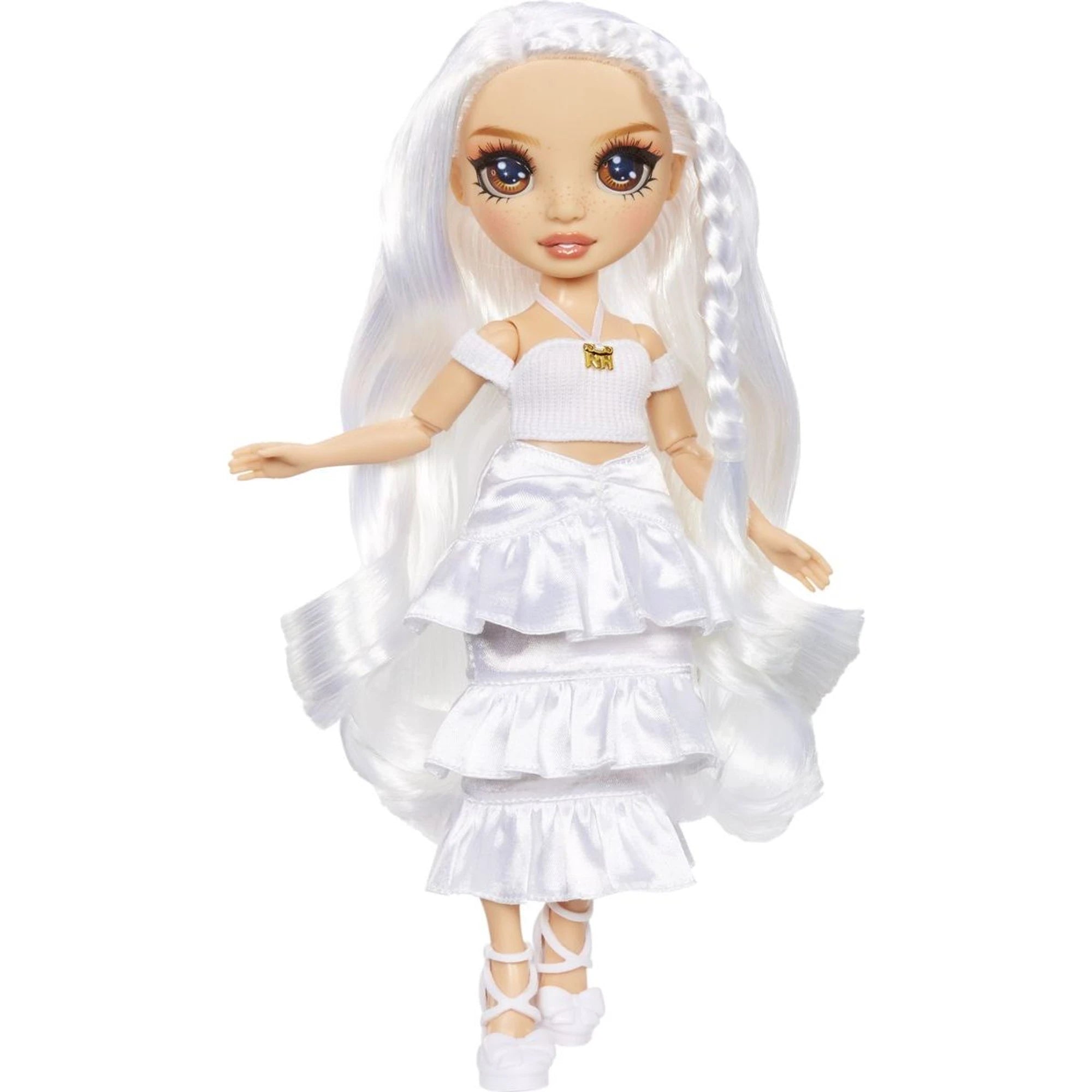 Rainbow High s hnědýma očima, bílá múza, která čeká, až ji fantazie vybarví do všech duhových tónů.