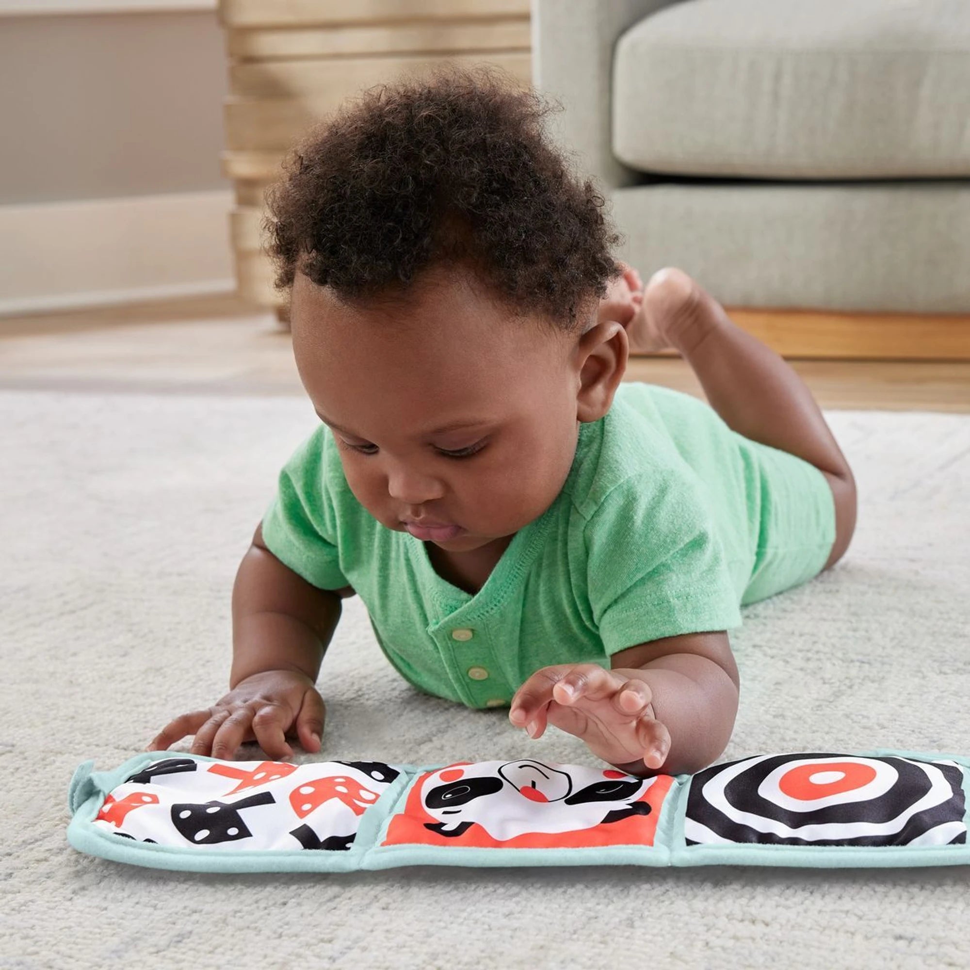 První knížečka má čtyři oboustranné stránky – tedy osm malých dobrodružství. Vysoce kontrastní vzory jsou ideální pro nejmenší děti, které ještě nemají plně vyvinuté barevné vidění. Dotekem různých textur si děti posilují hmatové vnímání. V bezpečném zrcátku se mohou s chutí zkoumat.