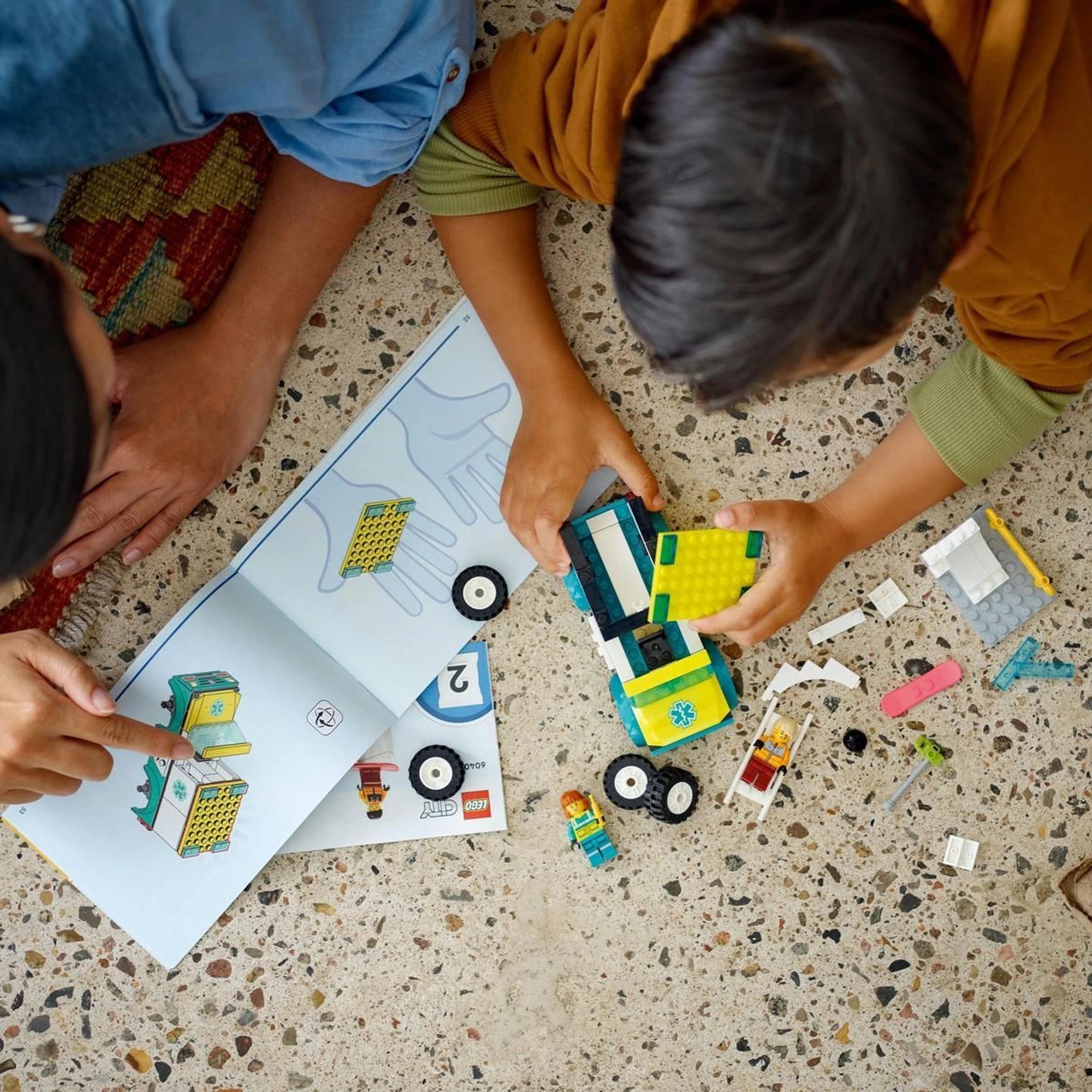 Terénní sanitku si malí hrdinové postaví z parádních dílků stavebnice Lego City – připravenou vyrazit do akce dřív, než se rozsvítí maják.